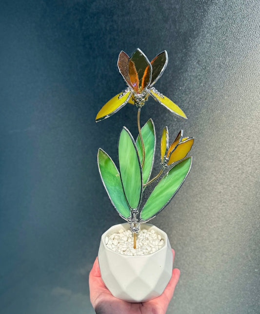 .Iris Yellow lemon Stained Glass Artisan Flower, Botanical Table Decor