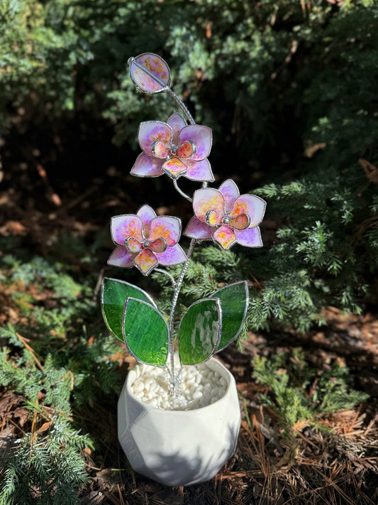 .Handpainted Orchid in a pot, 3 flowers Botanical Stained Glass Modern Art Decor