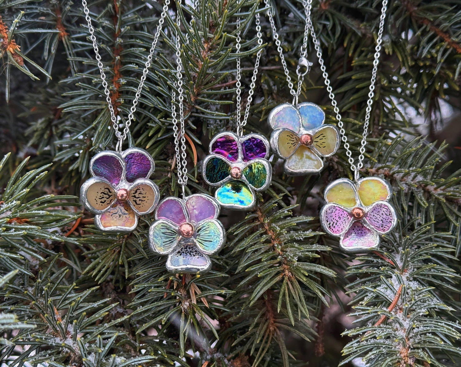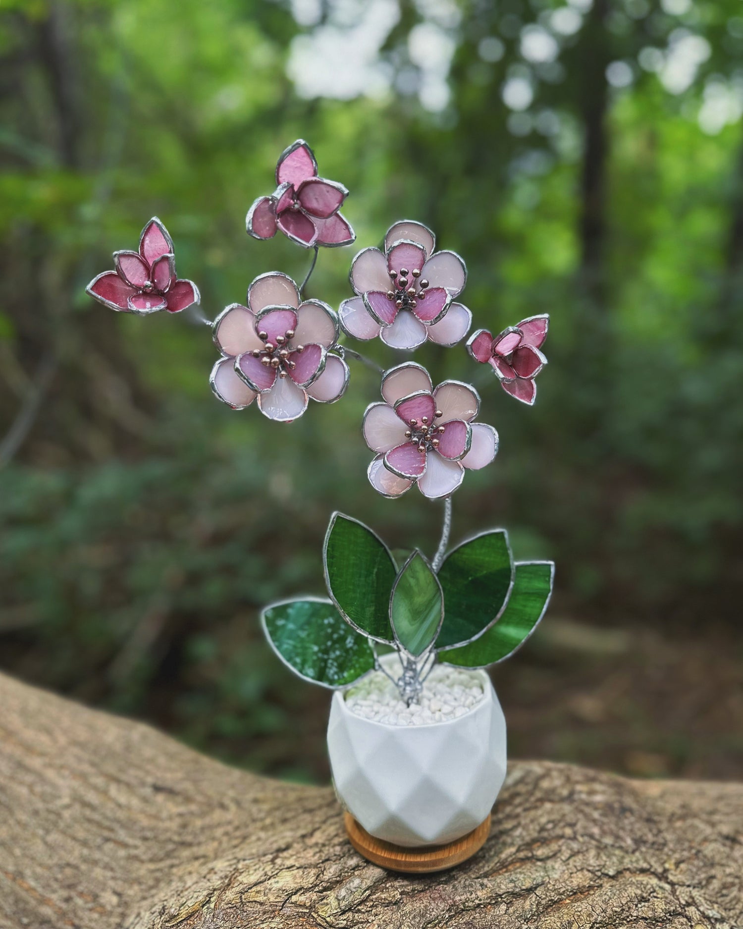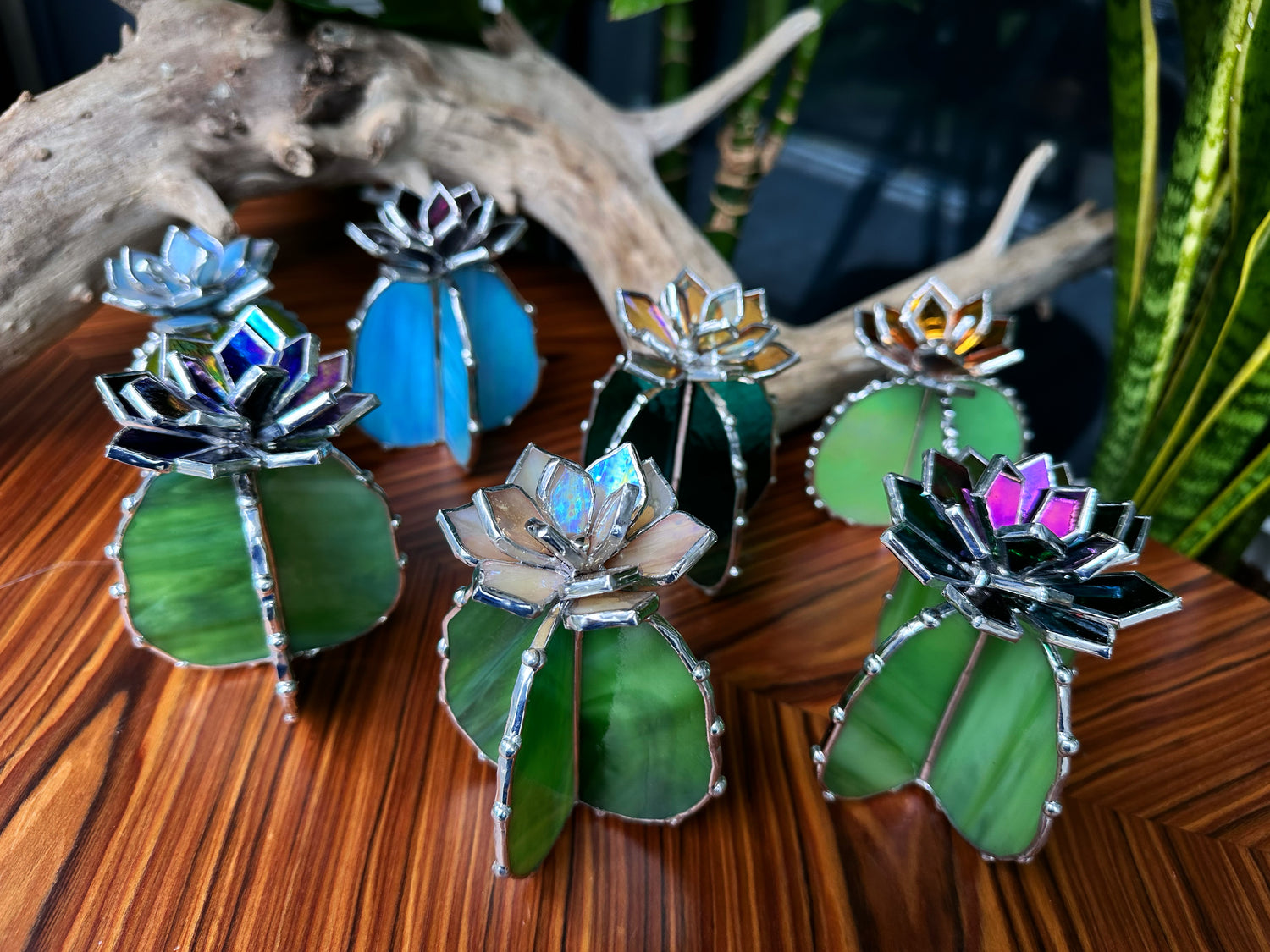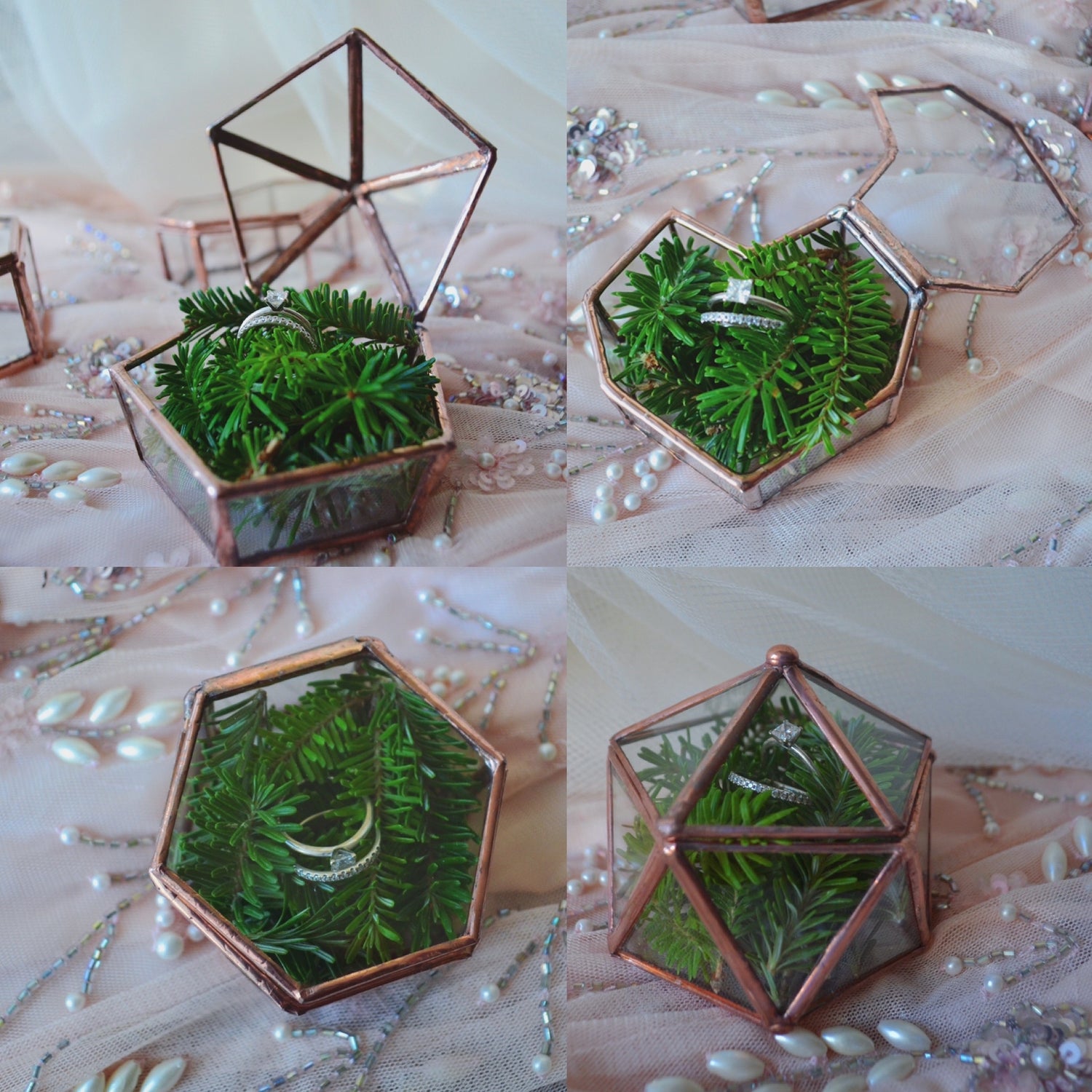 Geometric glass terrariums created in stained glass Tiffany technique and filled with...