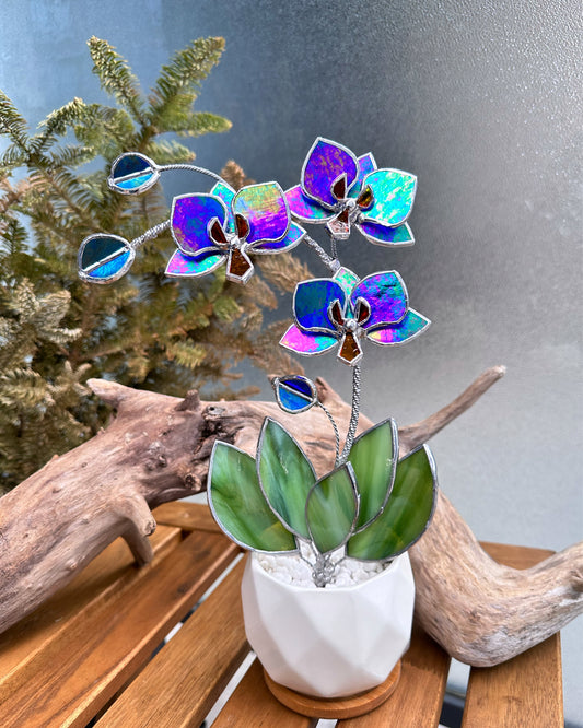" . Indigo iridescent Orchid 3 flowers with pot” Stained glass tropical flower 3D, Sun catcher, Table plant, Garden stick, Outdoor and gardening decor