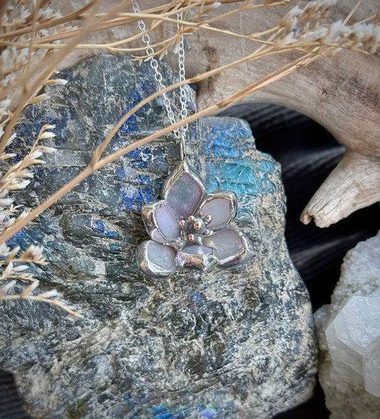" . Necklace Orchid Mauve iridescent ” Stained glass tropical flower 3D, art jewelry
