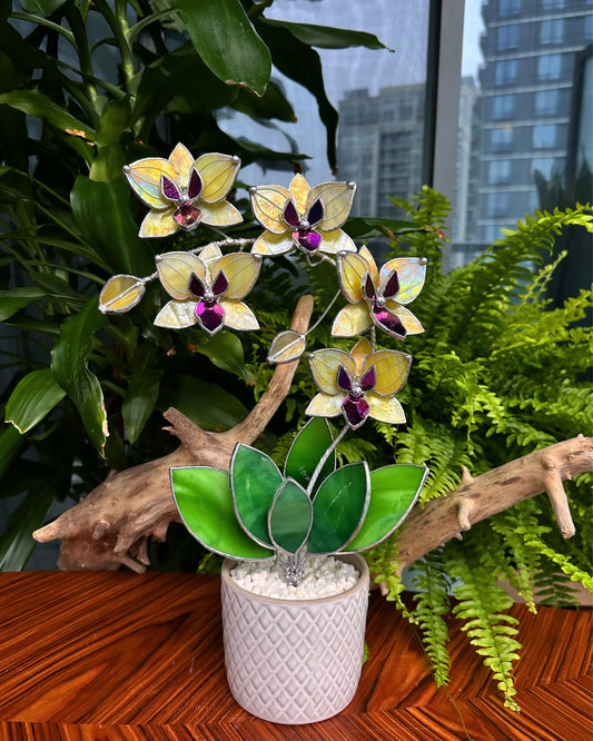 " . Lemon yellow iridescent Orchid 3 flowers with pot” Stained glass tropical flower 3D, Sun catcher, Table plant, Garden stick, Outdoor and gardening decor