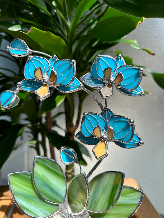 " . Tiffany turquoise Orchid 3 flowers with pot” Stained glass tropical flower 3D, Sun catcher, Table plant, Garden stick, Outdoor and gardening decor