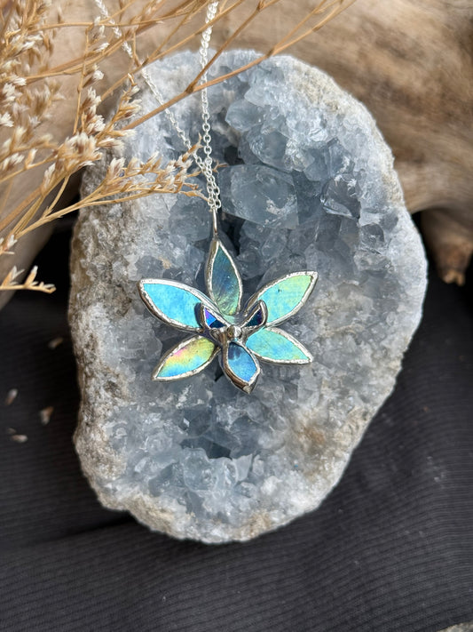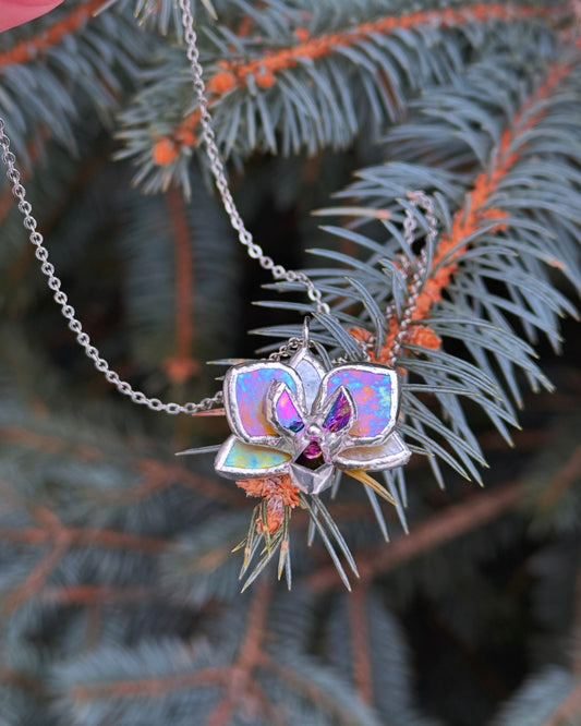 " . Necklace Orchid Indigo iridescent” Stained glass tropical flower 3D, art jewelry