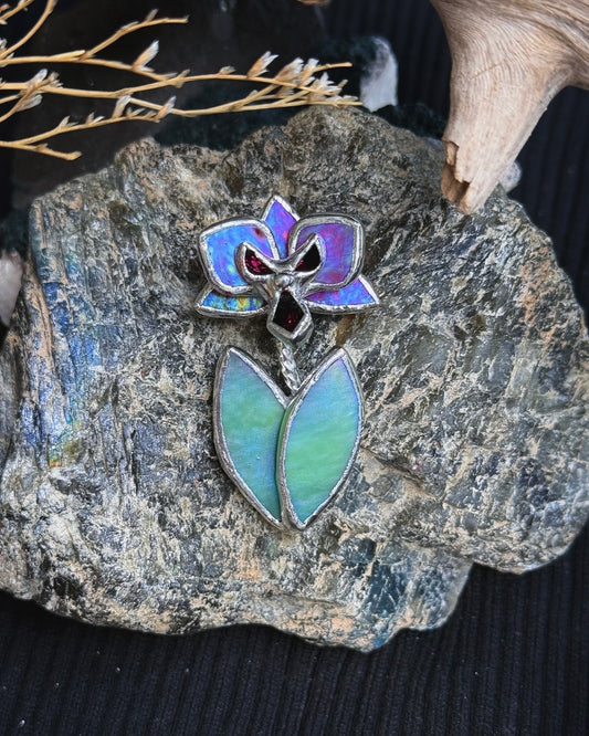 " . Brooch Orchid Berry Red iridescent” Stained glass tropical flower 3D