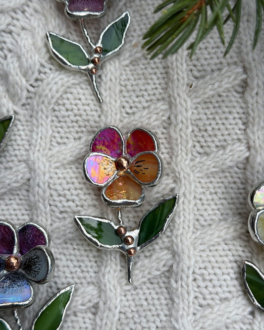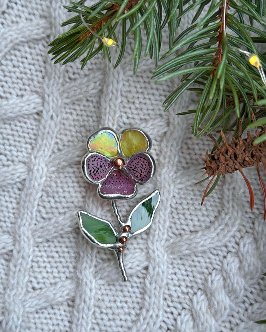" . Brooch Pansy Flower Yellow irid & pink irid” Stained glass tropical flower 3D, art jewelry