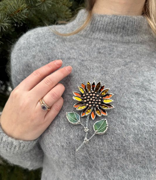 " . Sunflower Brooch Gold & Amber Silwercoat” Stained glass tropical flower 3D