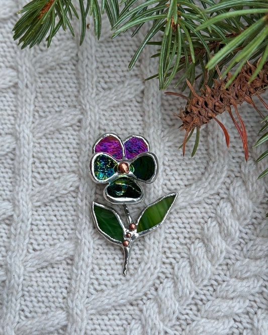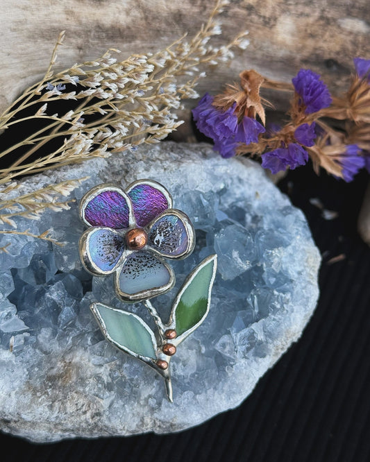 " . Brooch Pansy Flower Mauve irid & pale blue irid” Stained glass tropical flower 3D, art jewelry