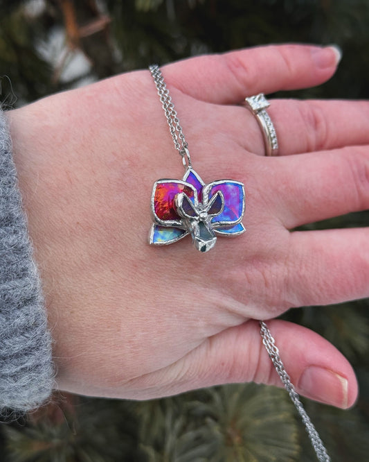 " . Necklace Orchid Red transparent iridescent” Stained glass tropical flower 3D, art jewelry