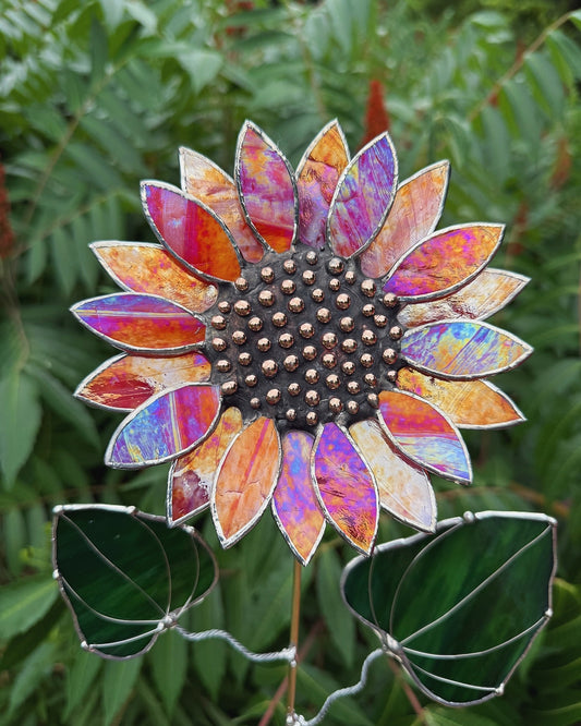 " . Sunflower Red Amber iridescent", stained glass tropical flower 3D, Sun catcher, Table plant decor, Garden stake, Outdoor and gardening, wedding Christmas gift sale