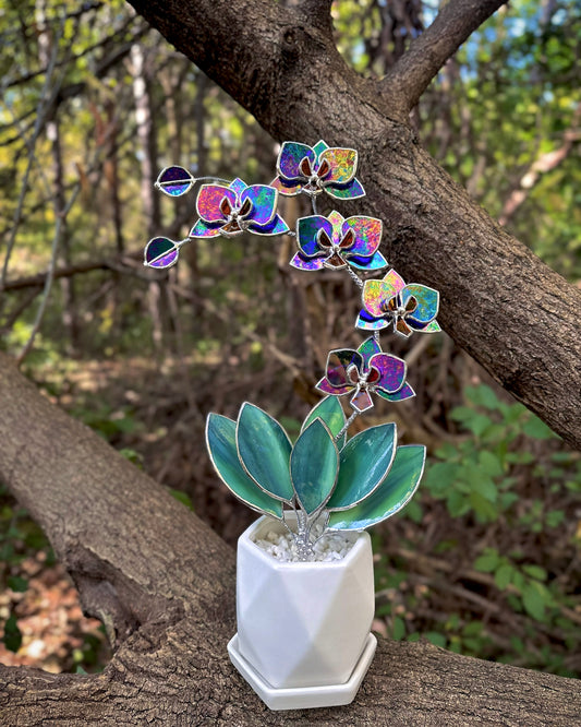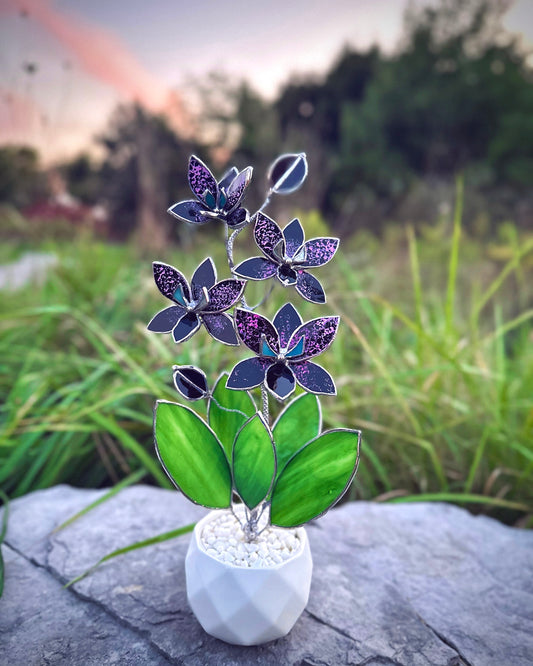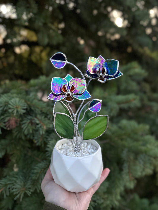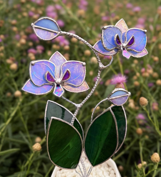" . Amethyst Indigo iridescent Orchid 2 flowers with pot” Stained glass tropical flower 3D, Sun catcher, Table plant decor, Garden stick, Outdoor and gardening decor