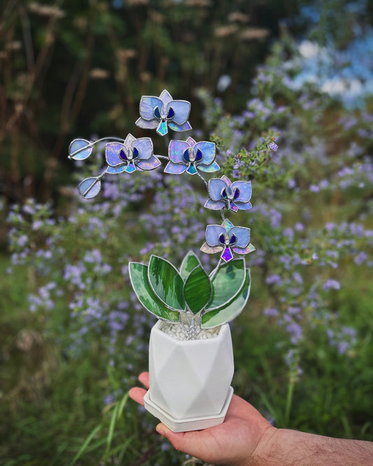 " . Blue Lavender Orchid, 2 flowers with pot” Stained glass tropical flower 3D, Suncatcher, Table plant decor