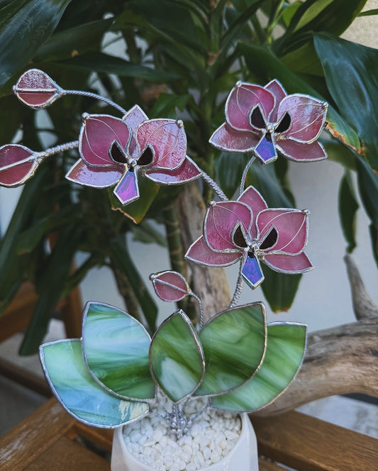 ". Stained glass Orchid Reach Elderberry with pot, 5 flowers, Suncatcher 3D, plant, Wedding Christmas Gift Outdoor and gardening decor