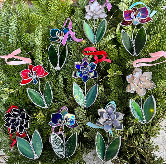 " . Christmas tree ornaments Flower Mix of 3, 5. Stained glass Wall window decor, holiday decorations, lights