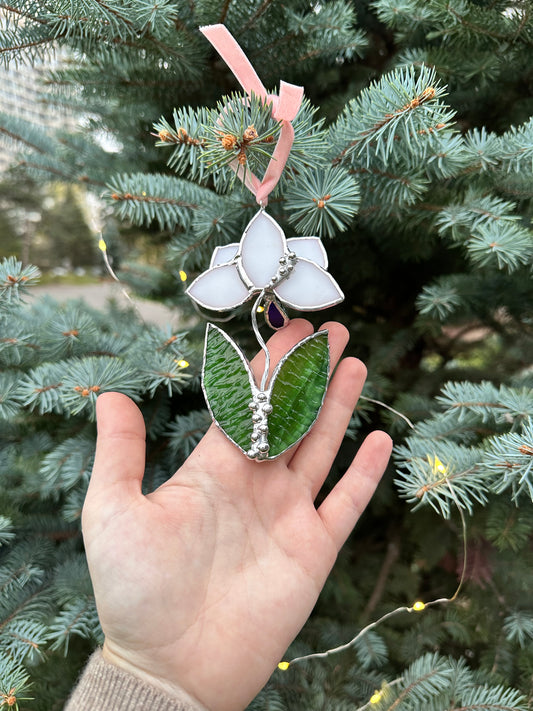 Christmas tree ornament Orchid White pearl. Set of 1, 3, 5, 7, 10. Stained glass Wall window decor, holiday decorations, lights