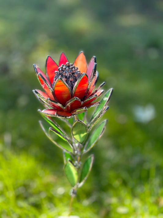 • " . Amber&Red irid Protea Stained glass flower in the pot, tropical 3D Sun catcher, Table plant decor, wedding gift