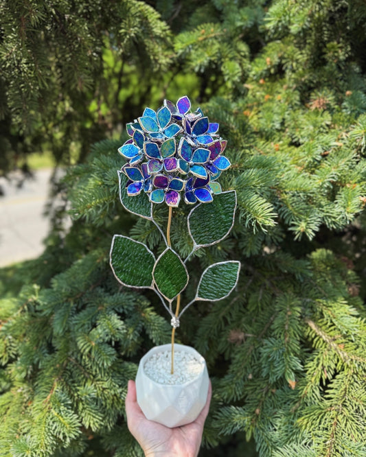 • " . Amethyst blue lavender Hydrangea bunch iridescent in the pot”, Stained glass tropical flower 3D, Sun catcher, Table plant, Garden stick, Outdoor and gardening decor