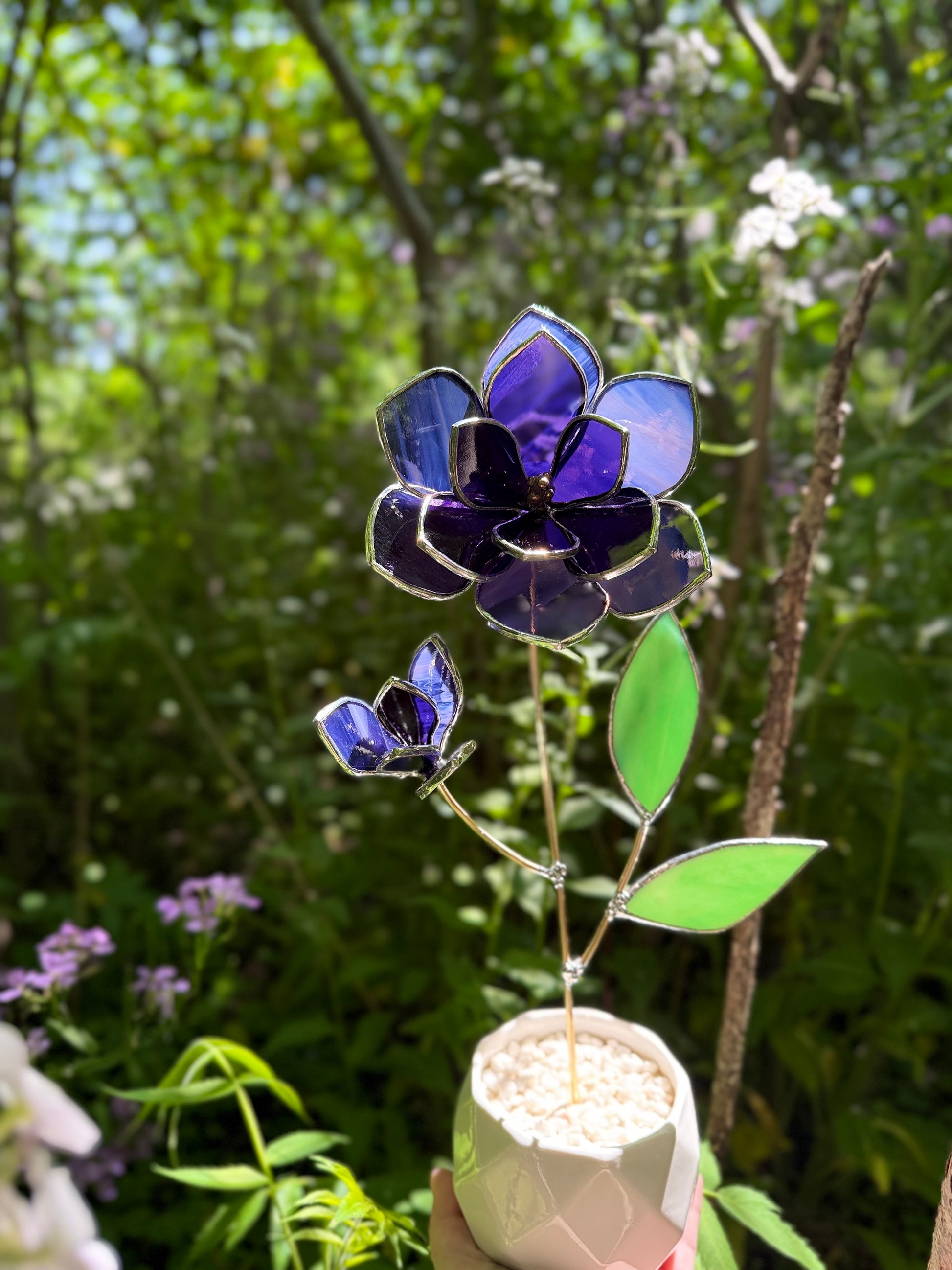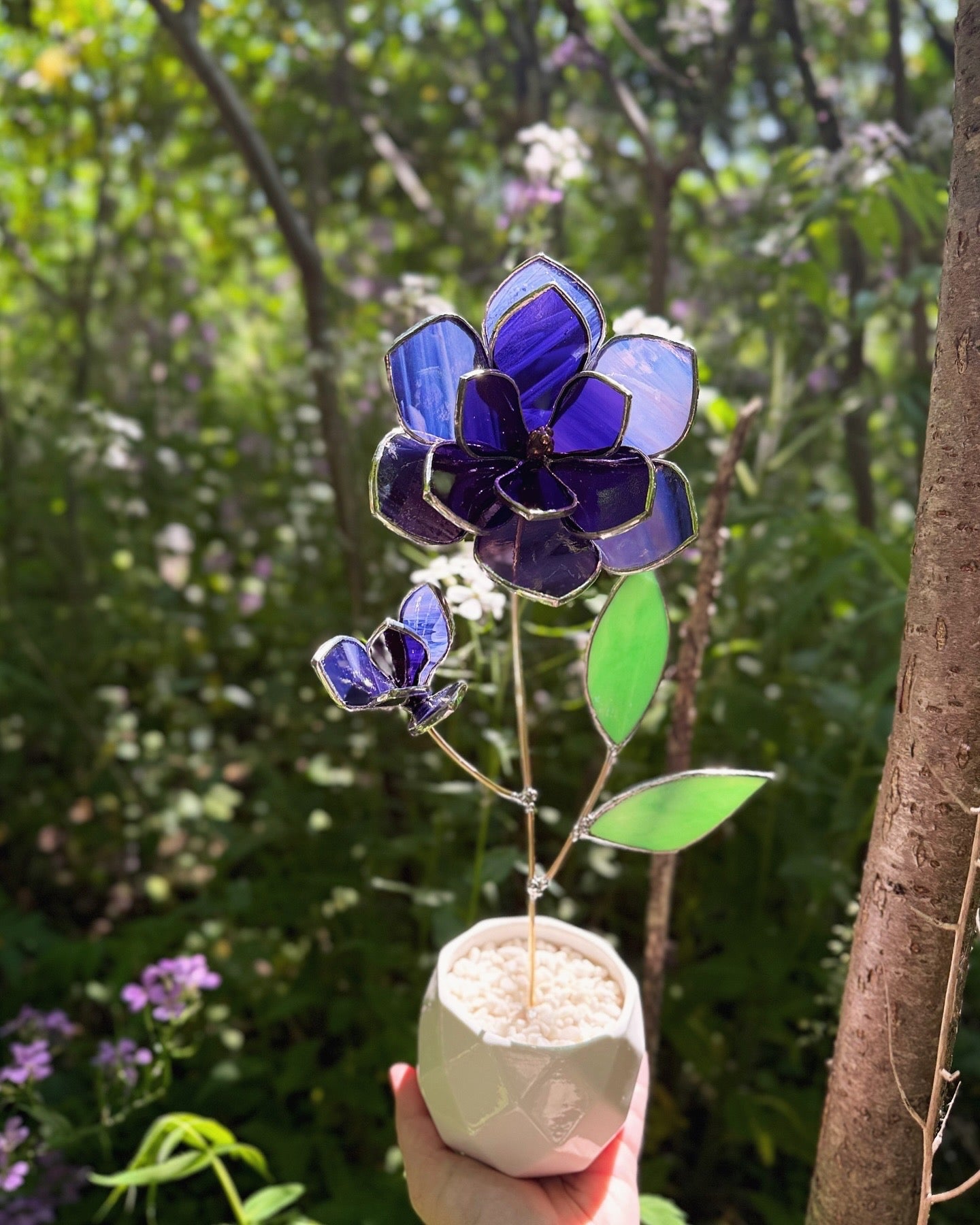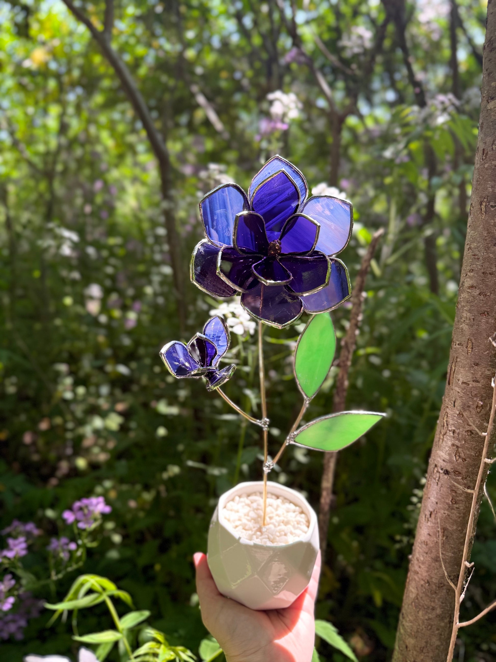 This unique hand crafted with stained glass 3D White iridescent Magnolia Flower made of art glass. Completed with removable ceramic pot. The original design.