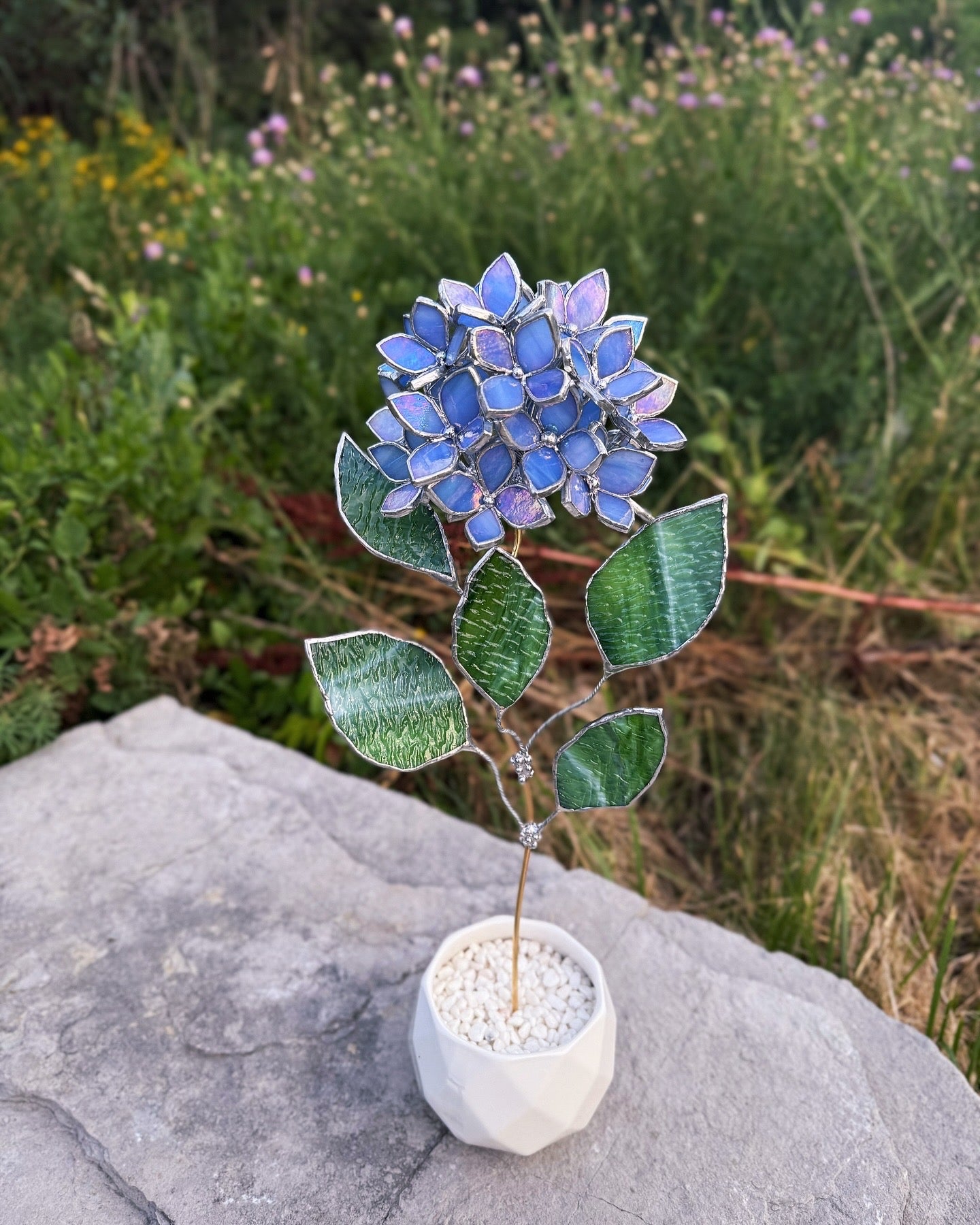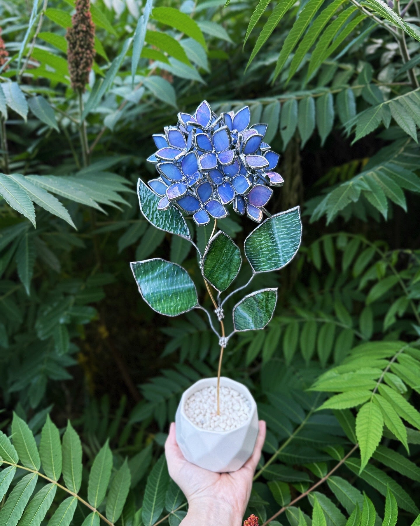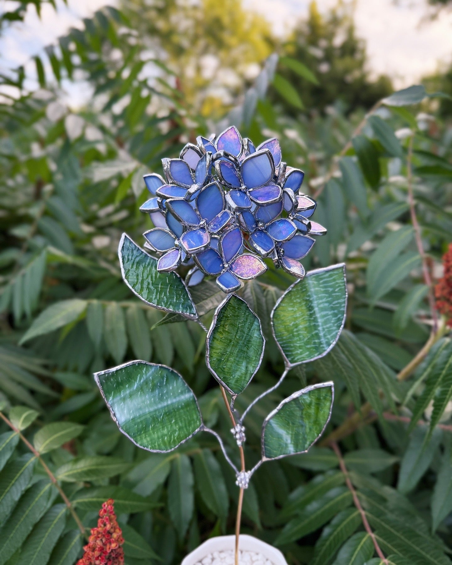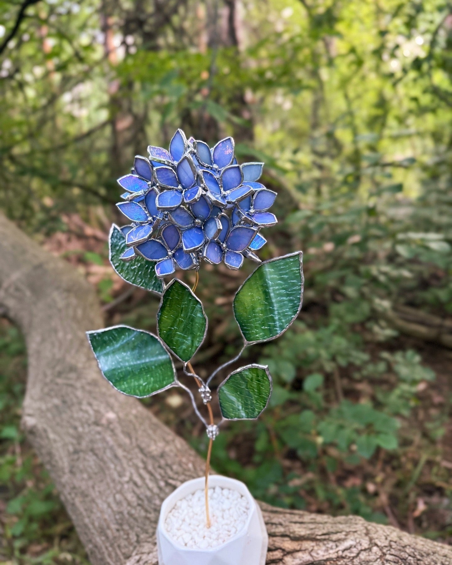 " . Amethyst blue lavender Hydrangea bunch iridescent in the pot”, Stained glass tropical flower 3D, Sun catcher, Table plant, Garden stick, Outdoor and gardening decor