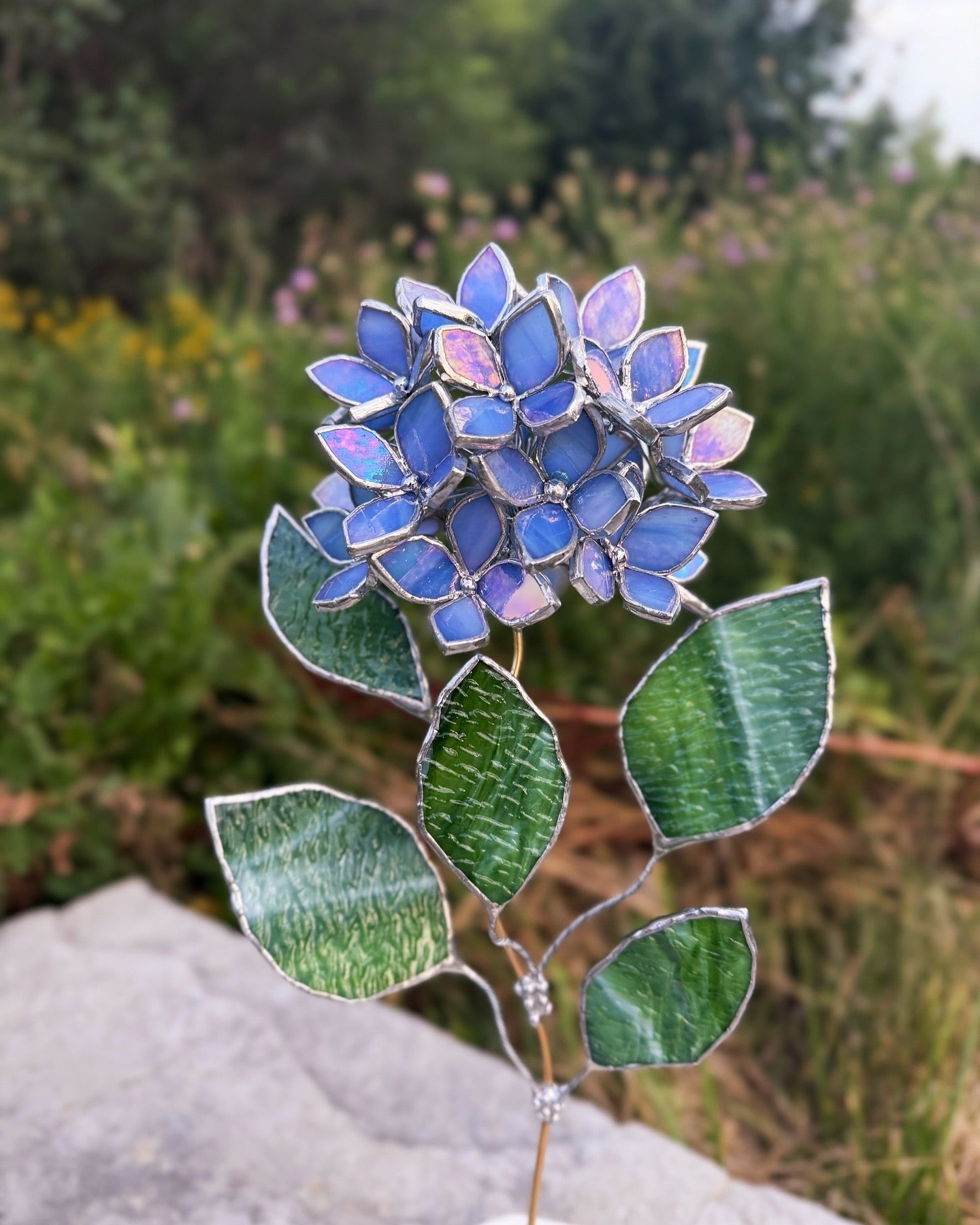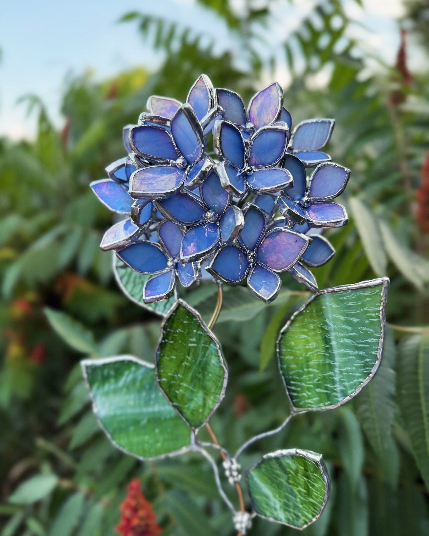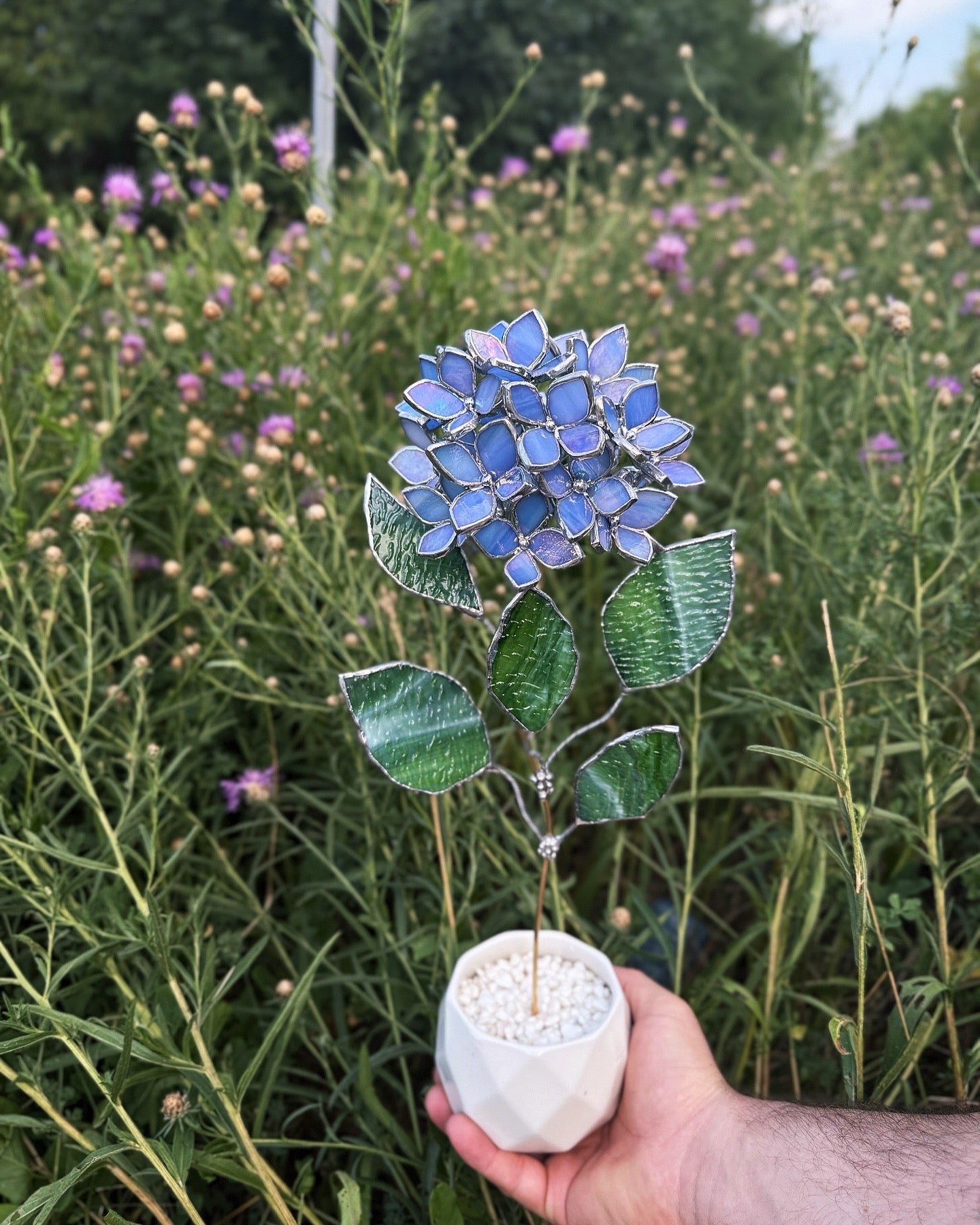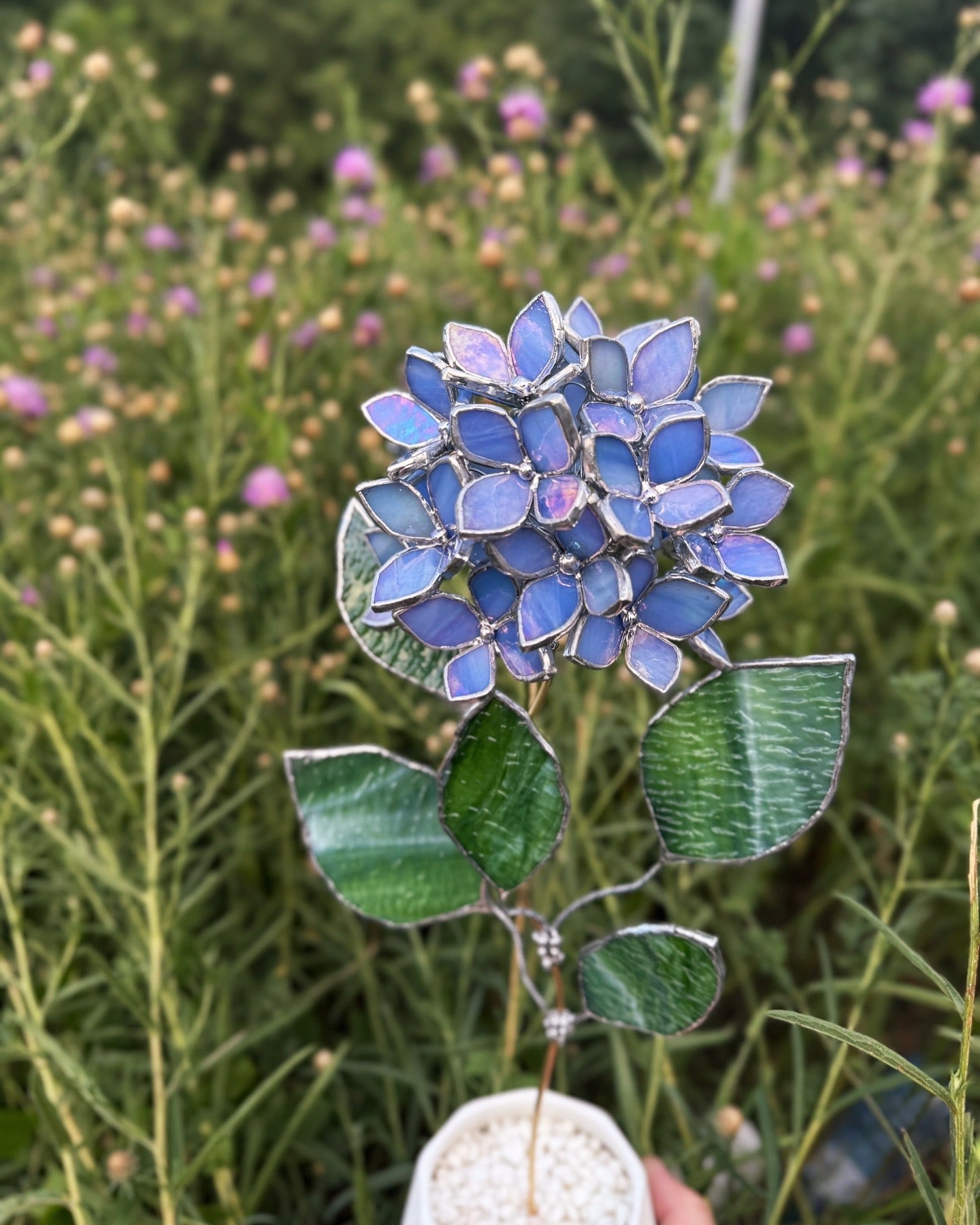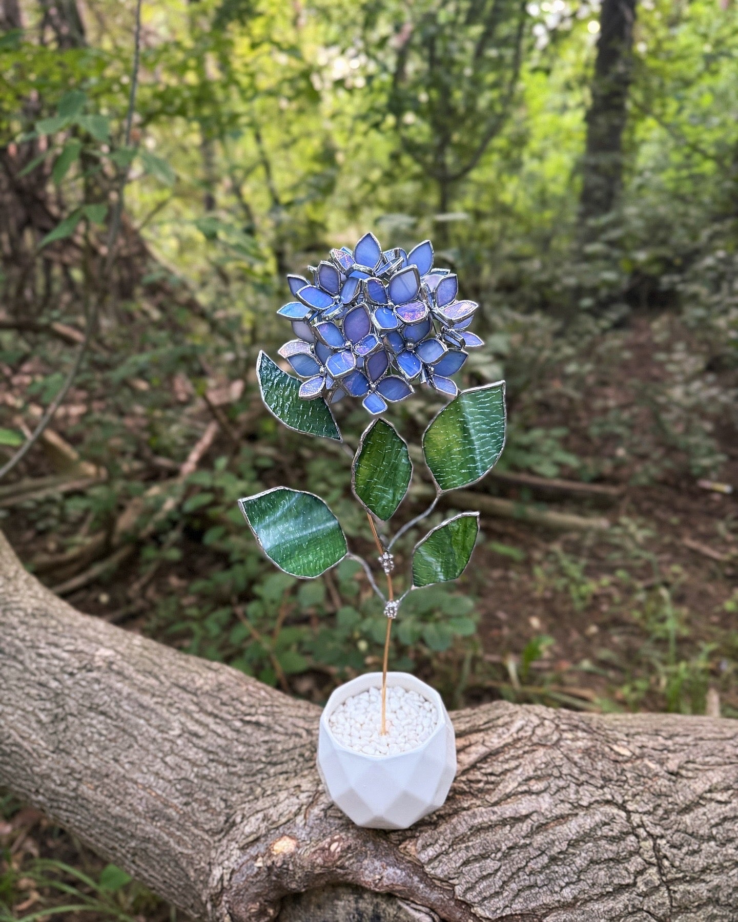 " . Amethyst blue lavender Hydrangea bunch iridescent in the pot”, Stained glass tropical flower 3D, Sun catcher, Table plant, Garden stick, Outdoor and gardening decor