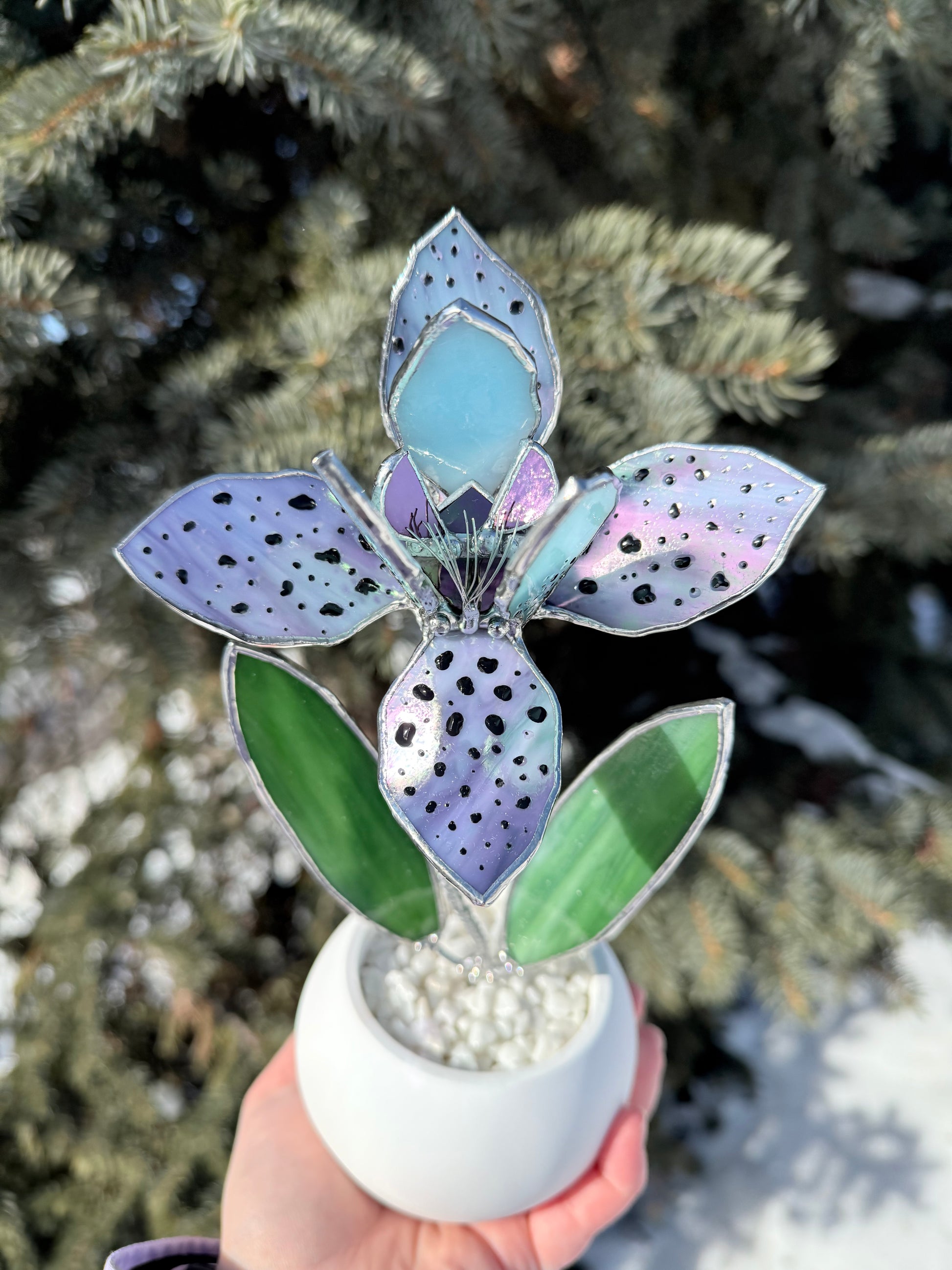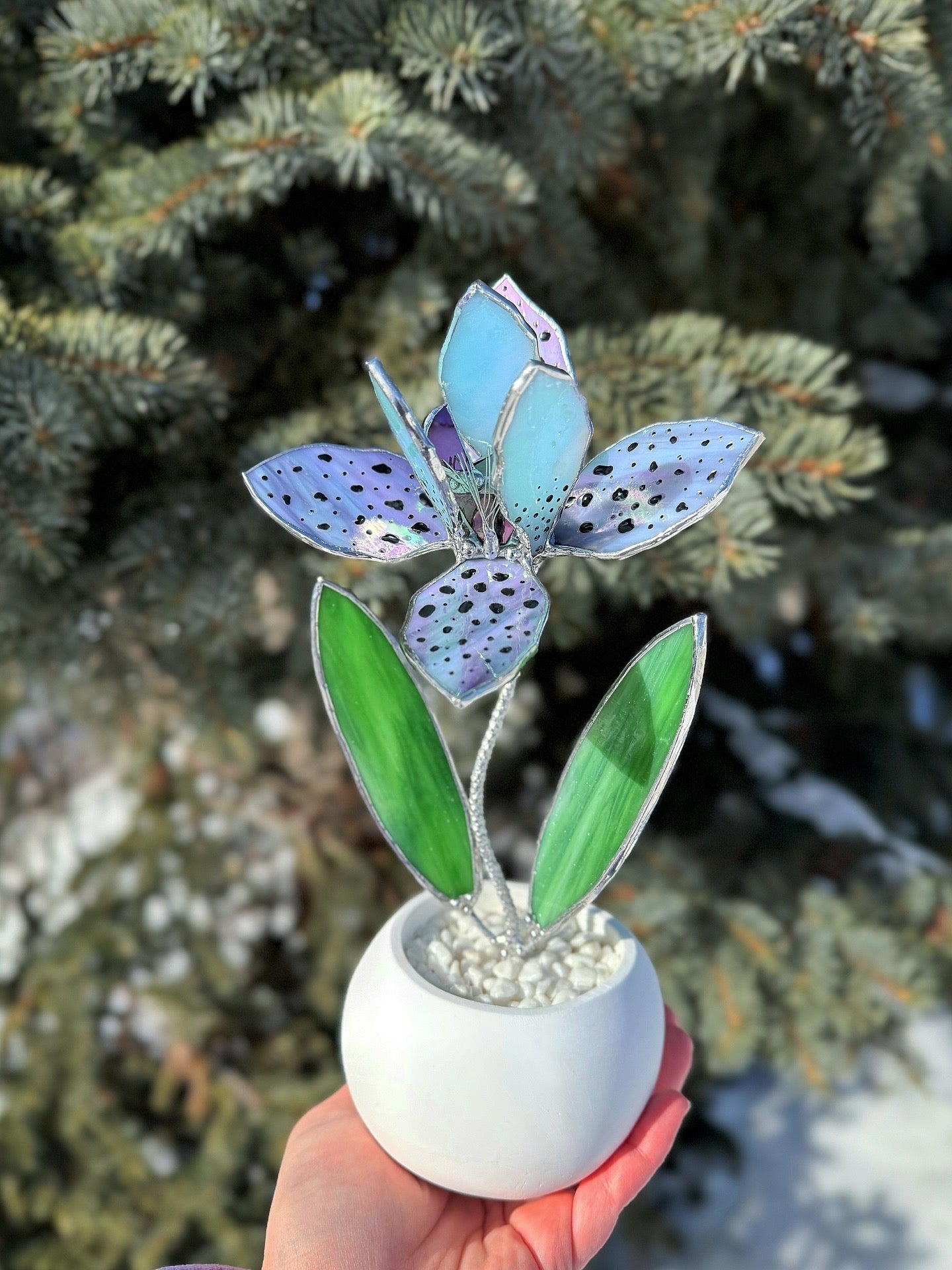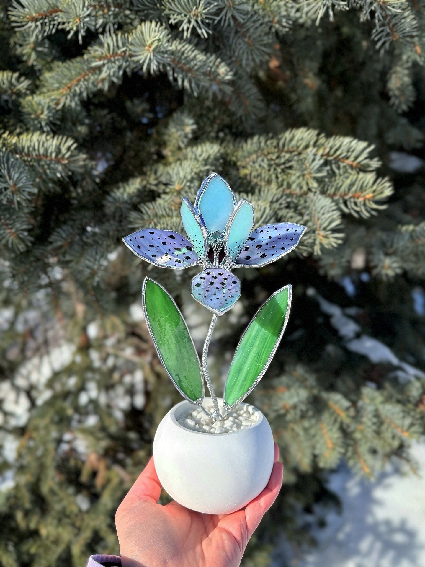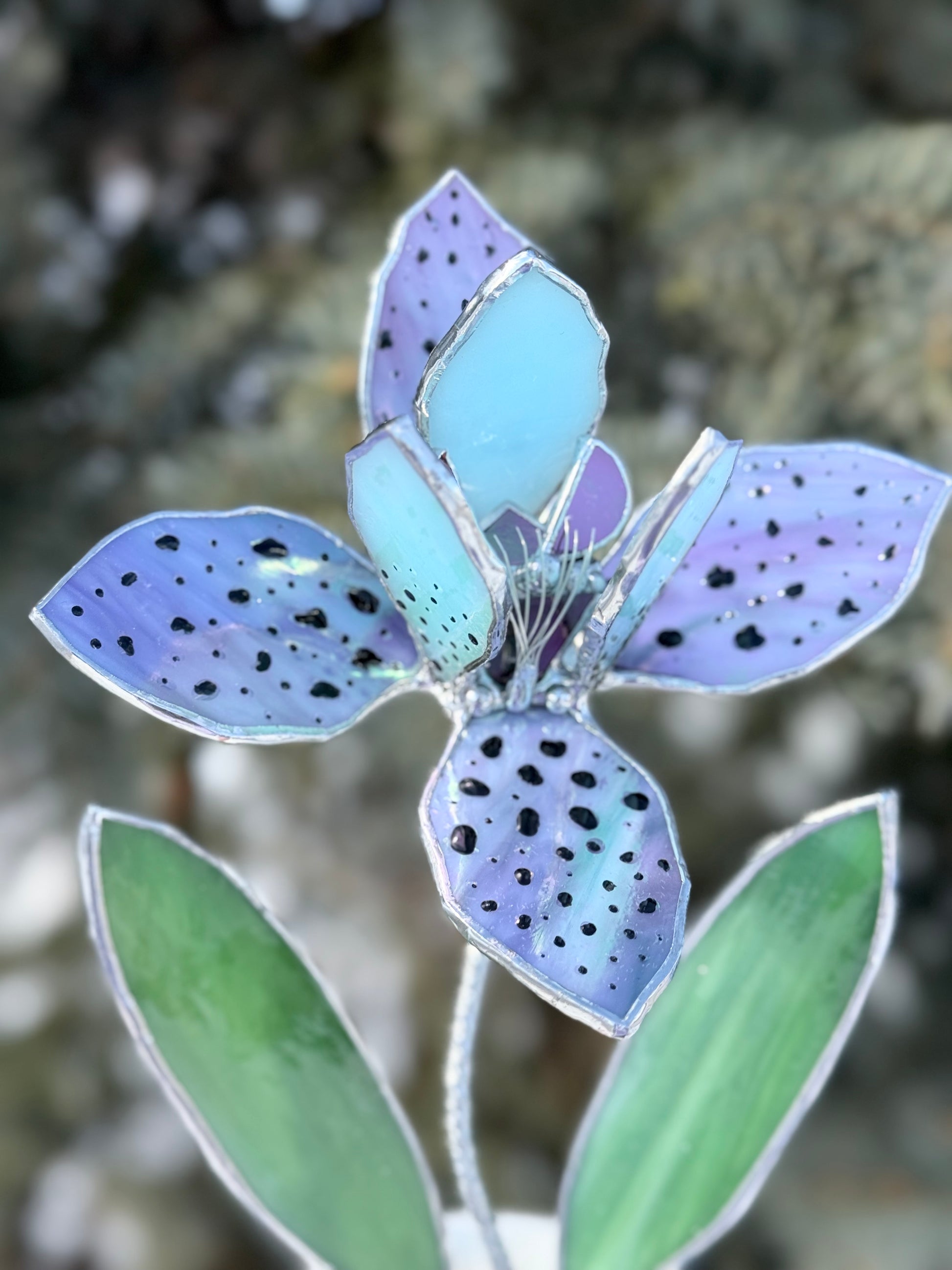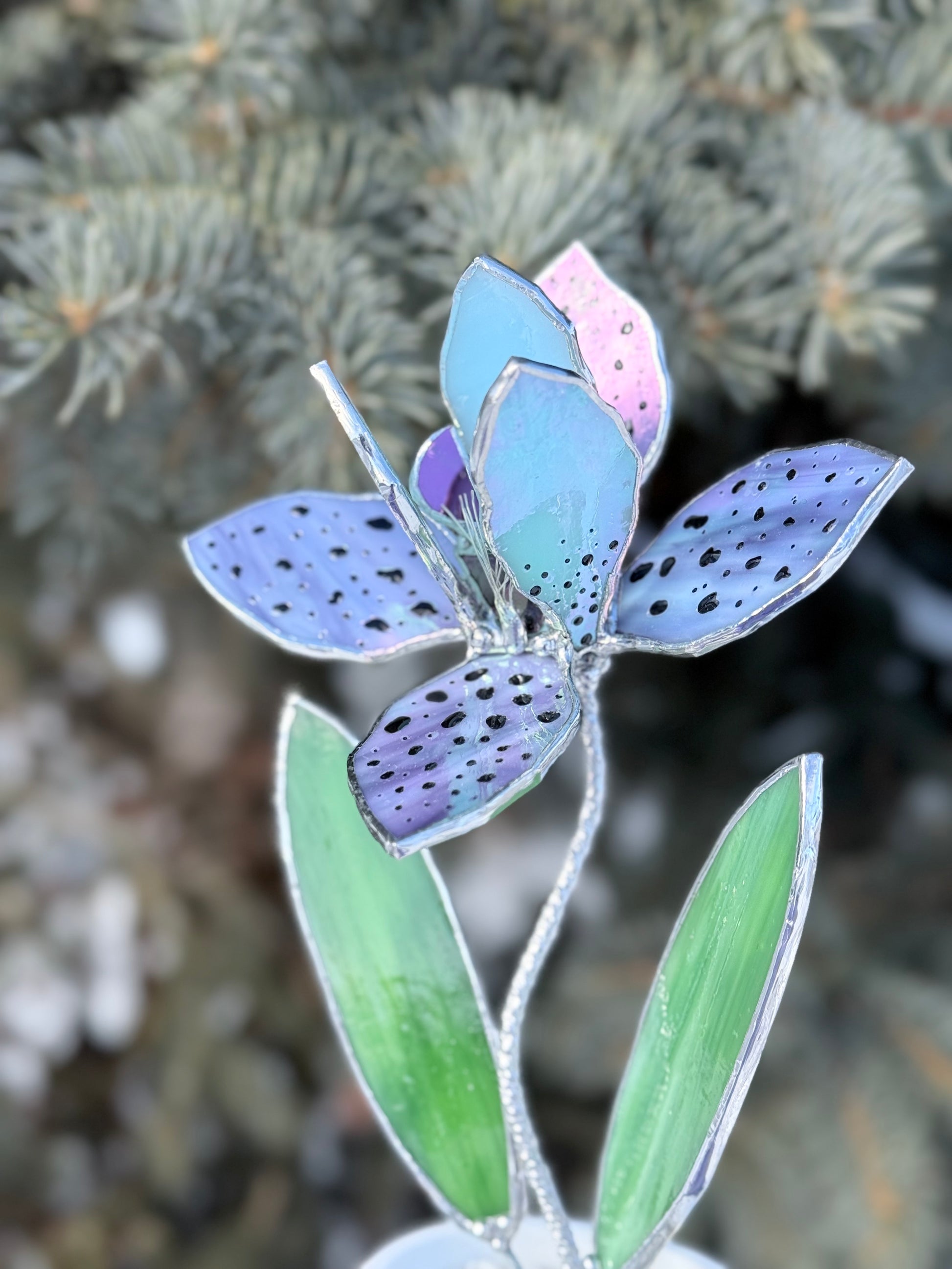 This handcrafted stained glass orchid sculpture reinterprets the exotic orchid in a refined, contemporary form. Soft lavender tones, delicate speckled petals, and vibrant green leaves create a sculptural silhouette that feels both graceful and modern.