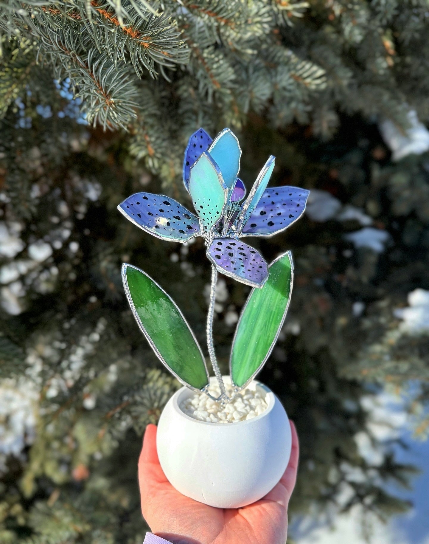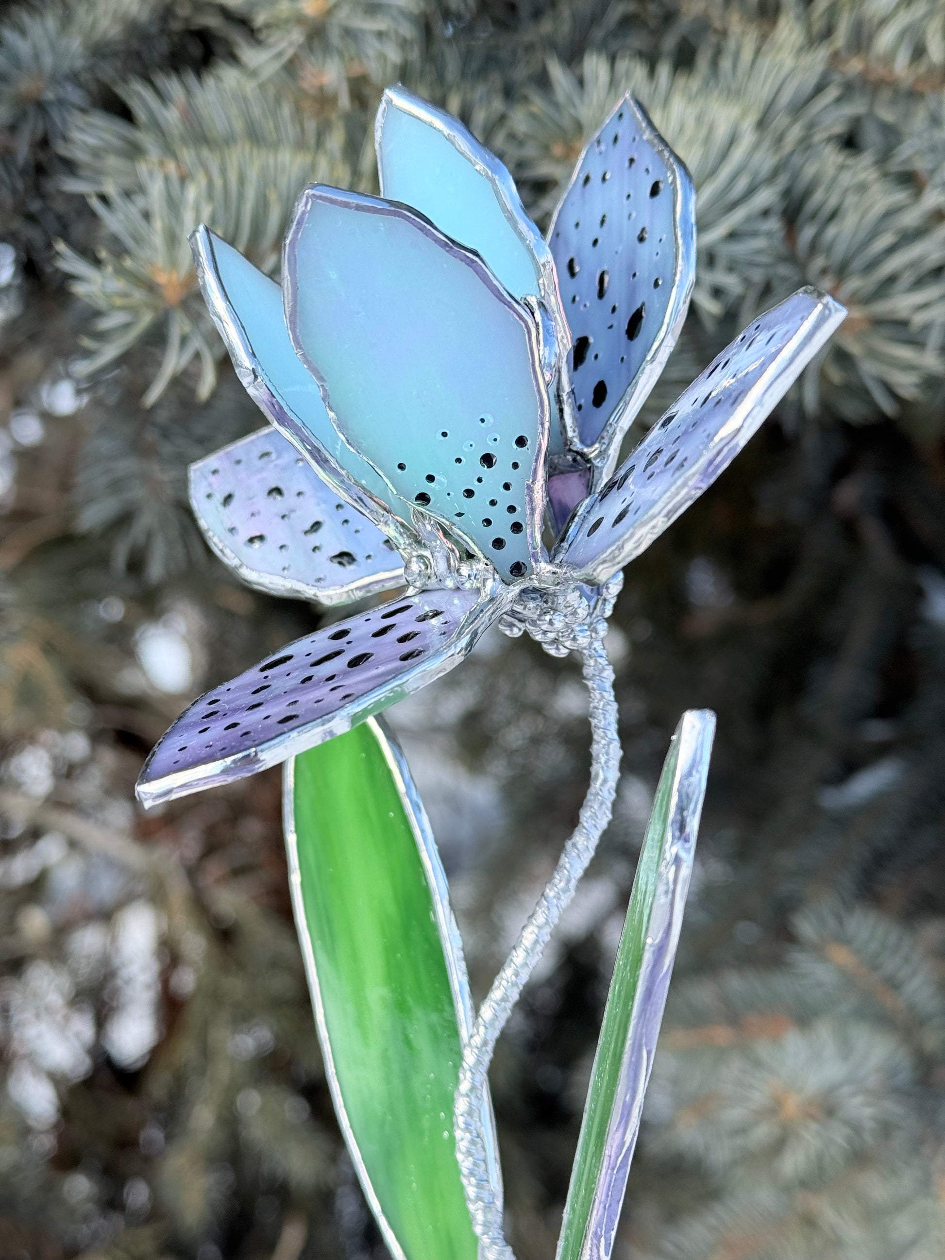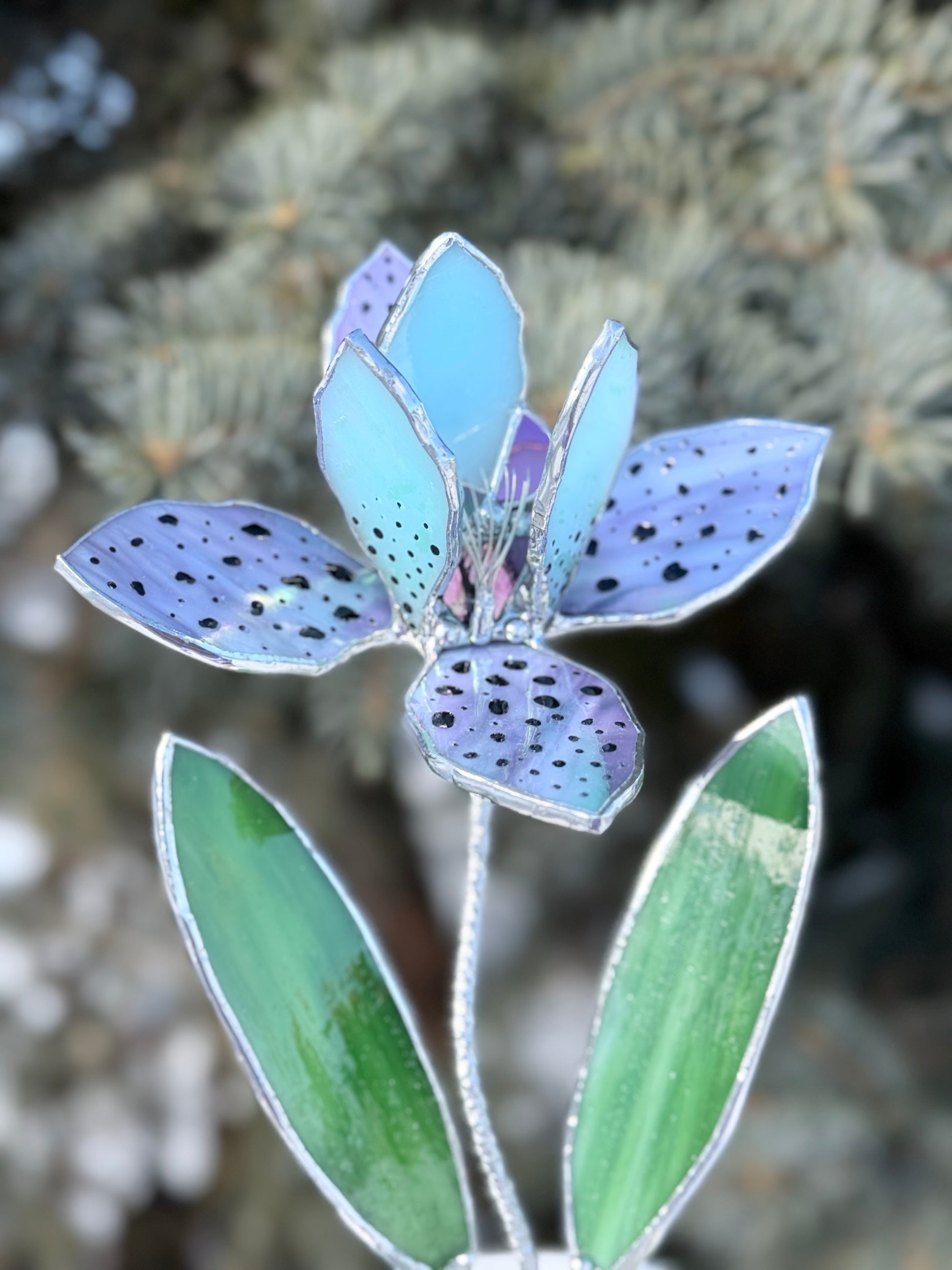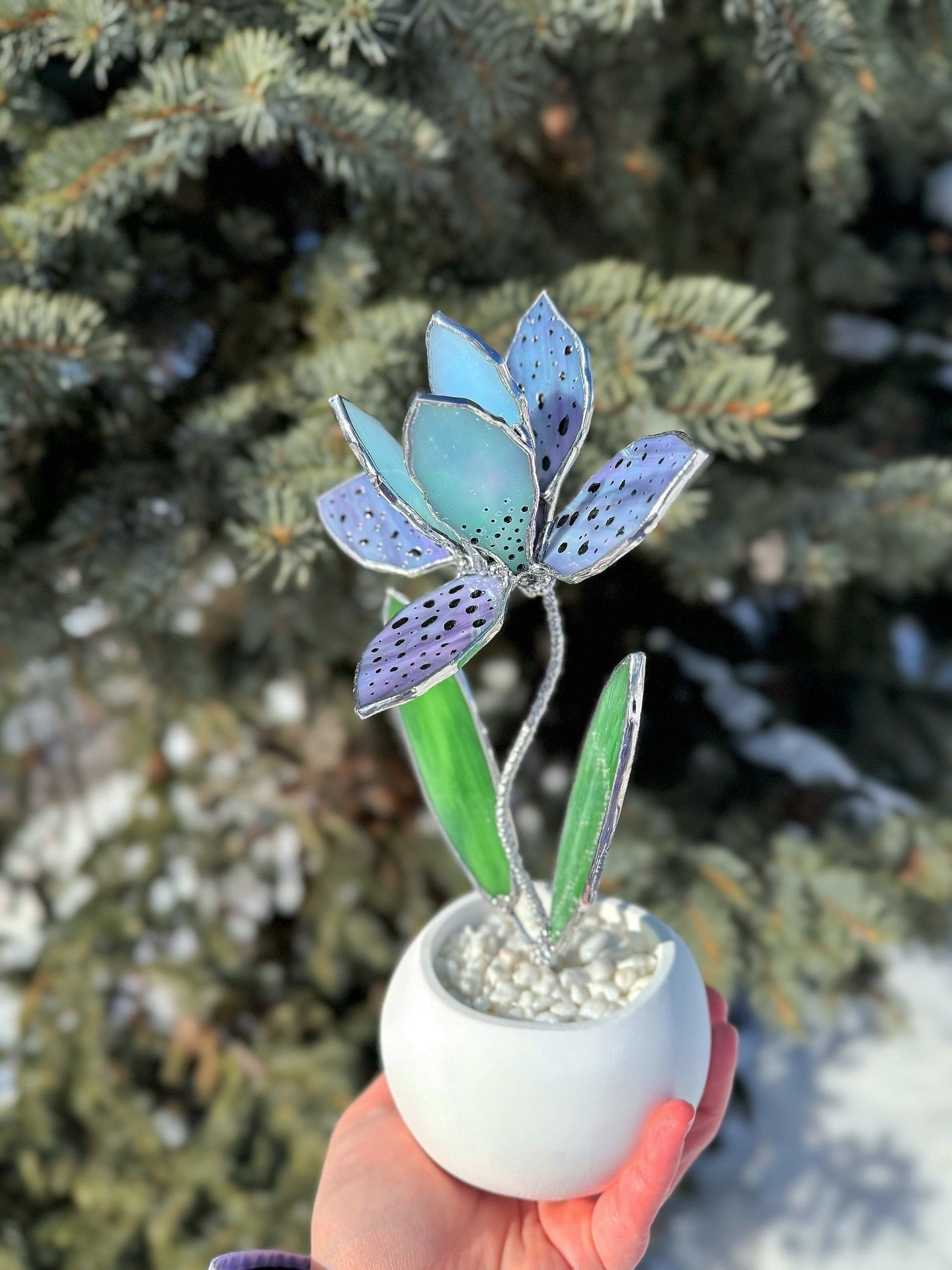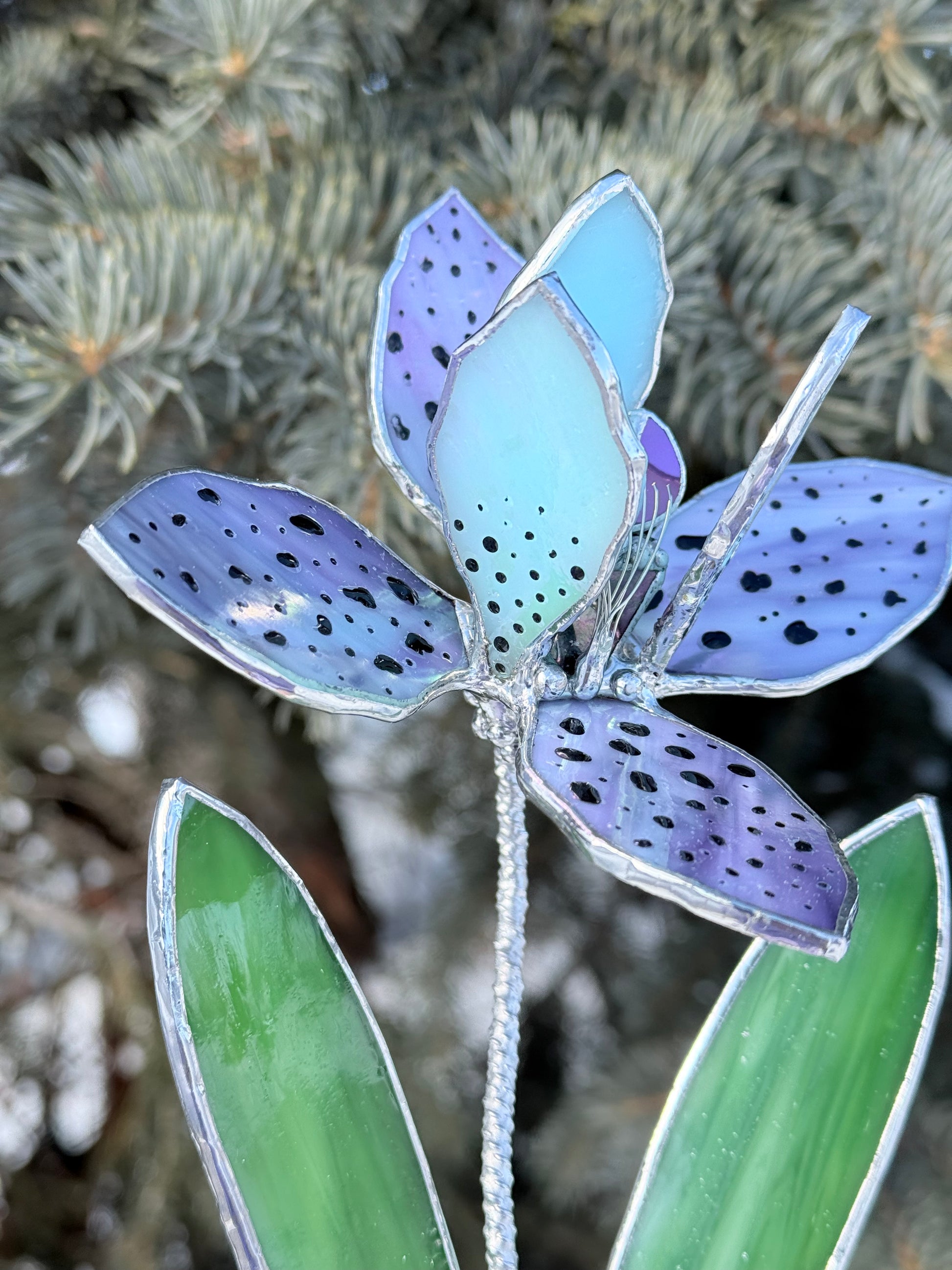 This handcrafted stained glass orchid sculpture reinterprets the exotic orchid in a refined, contemporary form. Soft lavender tones, delicate speckled petals, and vibrant green leaves create a sculptural silhouette that feels both graceful and modern.