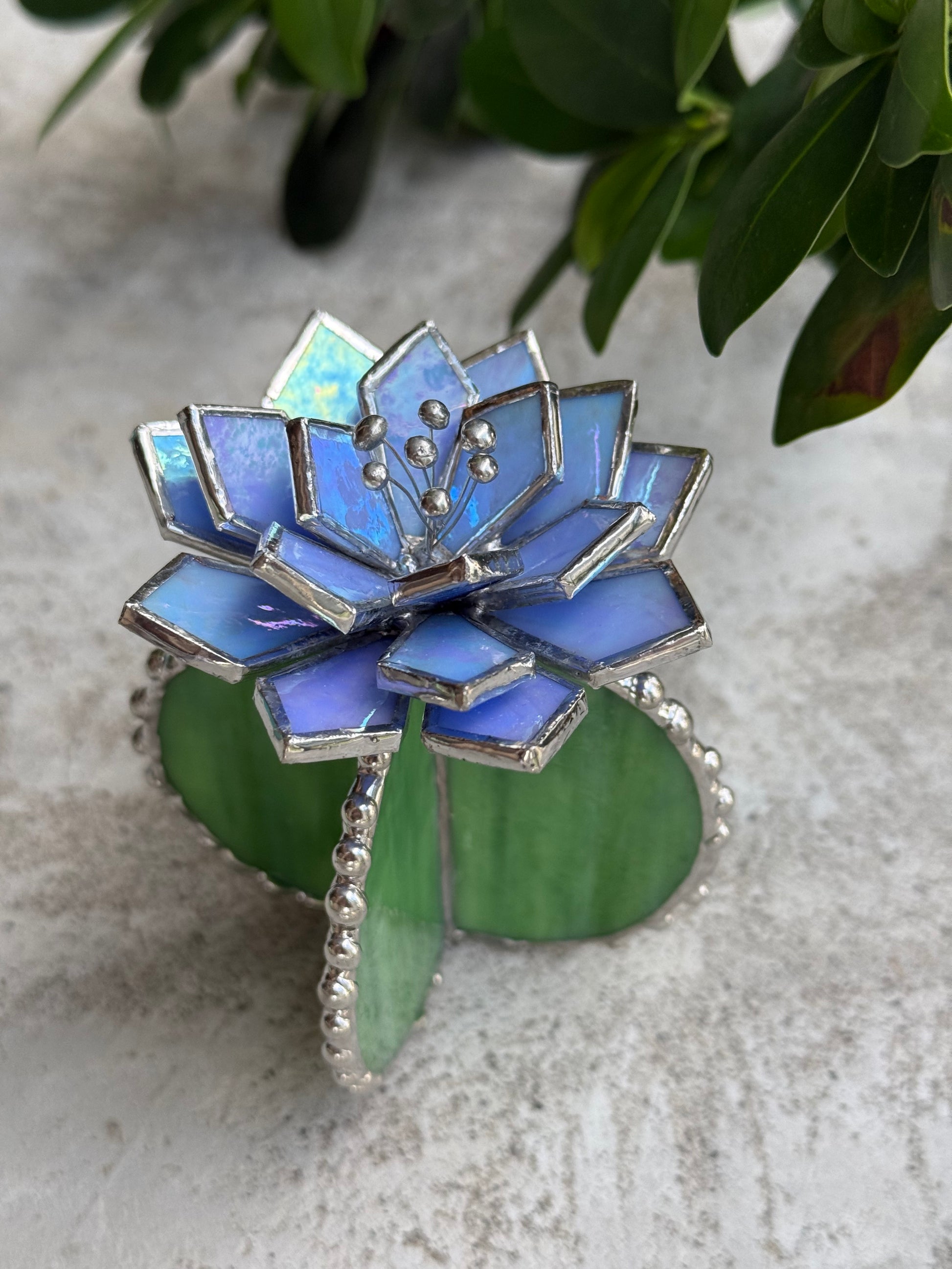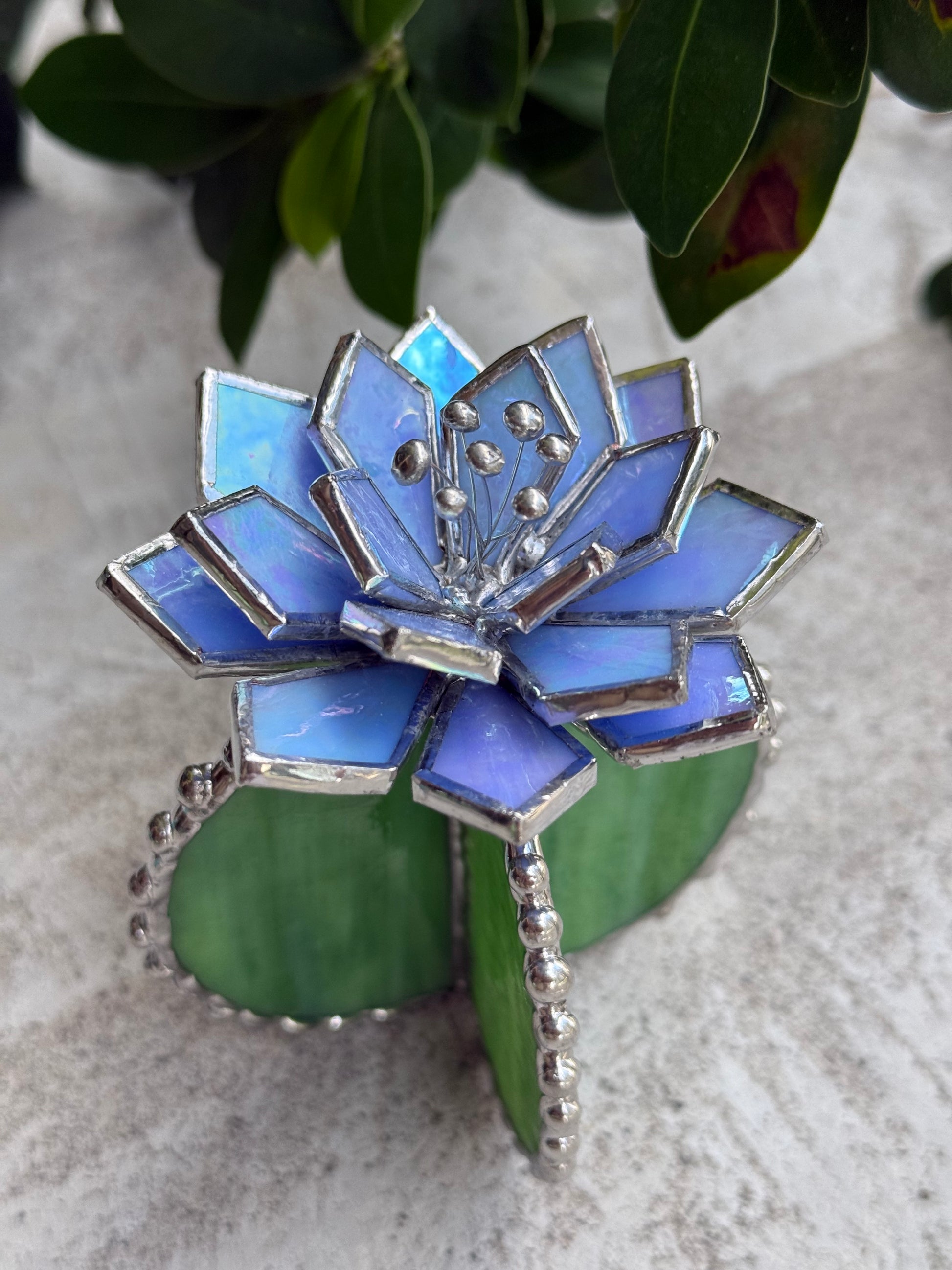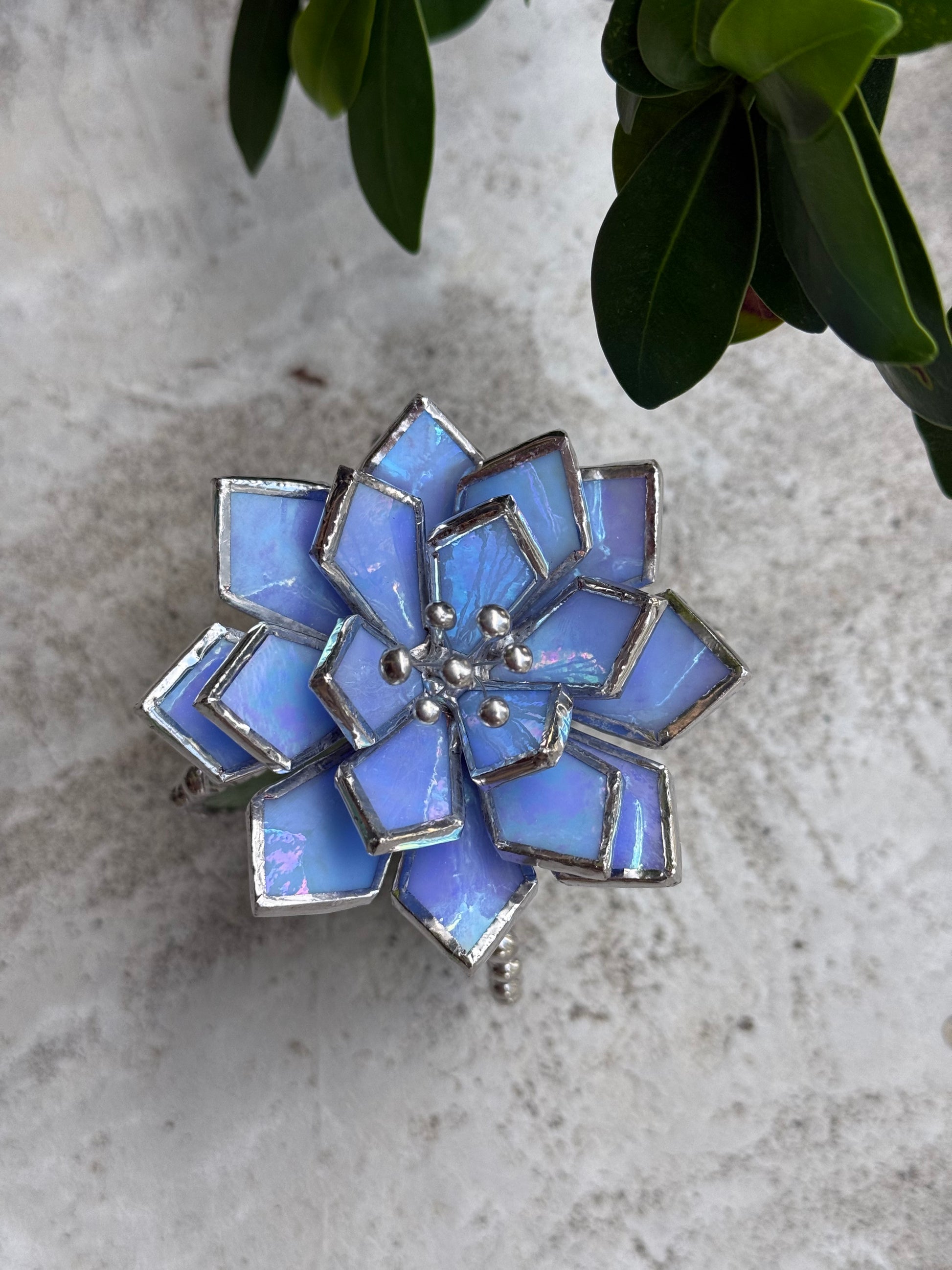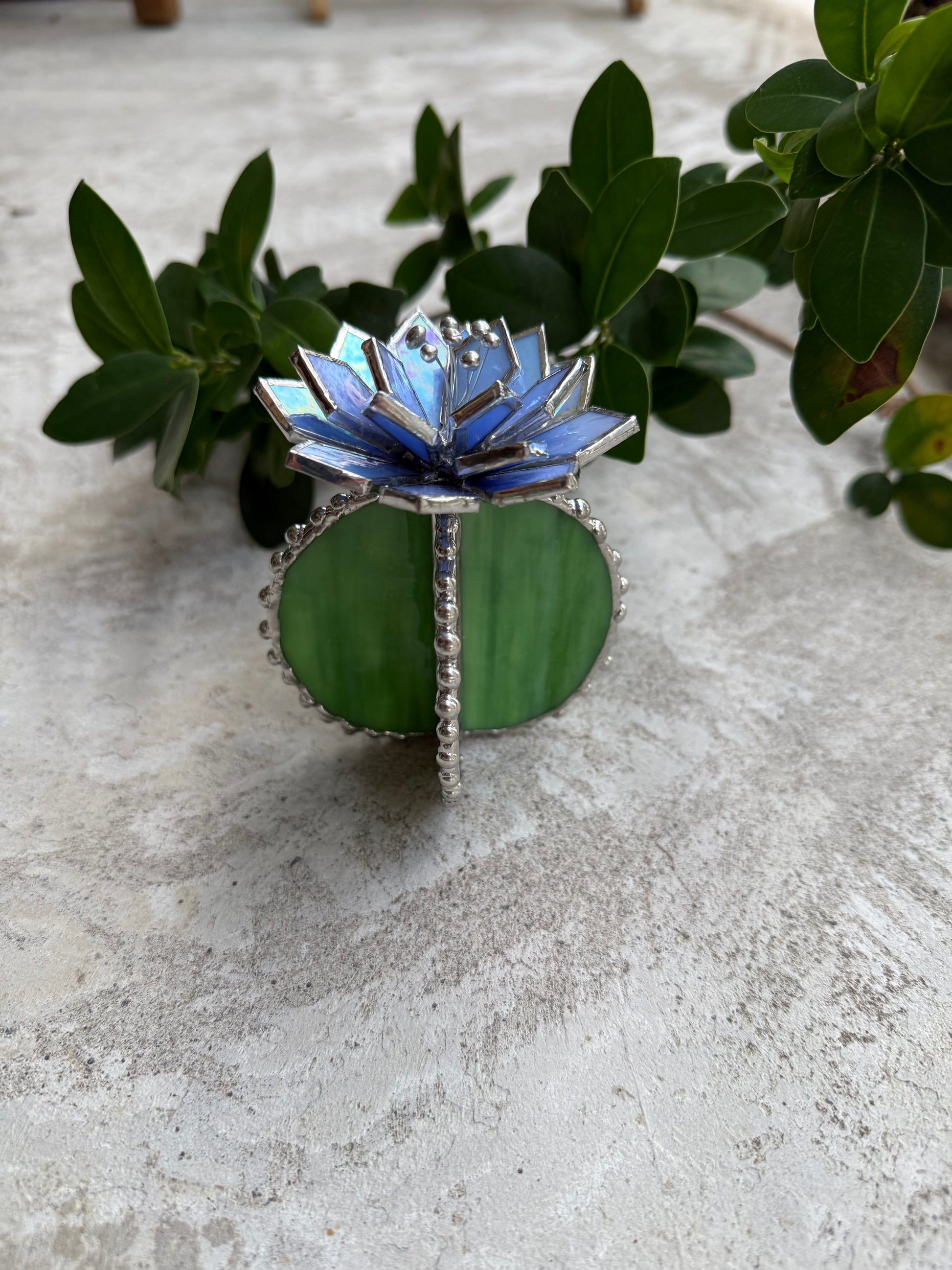 Handcrafted with great skill and love stained glass Cactus Succulent plant made of colourful art glass soldered using copper foil and tin with Tiffany technique.