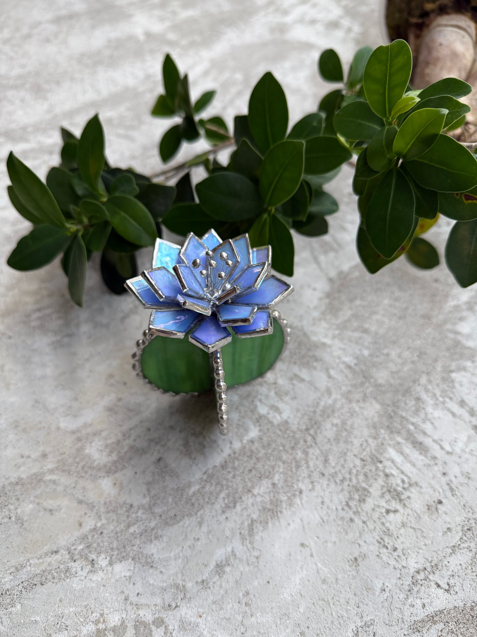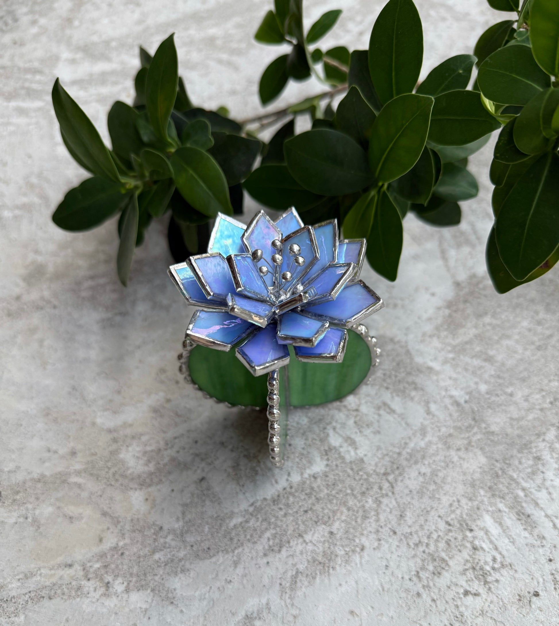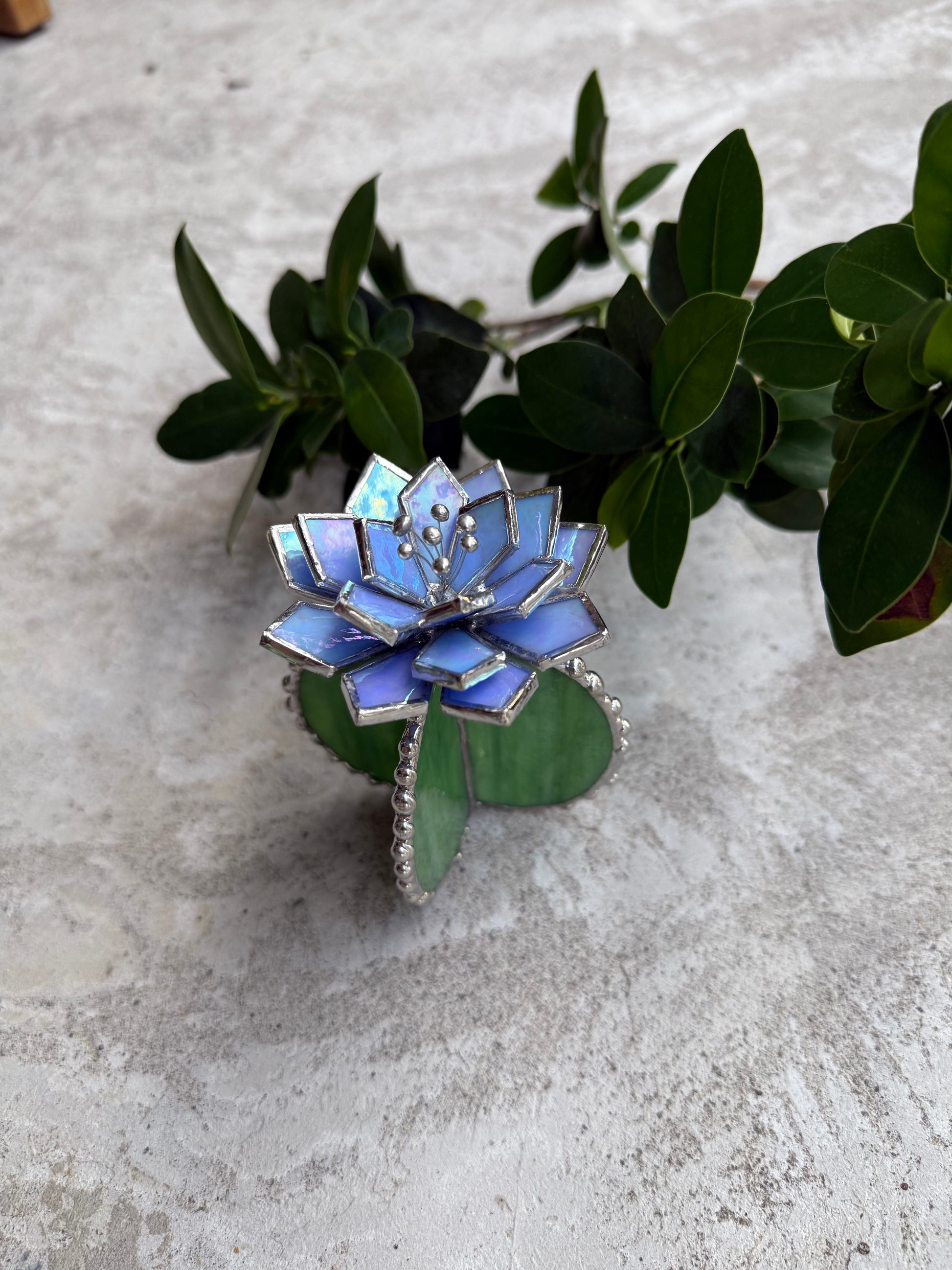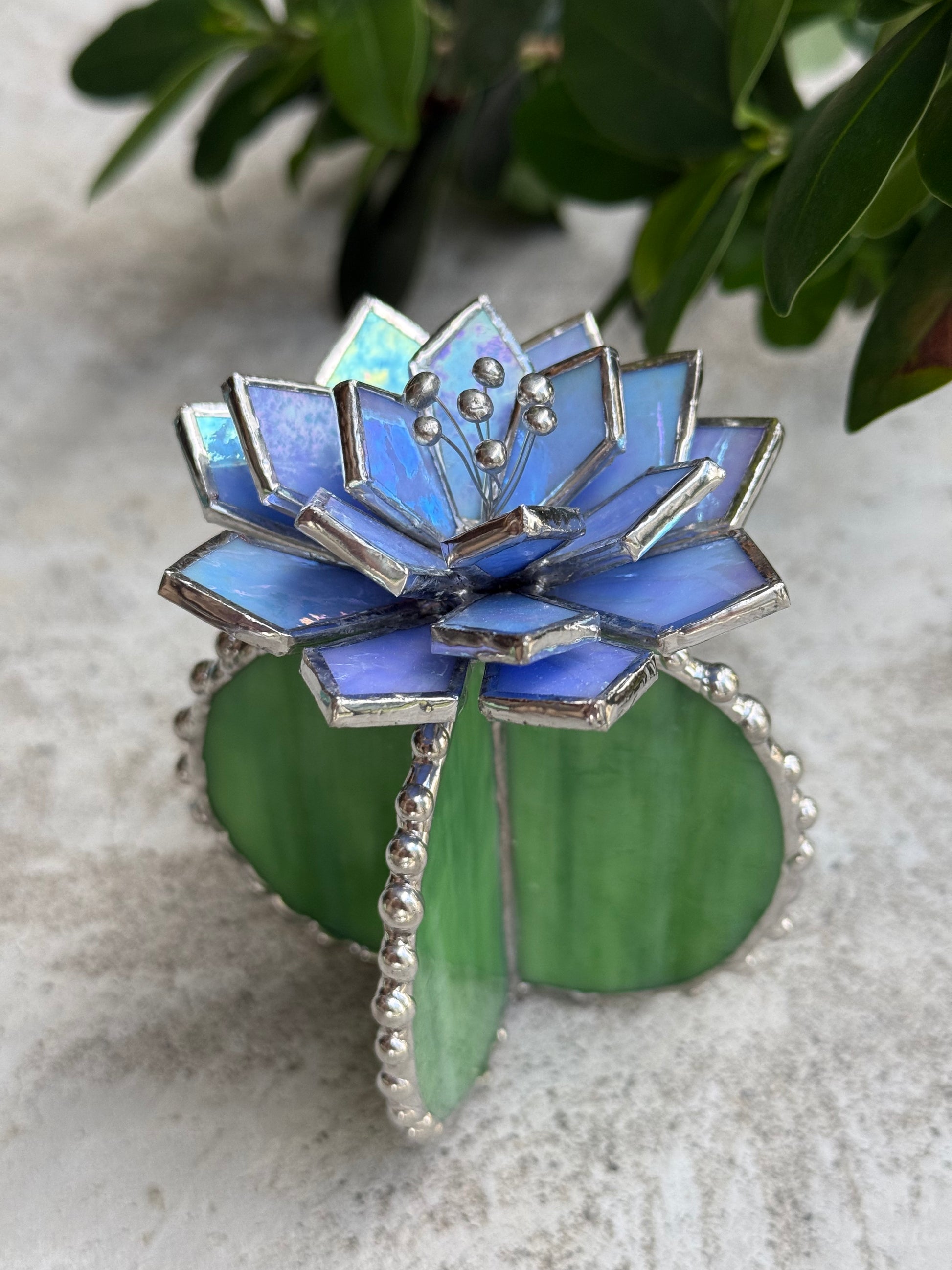 Handcrafted with great skill and love stained glass Cactus Succulent plant made of colourful art glass soldered using copper foil and tin with Tiffany technique.