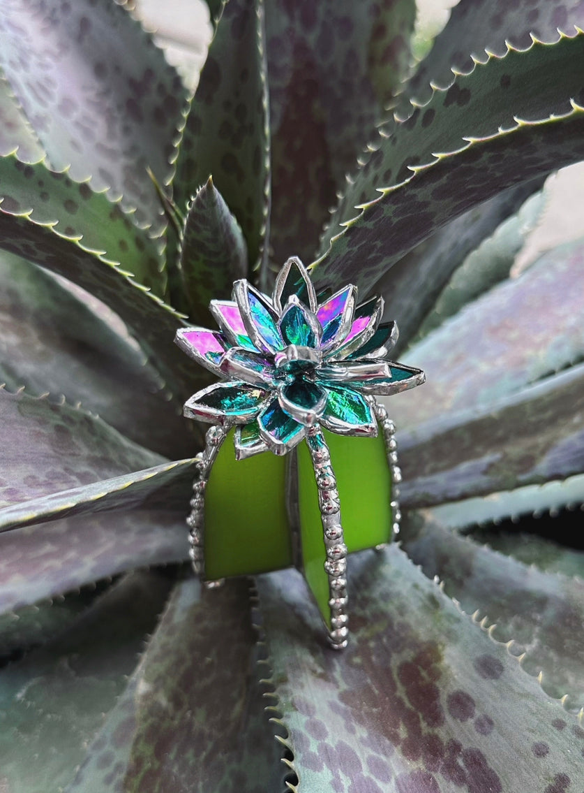 Handcrafted with great skill and love stained glass Succulent plant Cactus made of colourful art glass soldered using copper foil and tin with Tiffany technique.