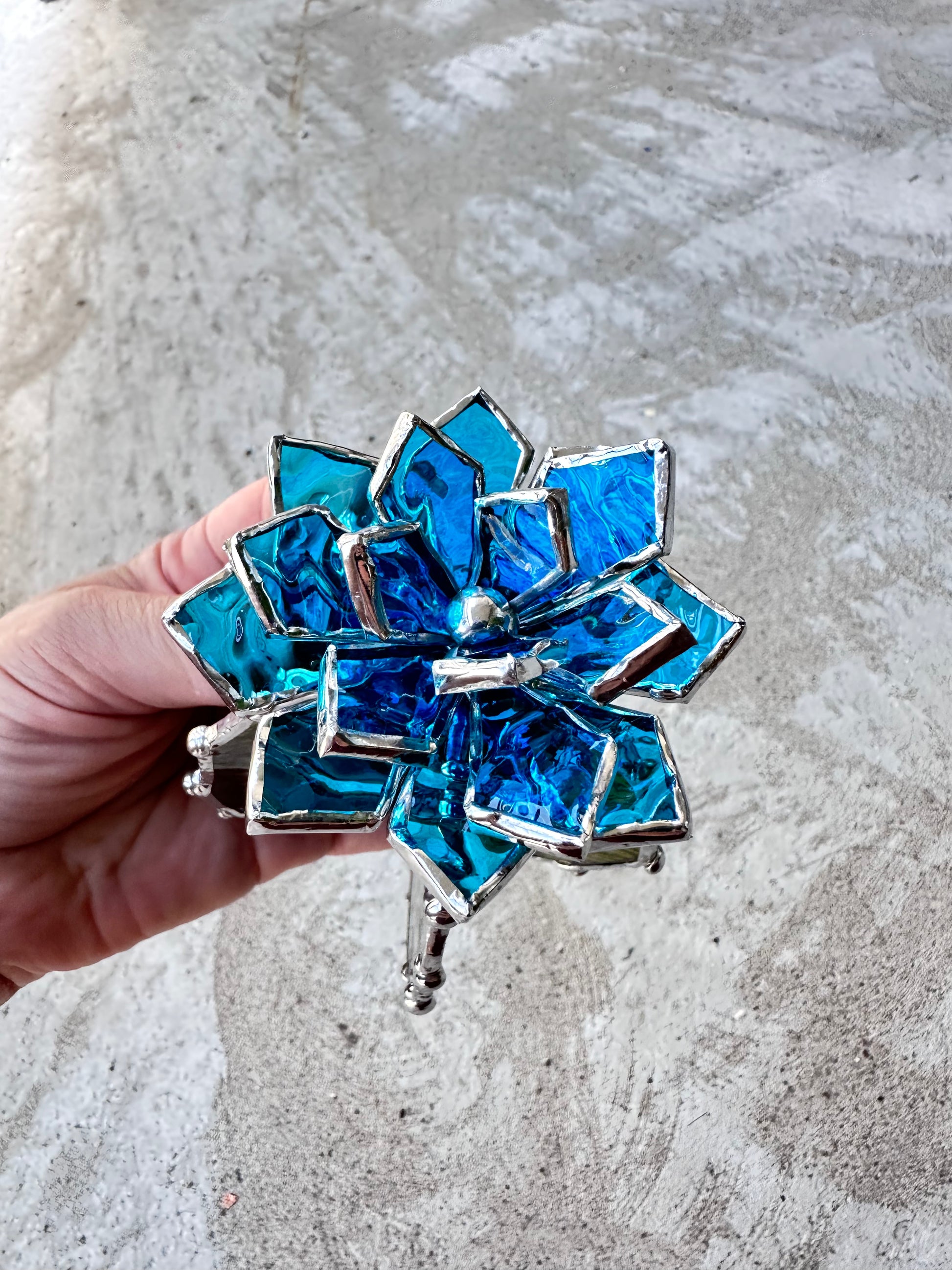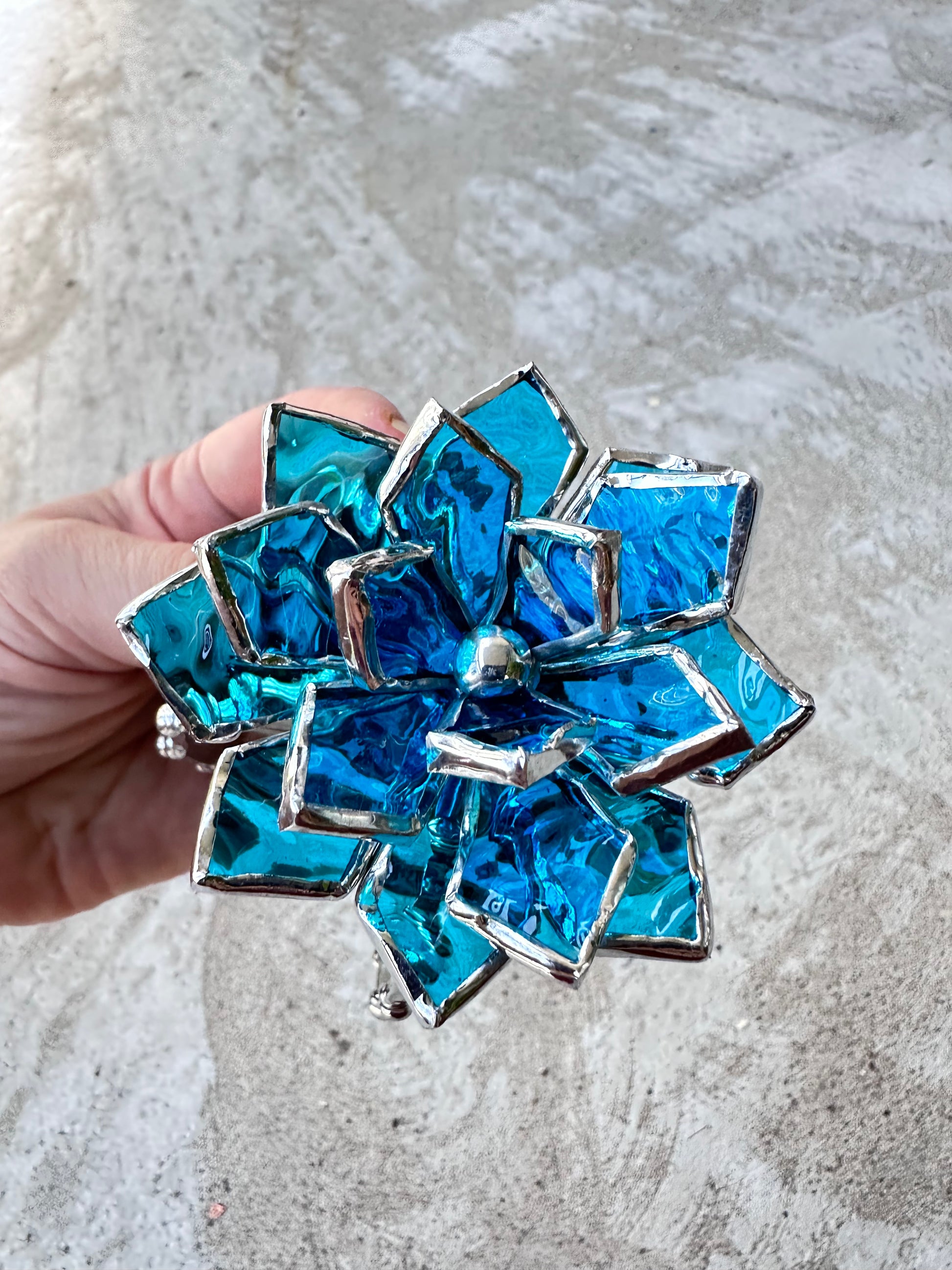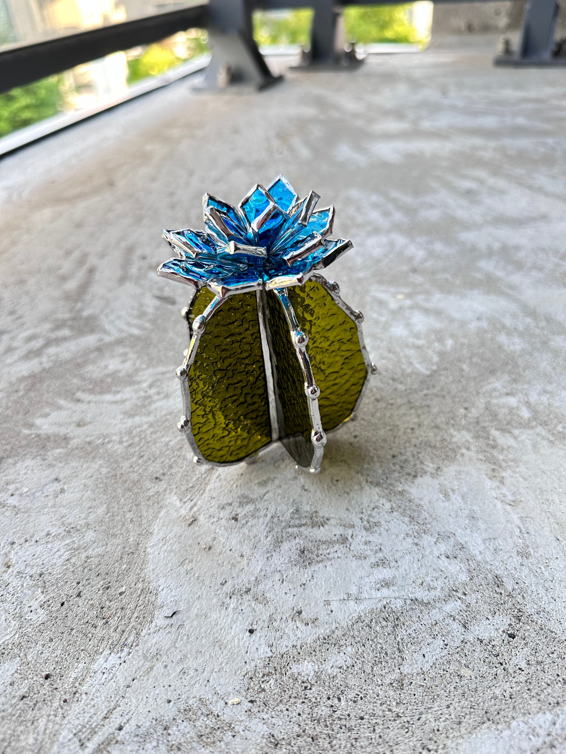 "Cactus XL blooming Sky blue transparent”" stained glass , Succulent 3D design, house indoor plant for flower pot, Sun catcher, wedding decor