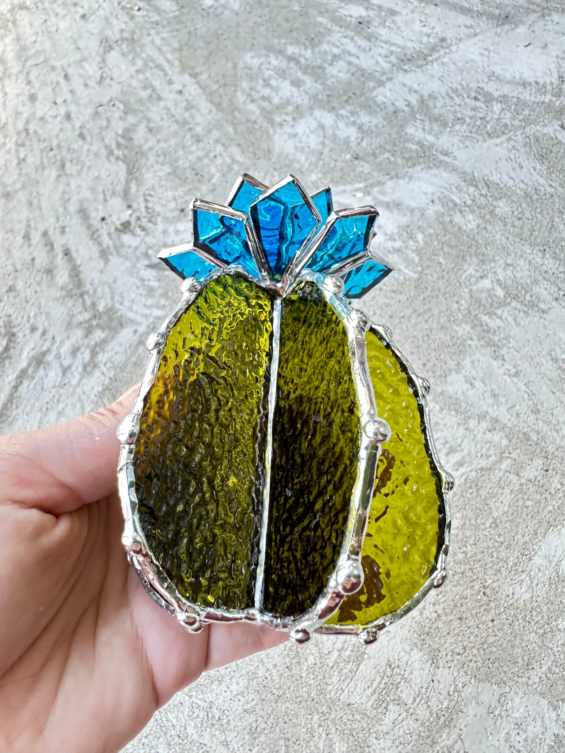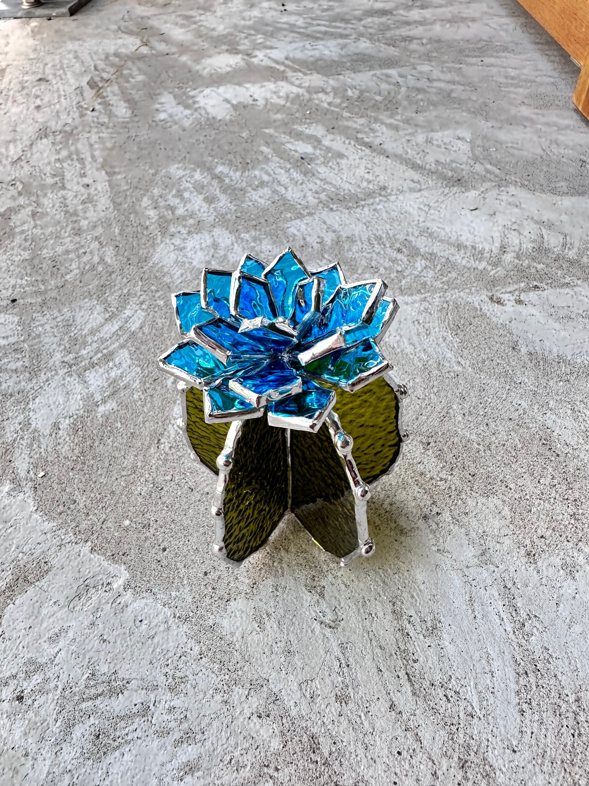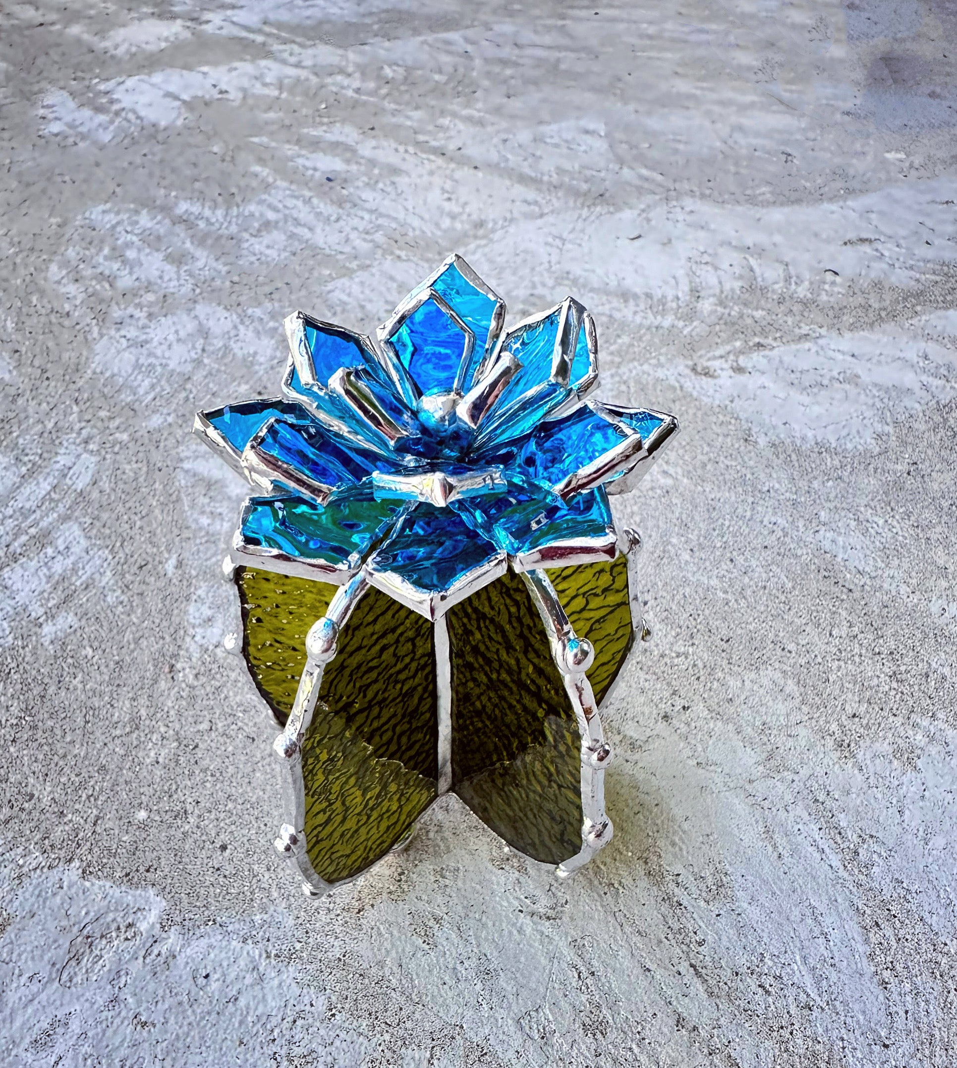 "Cactus XL blooming Sky blue transparent”" stained glass , Succulent 3D design, house indoor plant for flower pot, Sun catcher, wedding decor