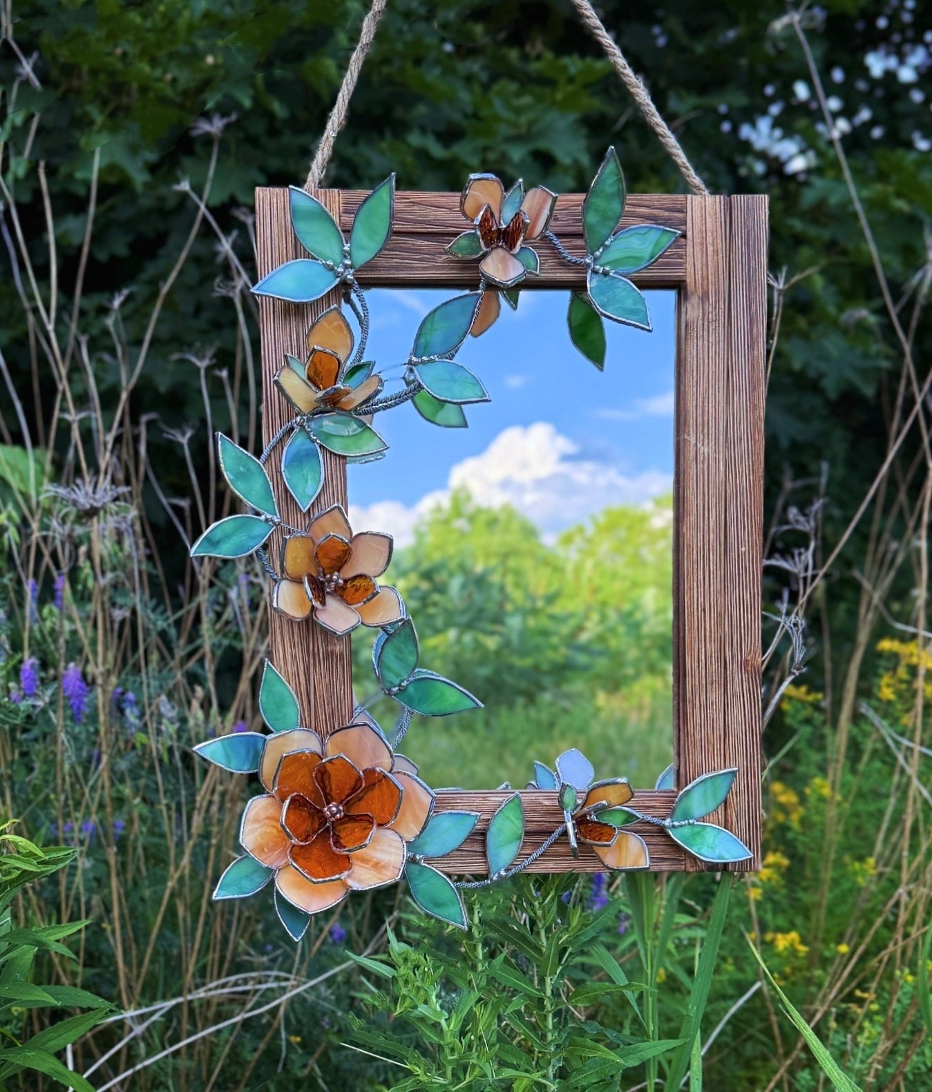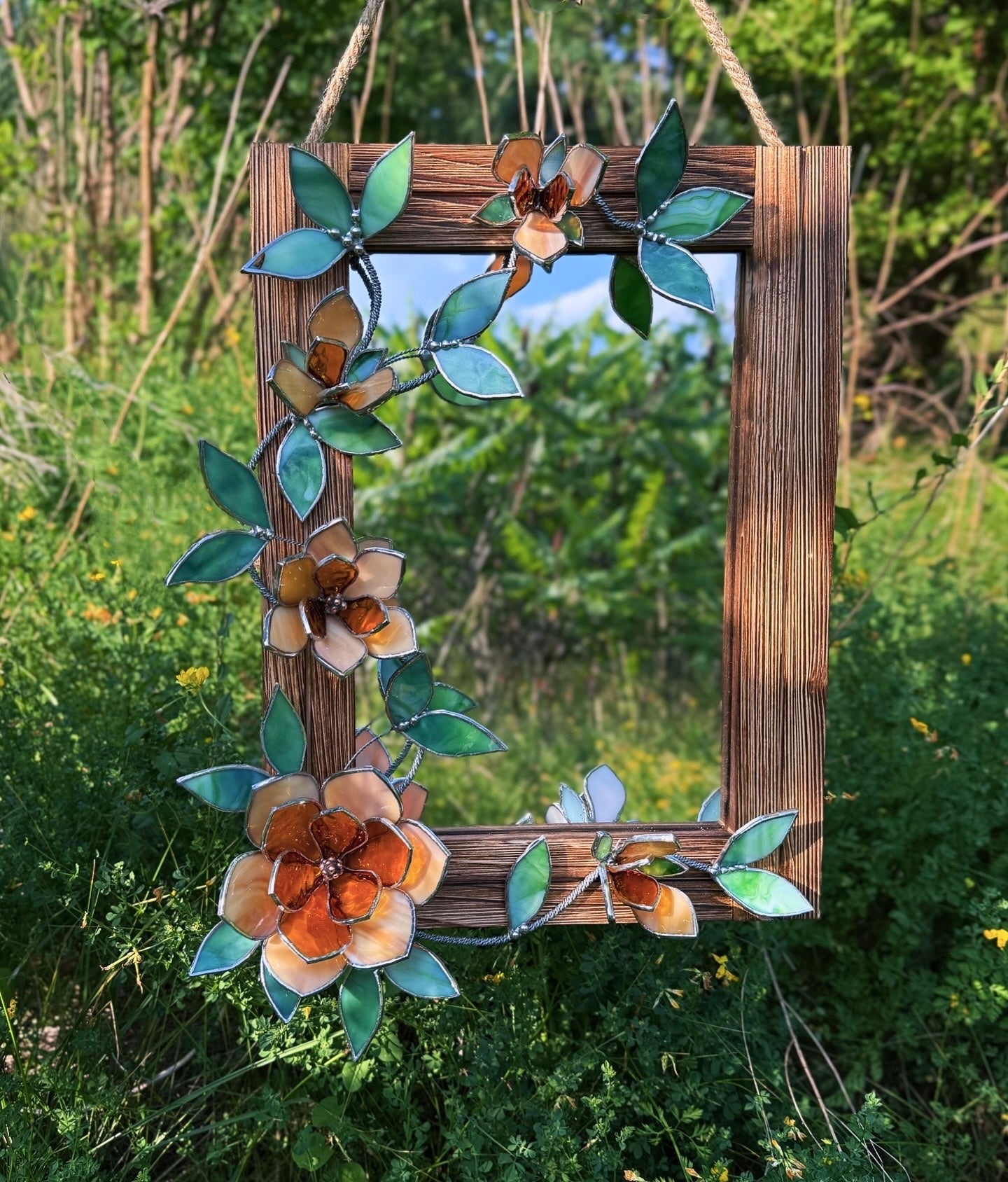 This unique handcrafted Mirror ‘Amber Magnolia’ with stunning art glass flowers made of natural wood, art glass and metal wire. Glass flowers are match perfectly with the wooden base. The frame made of natural wood.