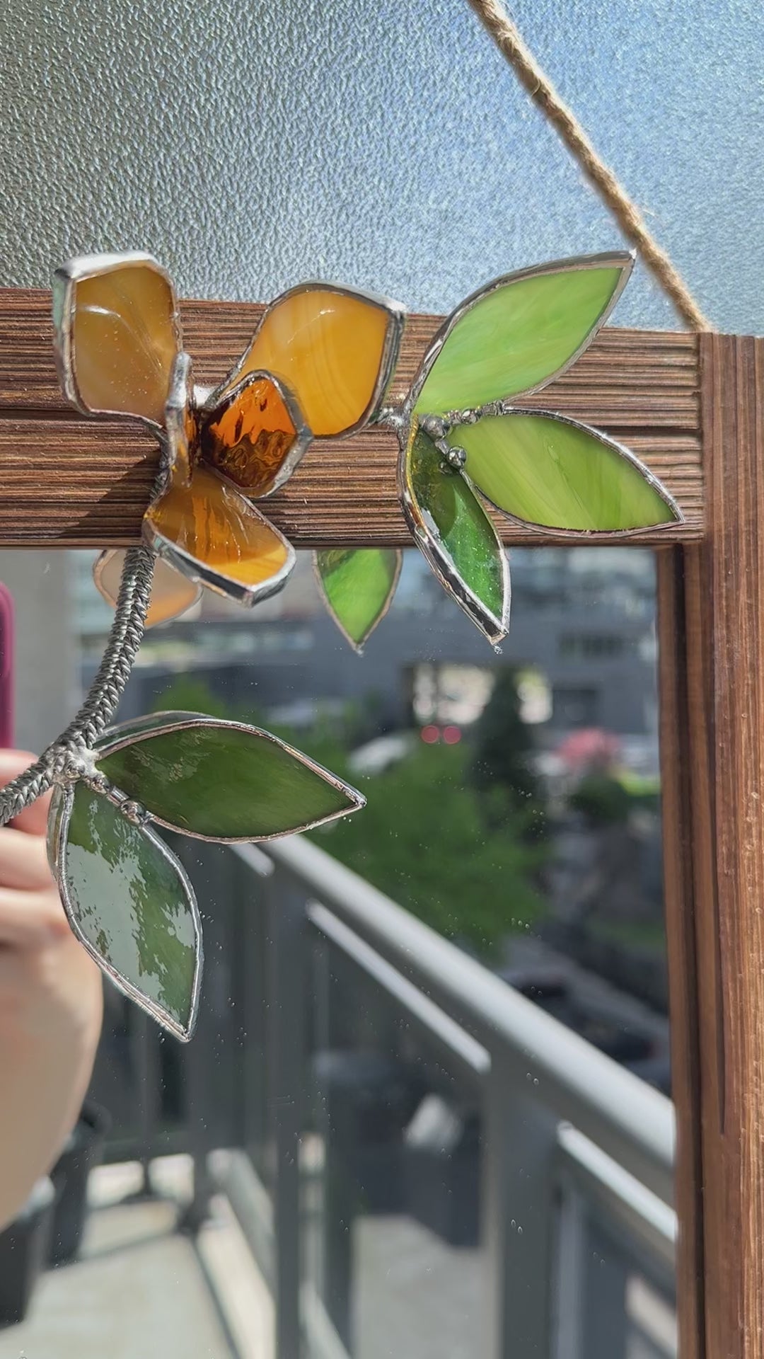 This item is made using natural wood, art glass, soldering, metal wire and copper foil