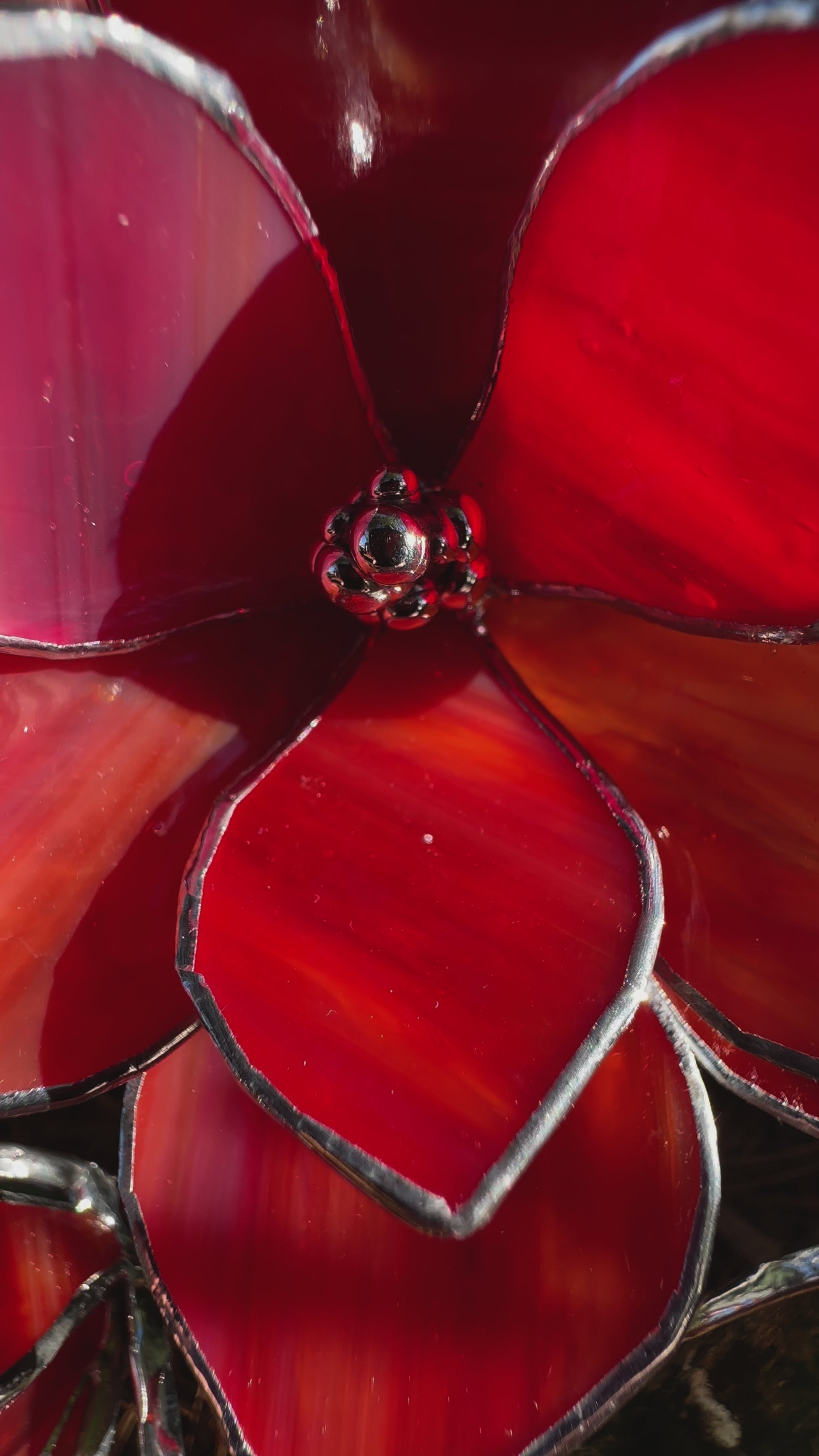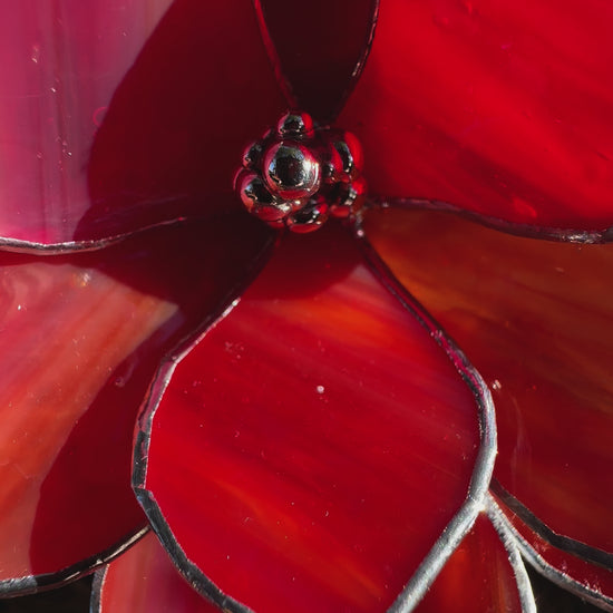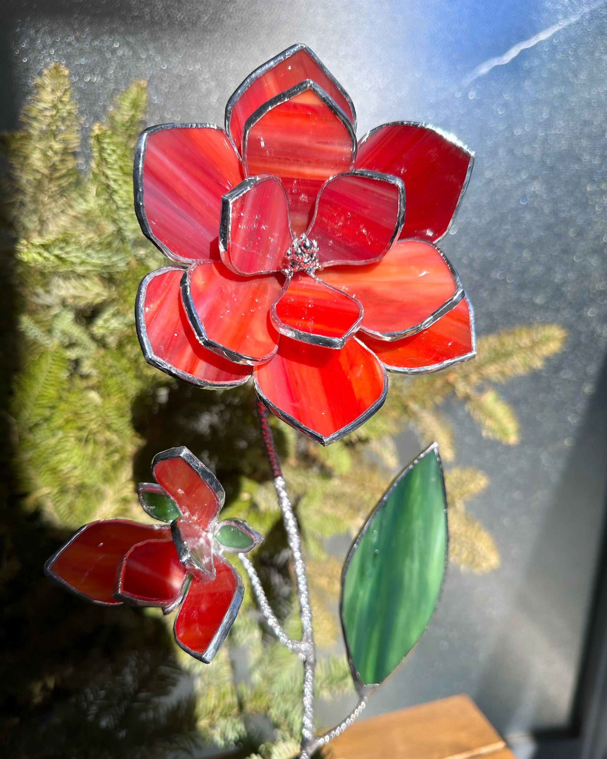 This unique hand crafted with stained glass 3D Bright Red Magnolia Flower made of art glass. Completed with removable ceramic pot. The original design.