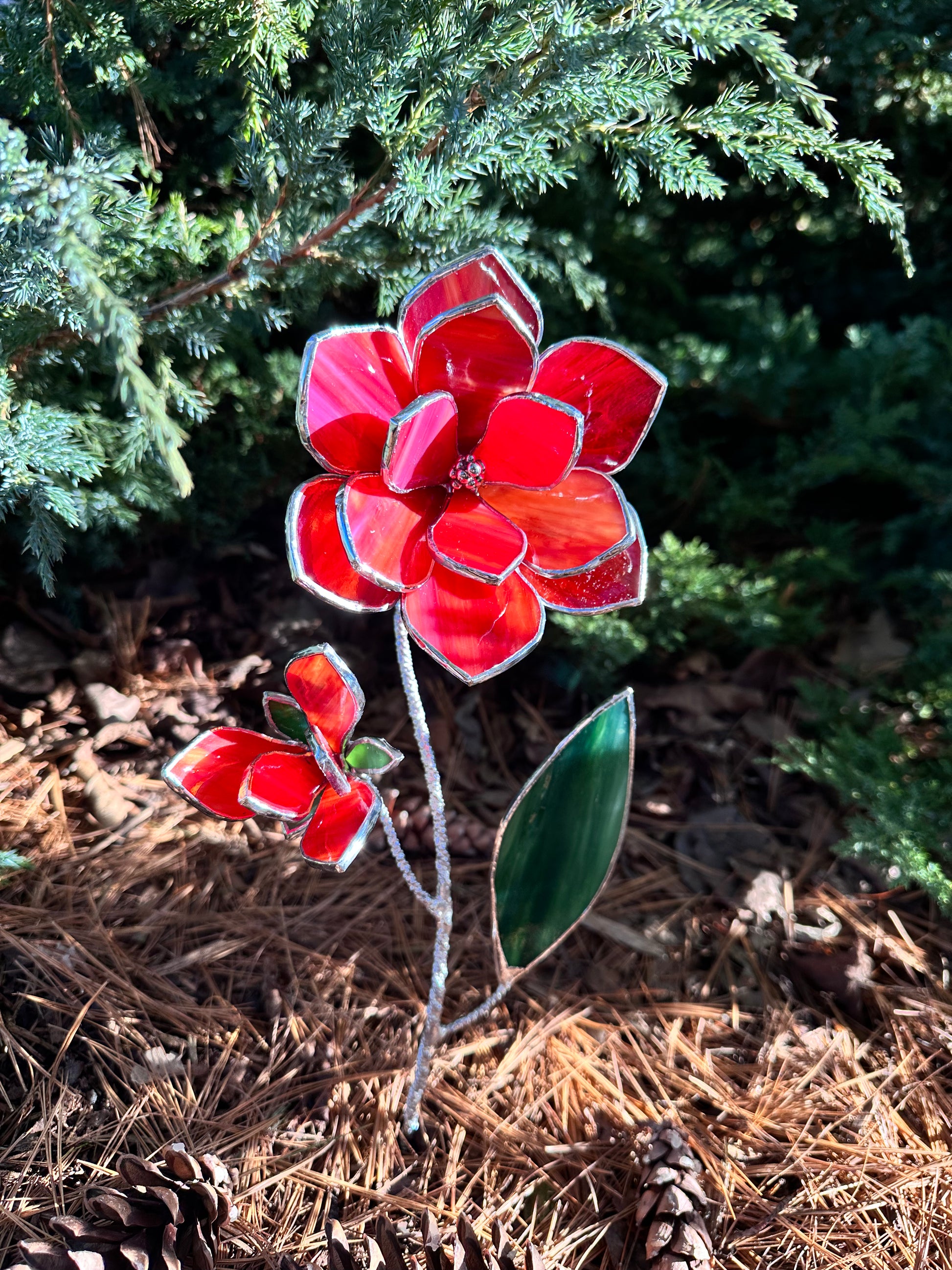 ".Magnolia Bright Red & Amber with bud" Stained glass tropical flower Suncatcher Iridescent 3D, Table plant cactus decor, Home Garden stake, Mother’s Day gift, Outdoor and gardening, pot