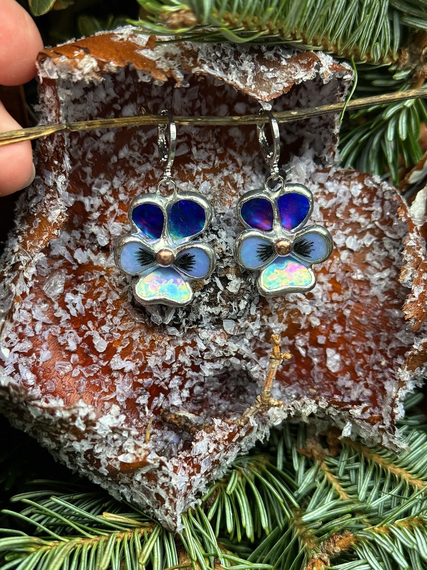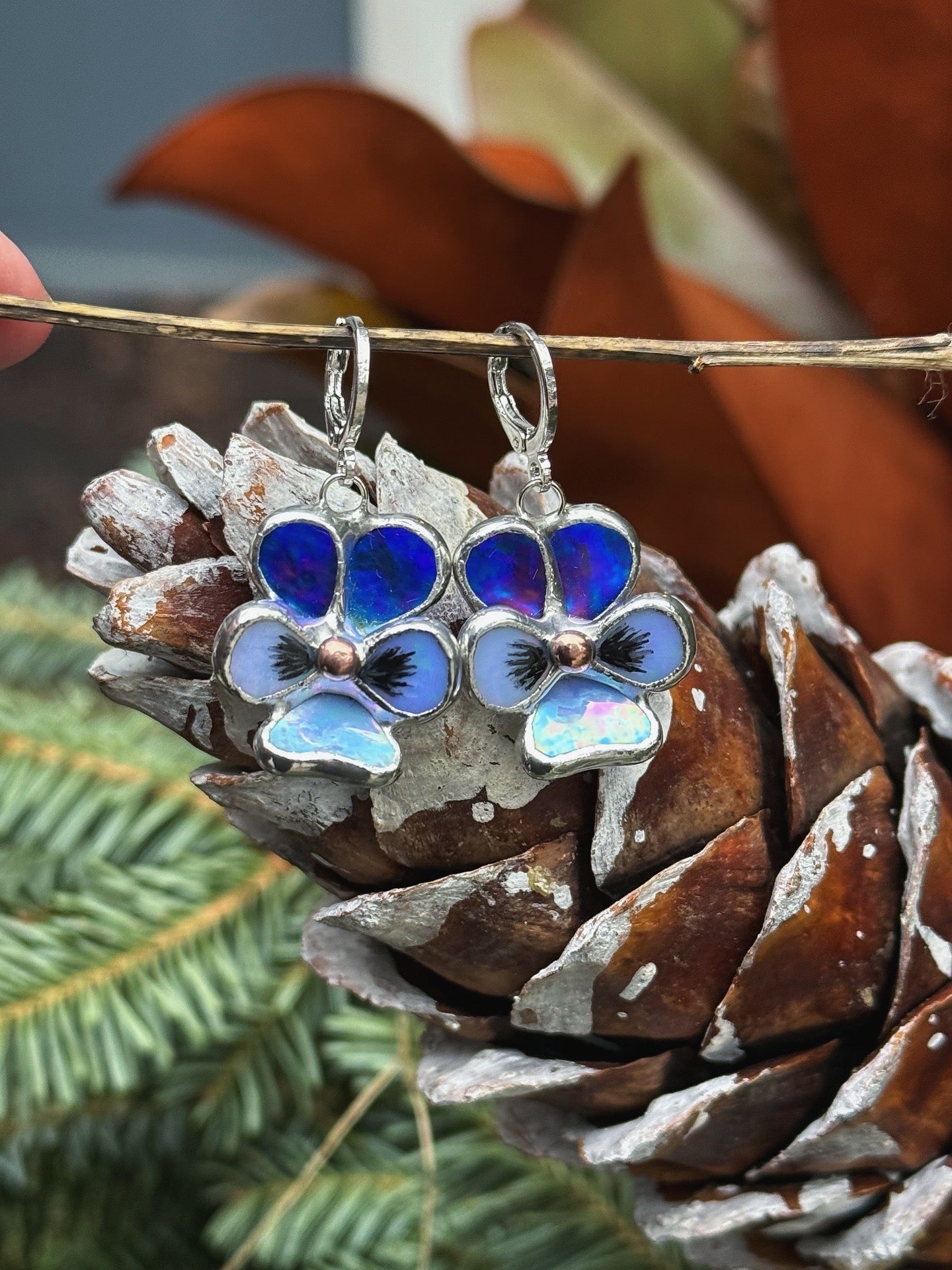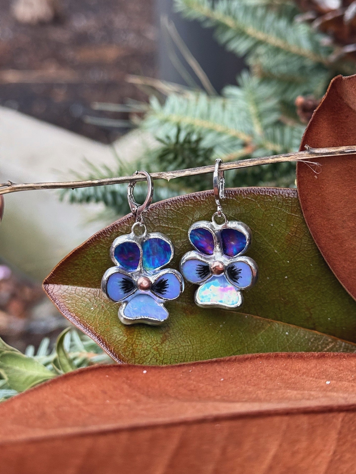 " . Earrings Pansy flower Indigo iridescent” Stained glass modern floral art jewelry