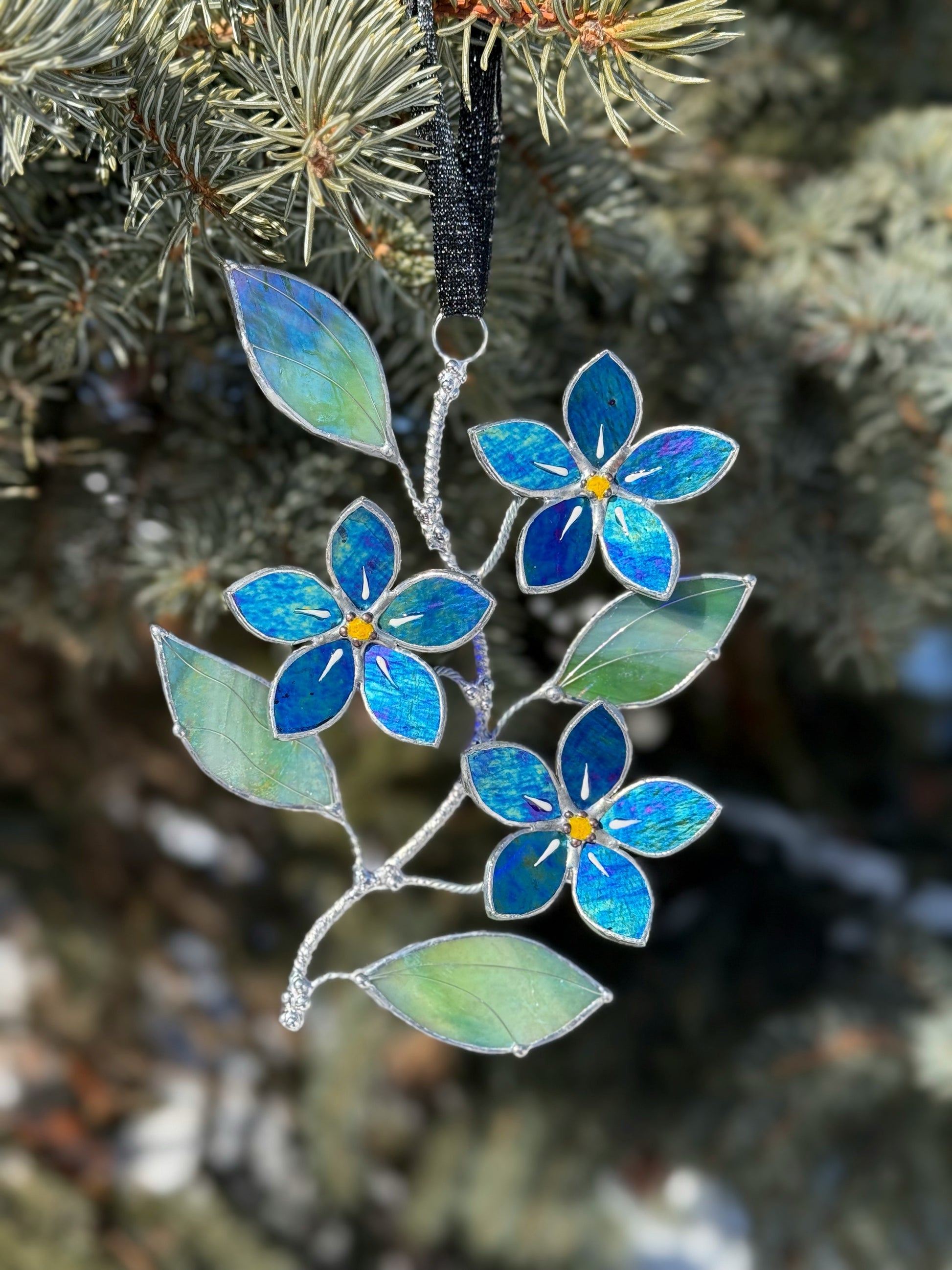 " . Forget me not 3 flowers Indigo iridescent Wall Pendant, Stained glass, Walldecoration, Suncatcher
