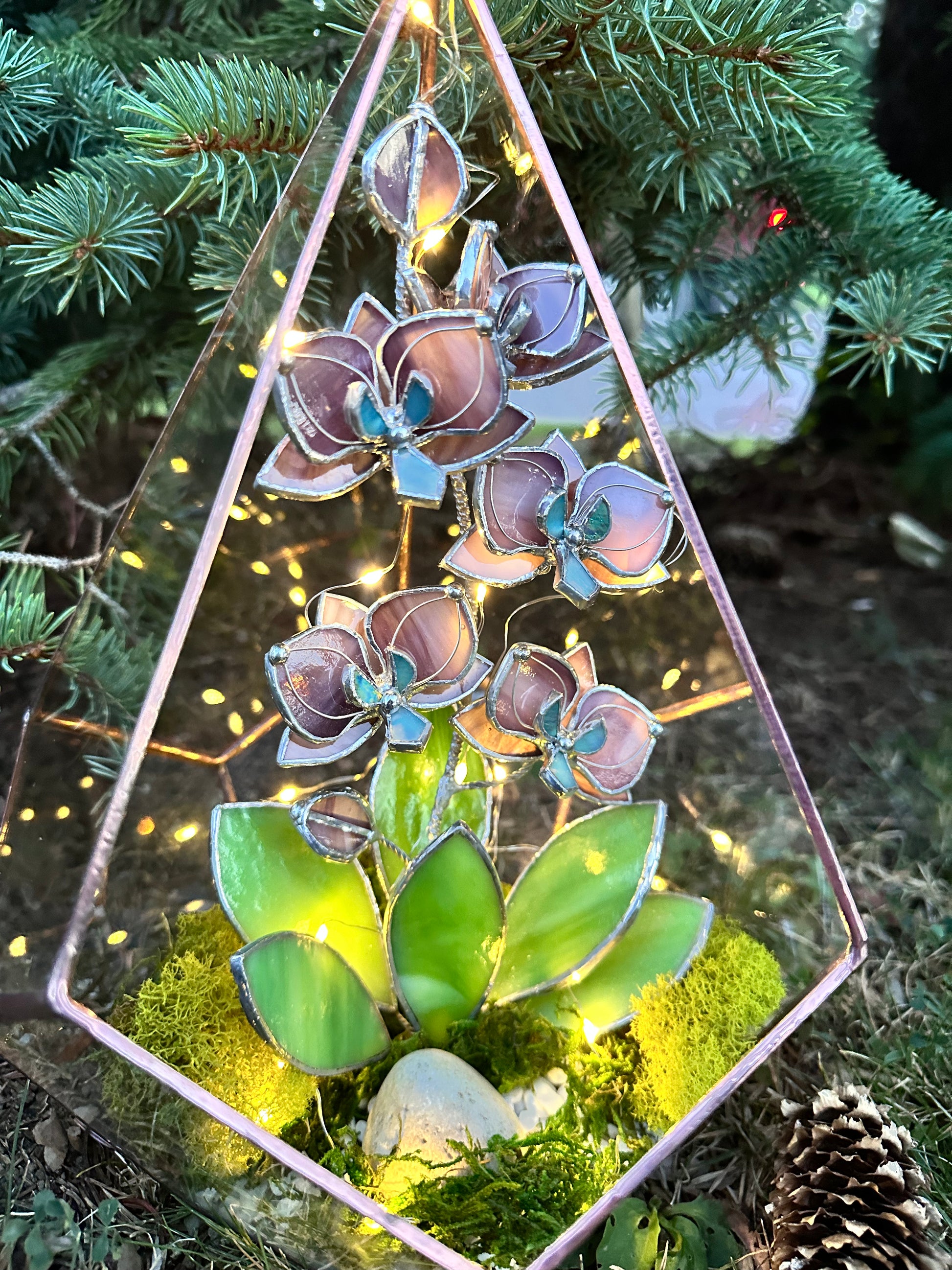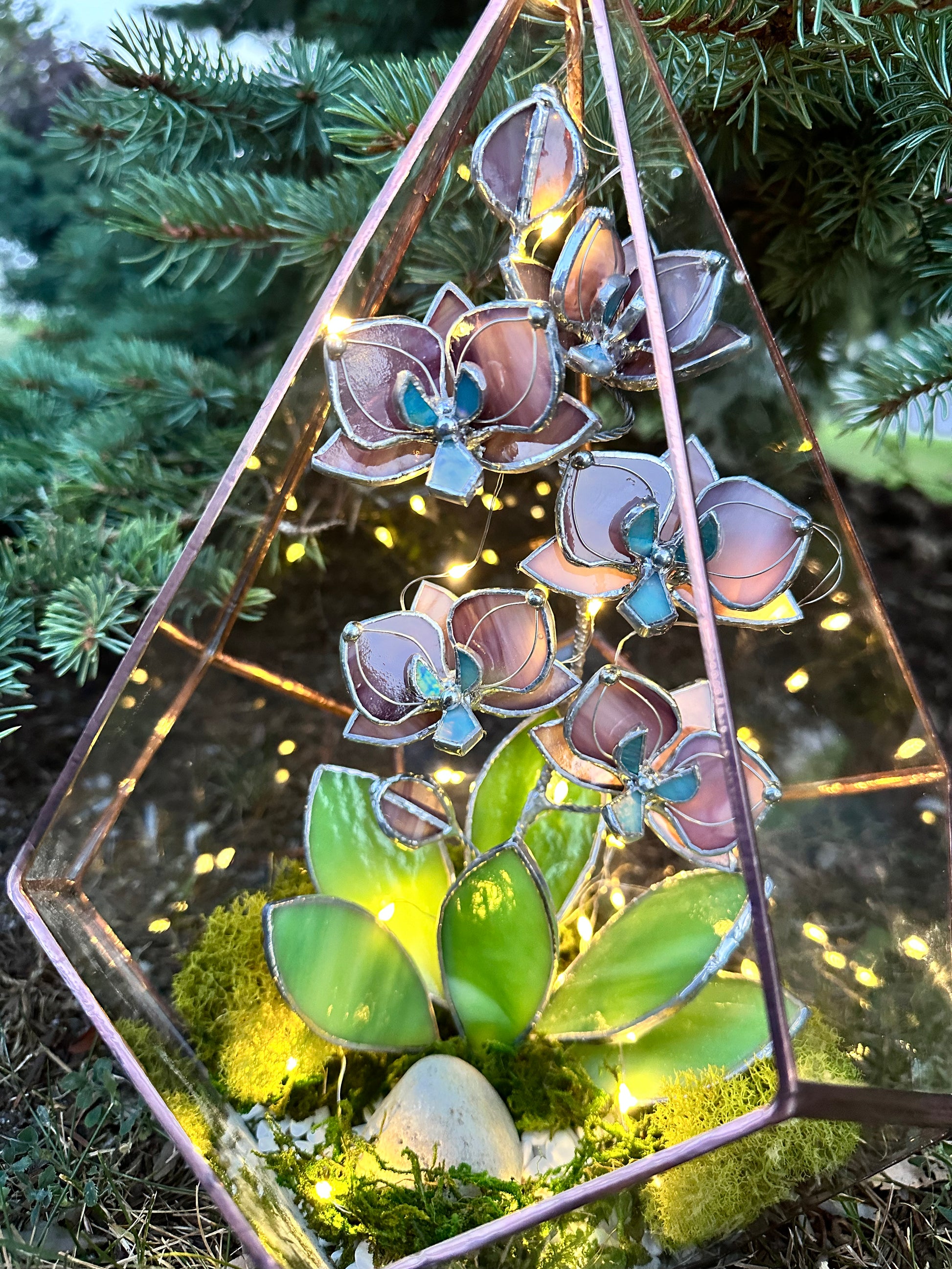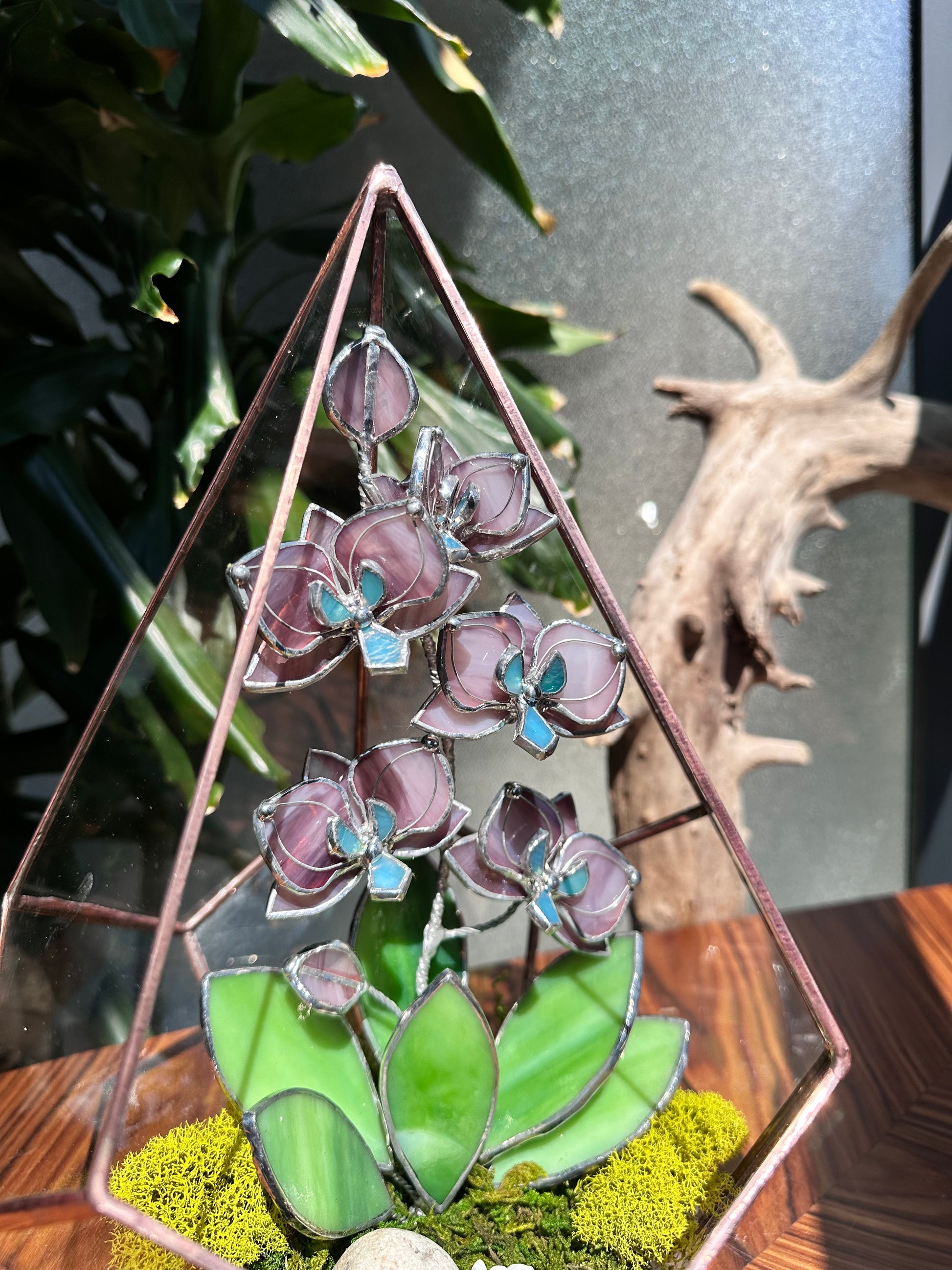 " . CHOOSE COLOR Geometric glass 3D terrarium Teardrop with stained glass orchids. Wedding glass decor, Mother’s Day gift, glass art, suncatcher, succulents, cacti