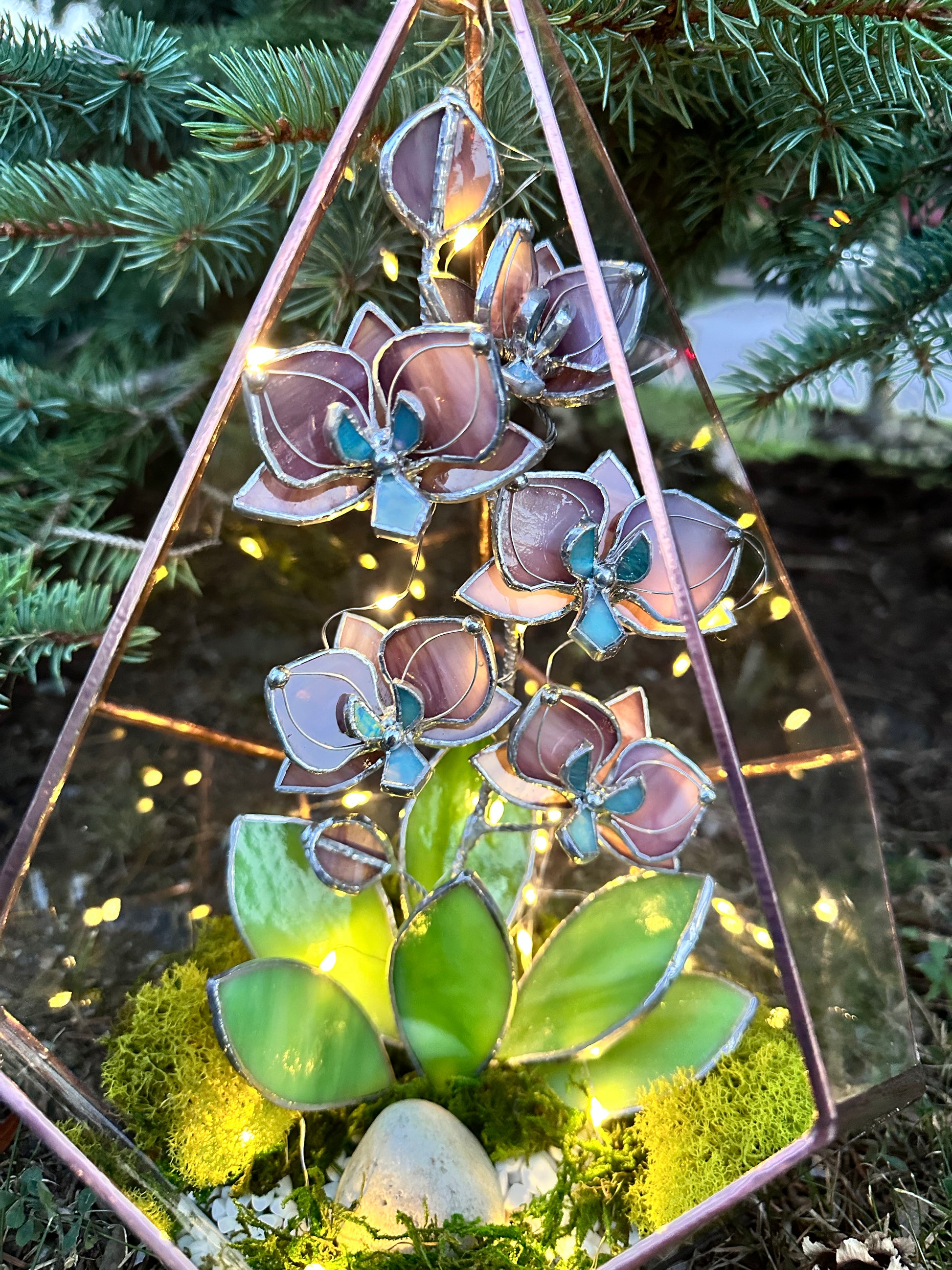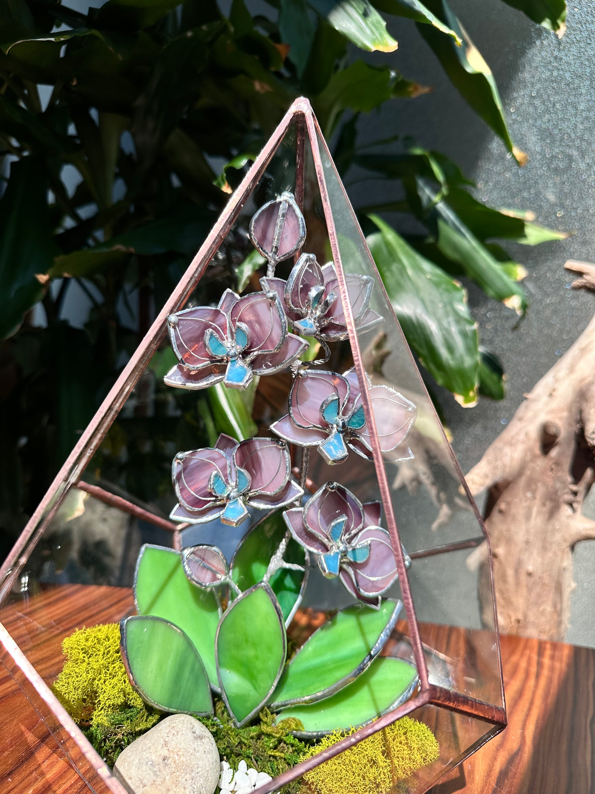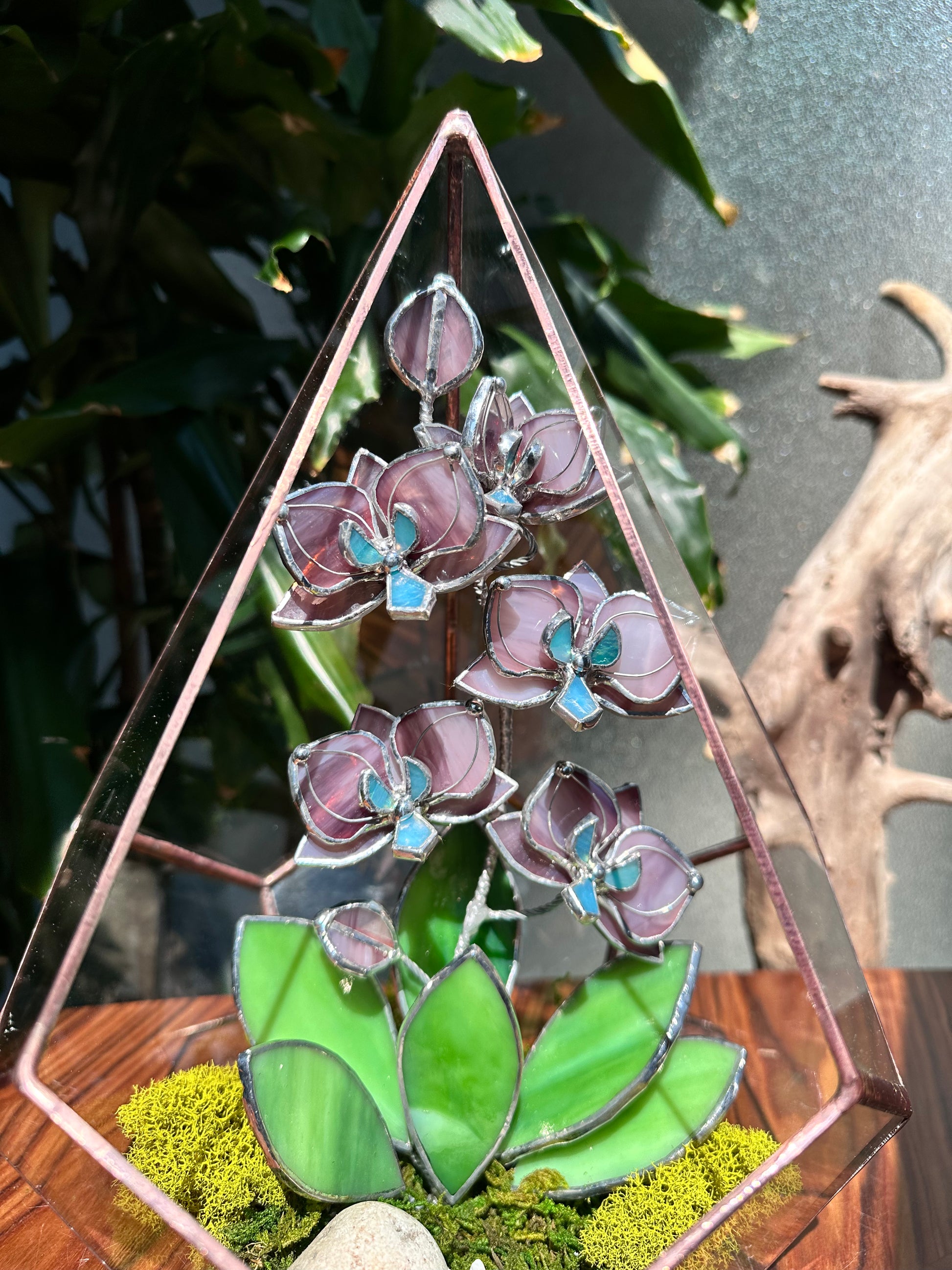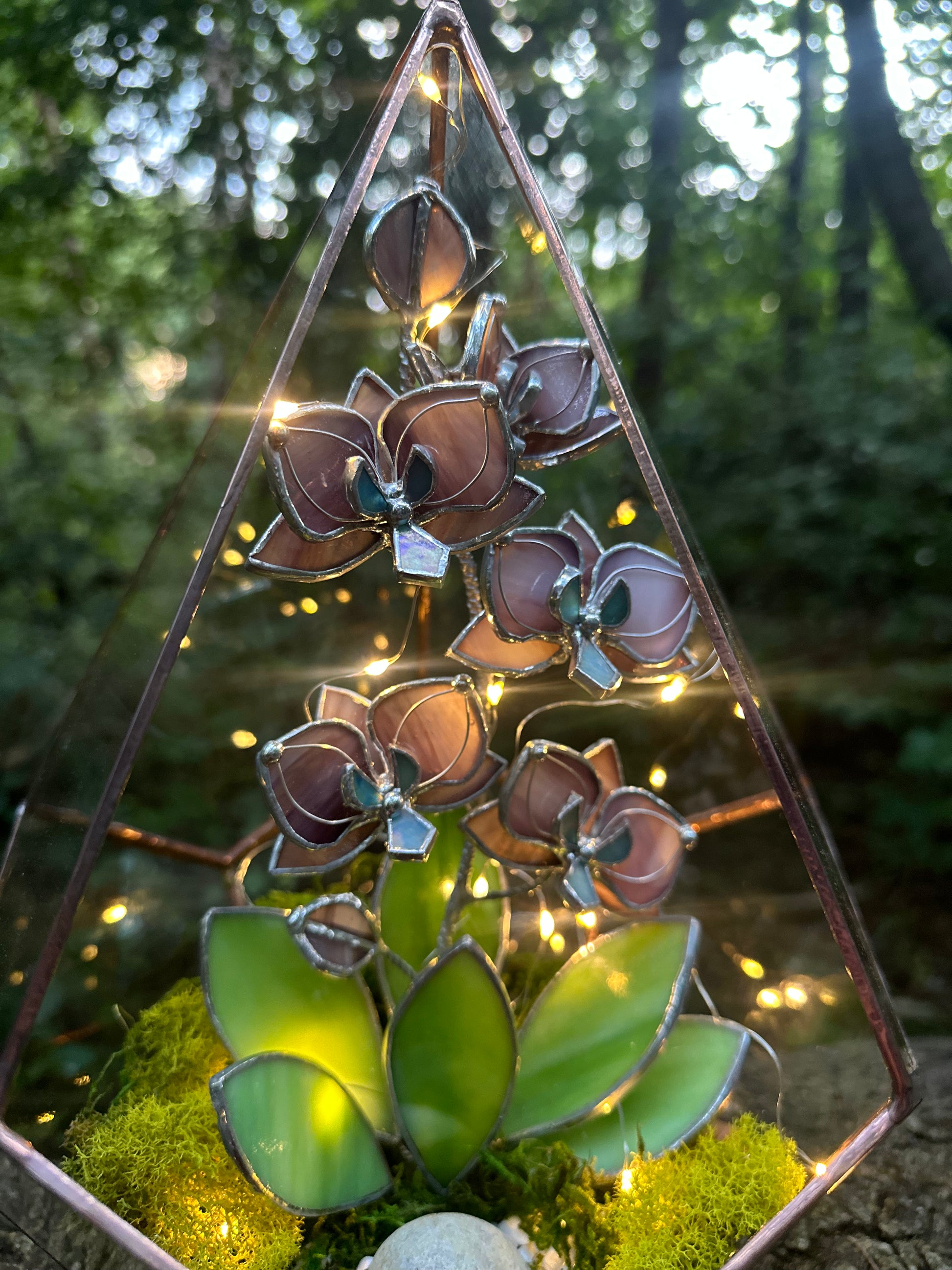 " . CHOOSE COLOR Geometric glass 3D terrarium Teardrop with stained glass orchids. Wedding glass decor, Mother’s Day gift, glass art, suncatcher, succulents, cacti