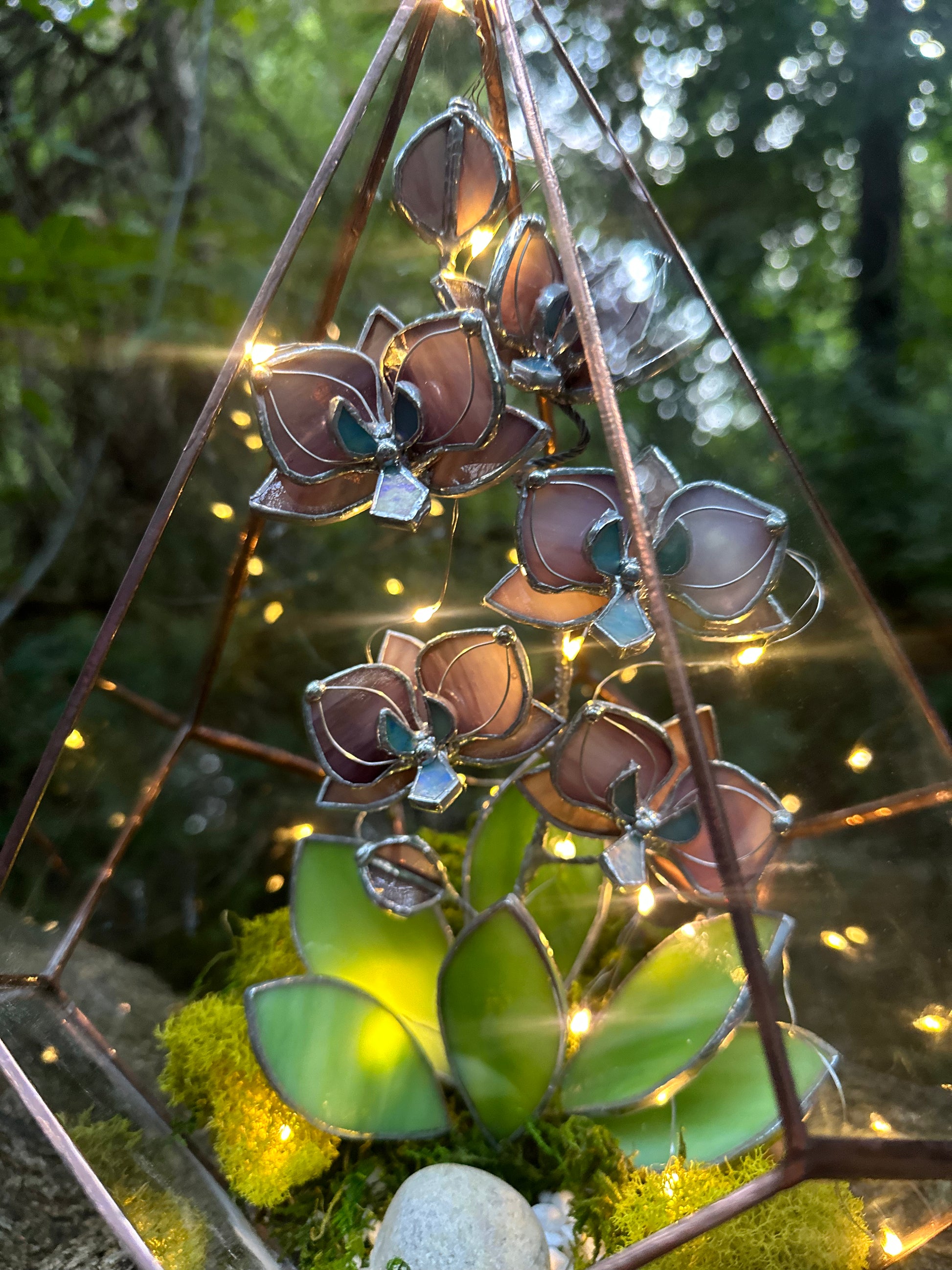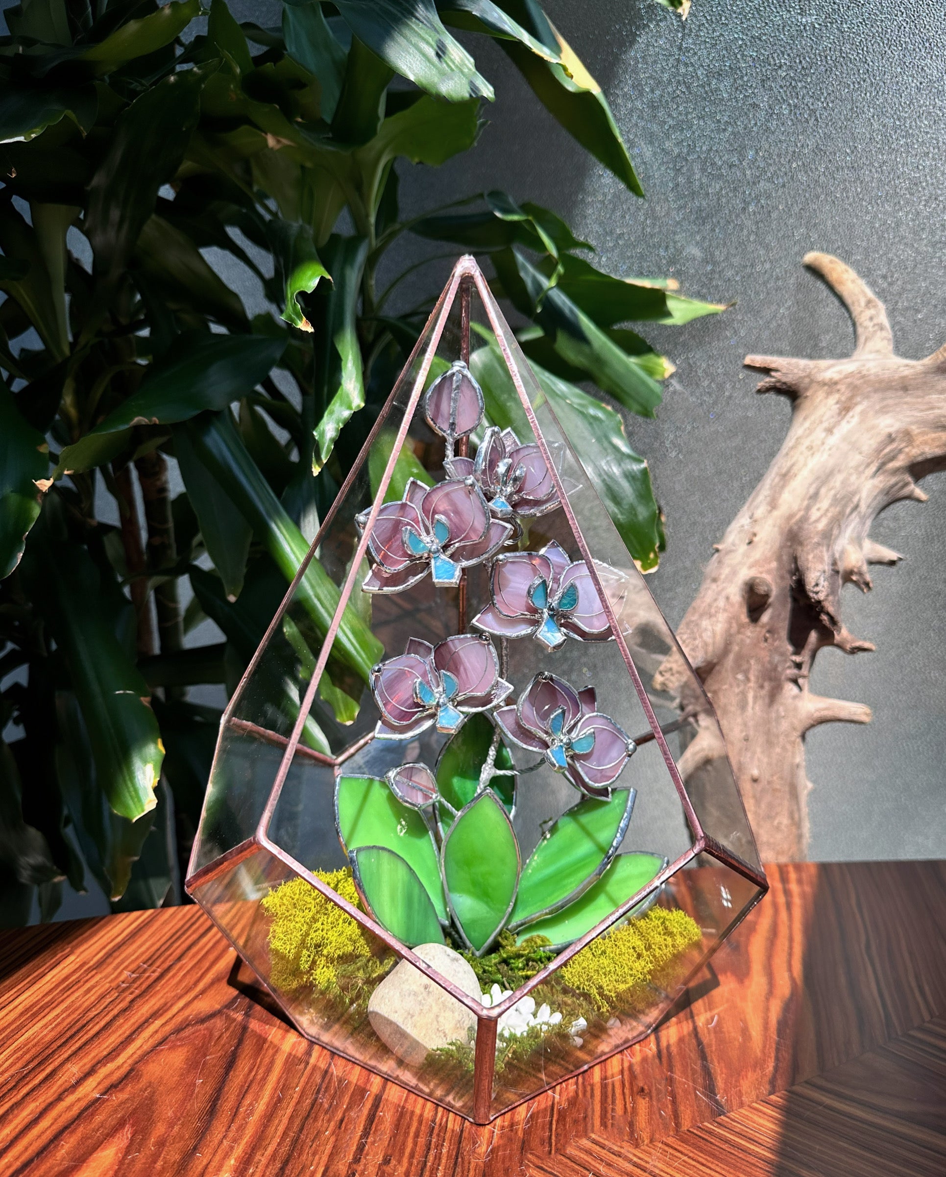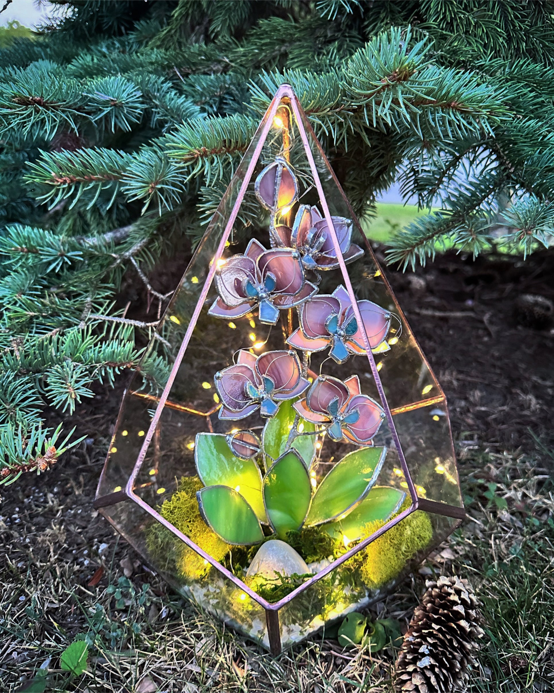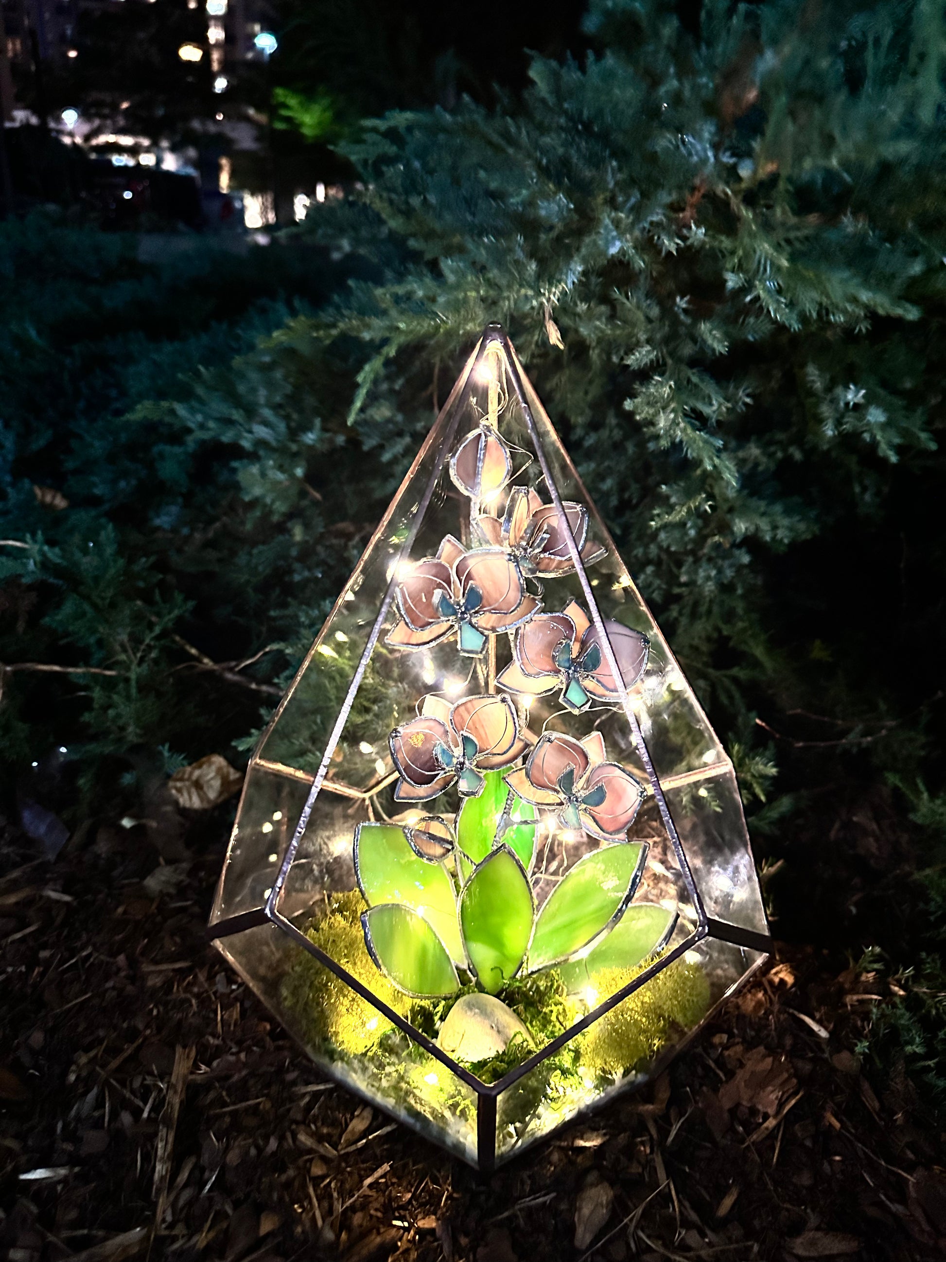 Handcrafted with great skill and love 3D glass terrarium Teardrop with stained glass Orchid made of colourful art glass, soldered using copper foil and art solder with Tiffany technique. Added with lights.