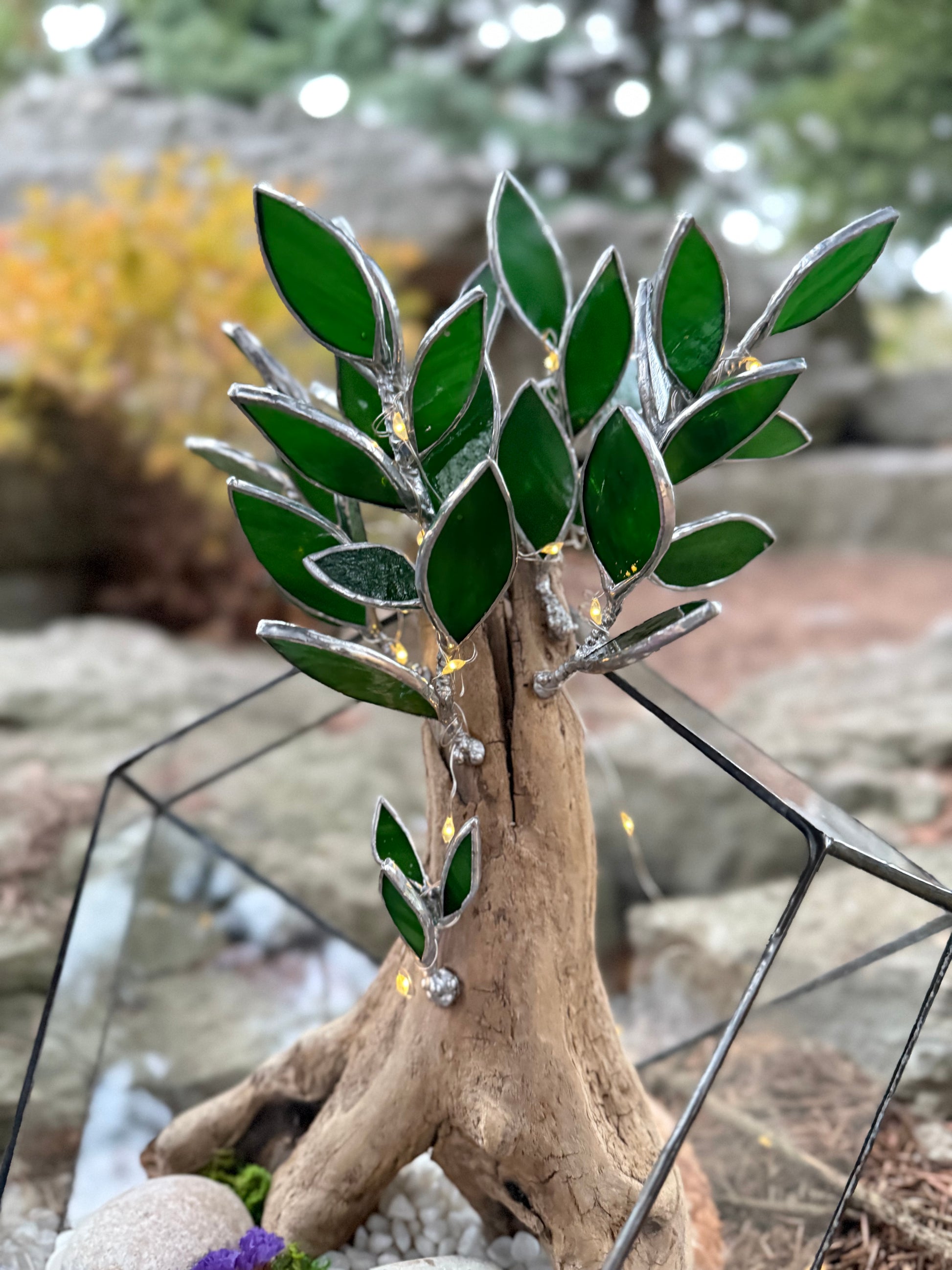 One-of-a-kind, 100% handcrafted geometric glass terrarium with bonsai made of driftwood, glass leaves, metal wire. Complimented with lights. Lights are removable, extra batteries included.