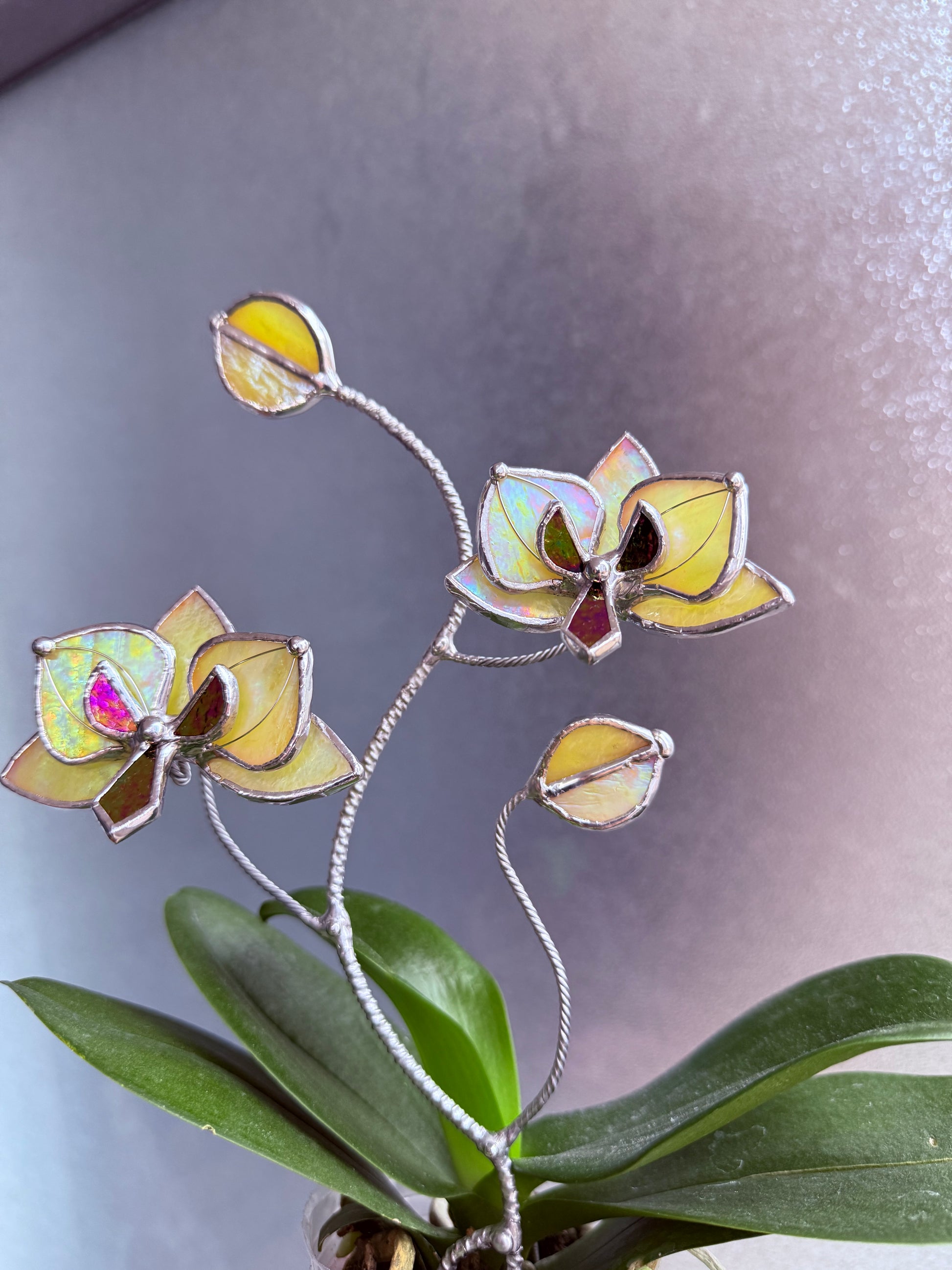 " . Lemon yellow irid Orchid flower stick, Plant stake 2 flowers no pot” Stained glass tropical flower 3D, Sun catcher, Table plant, Garden stick, Outdoor and gardening decor (Copy)