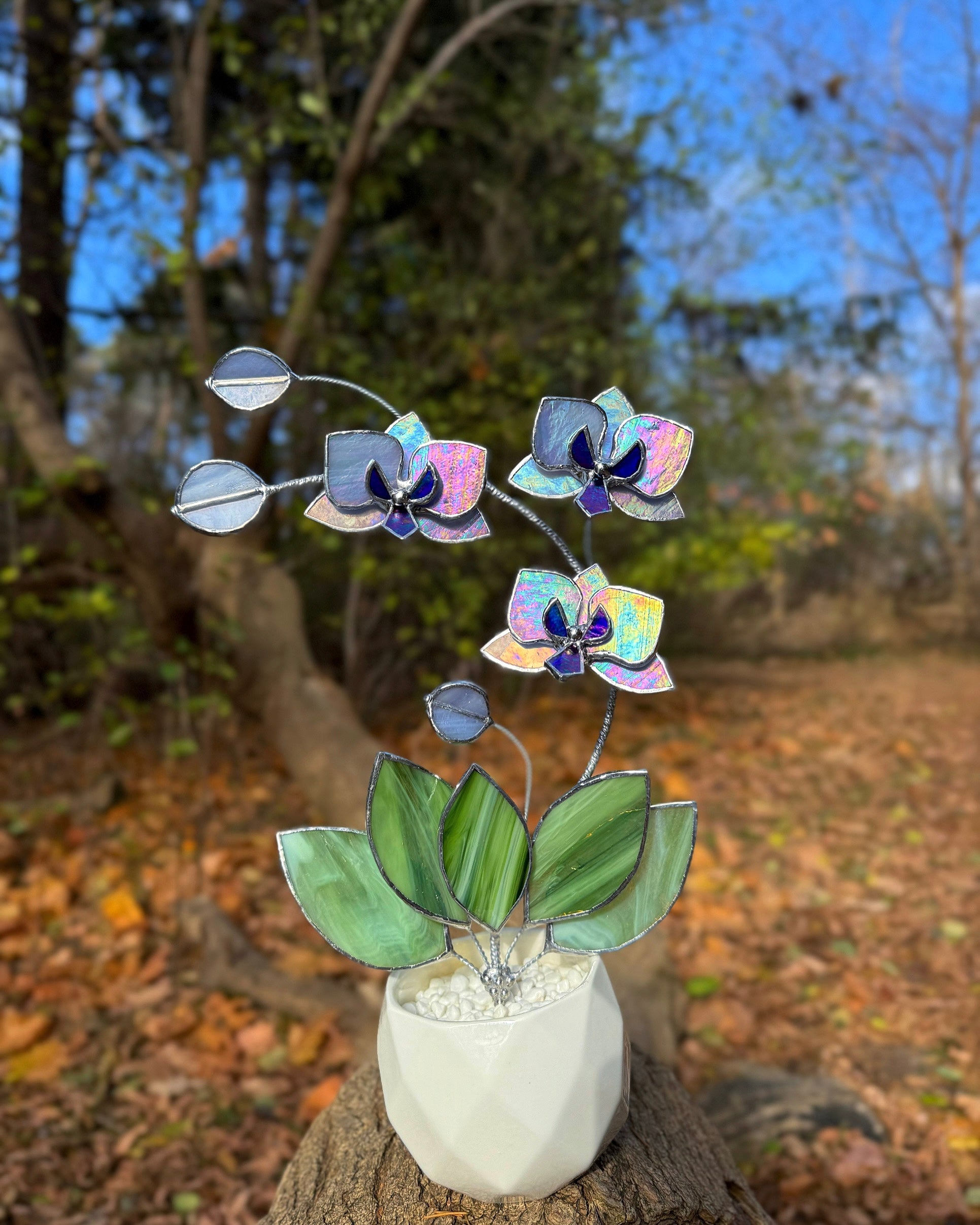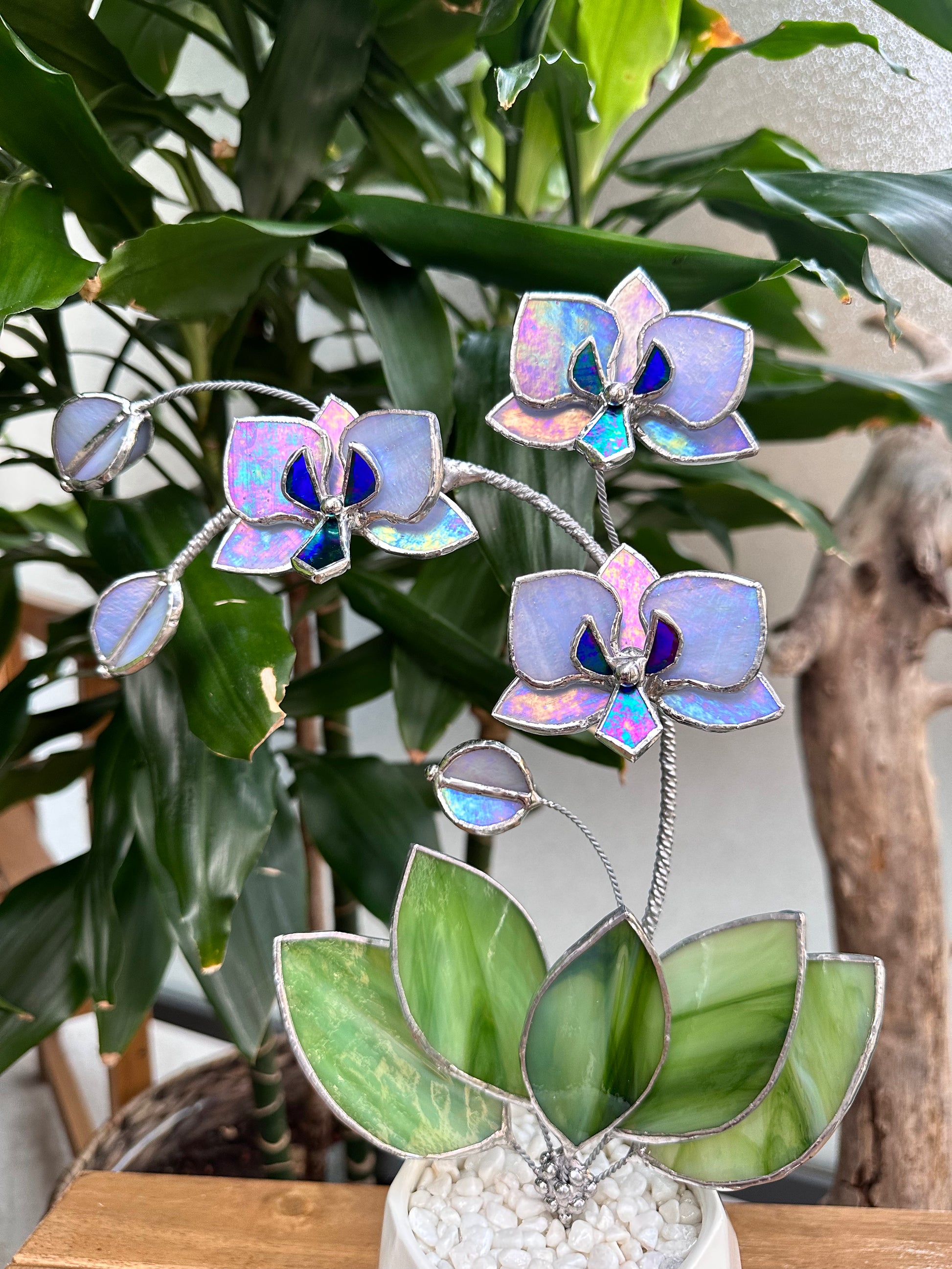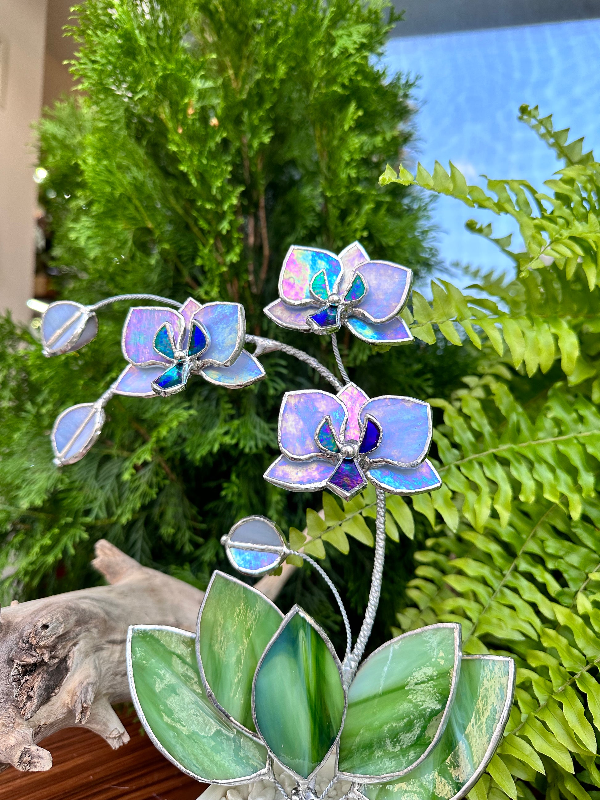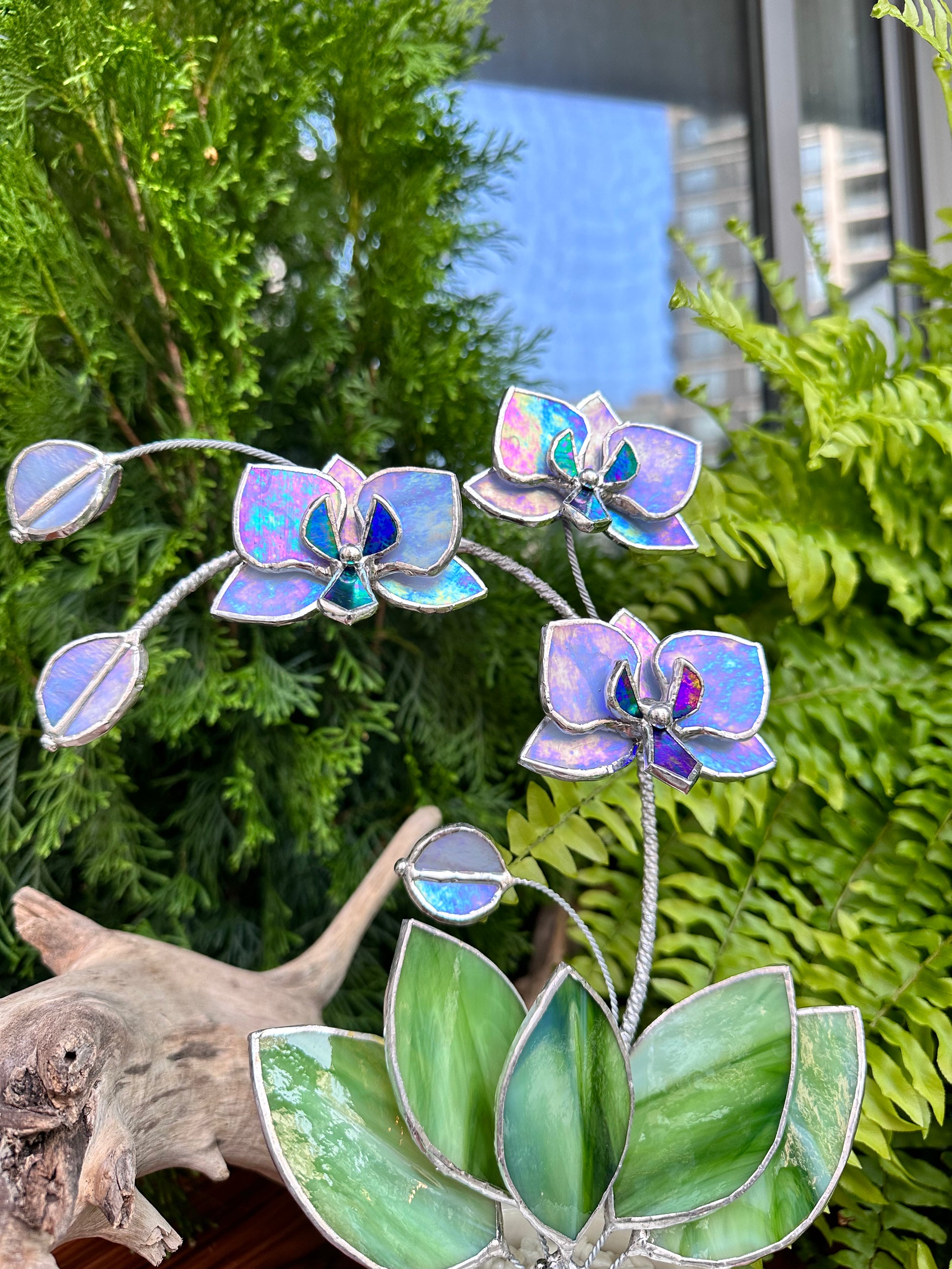 " . Lavender iridescent Orchid 3 flowers with pot” Stained glass tropical flower 3D, Sun catcher, Table plant, Garden stick, Outdoor and gardening decor