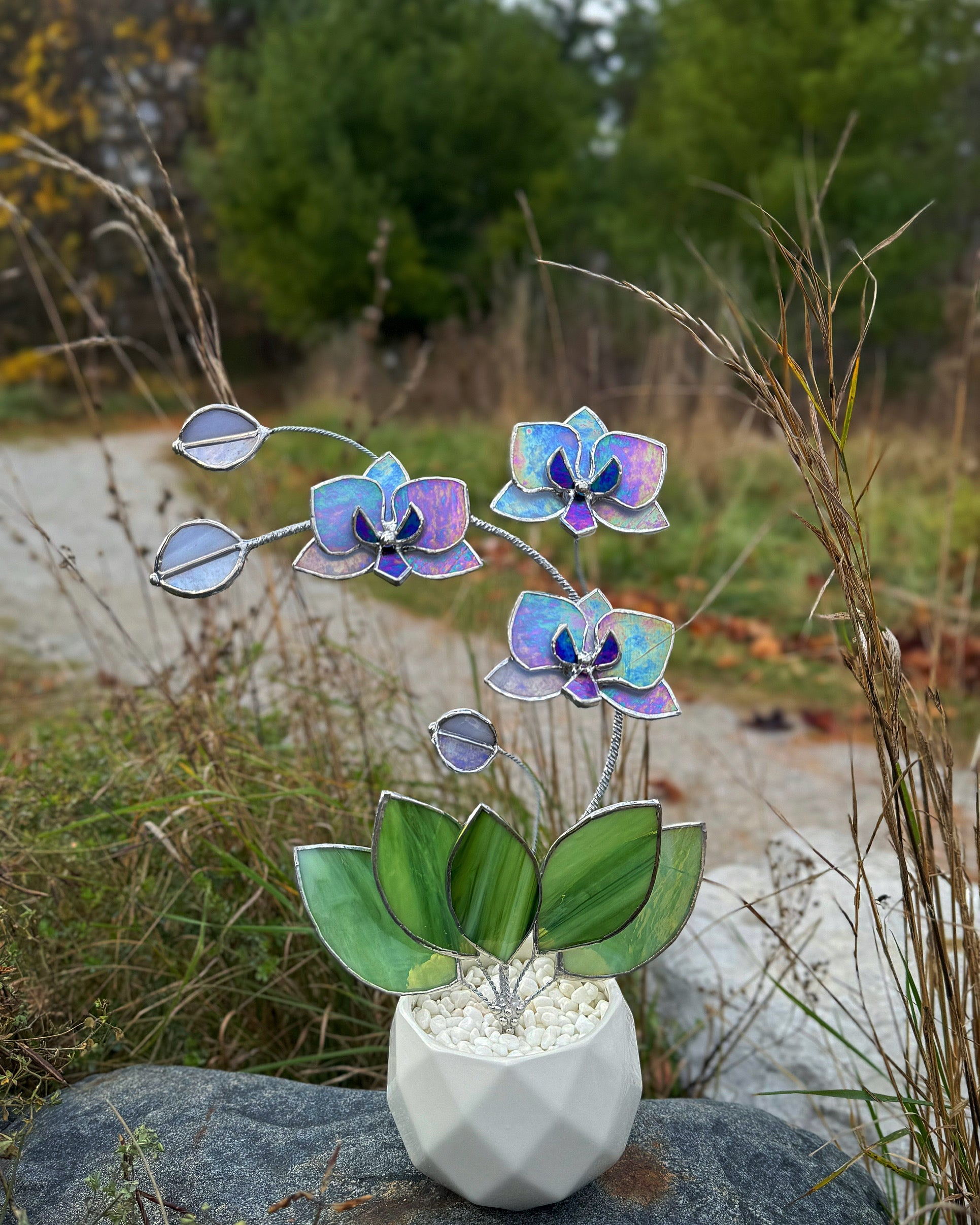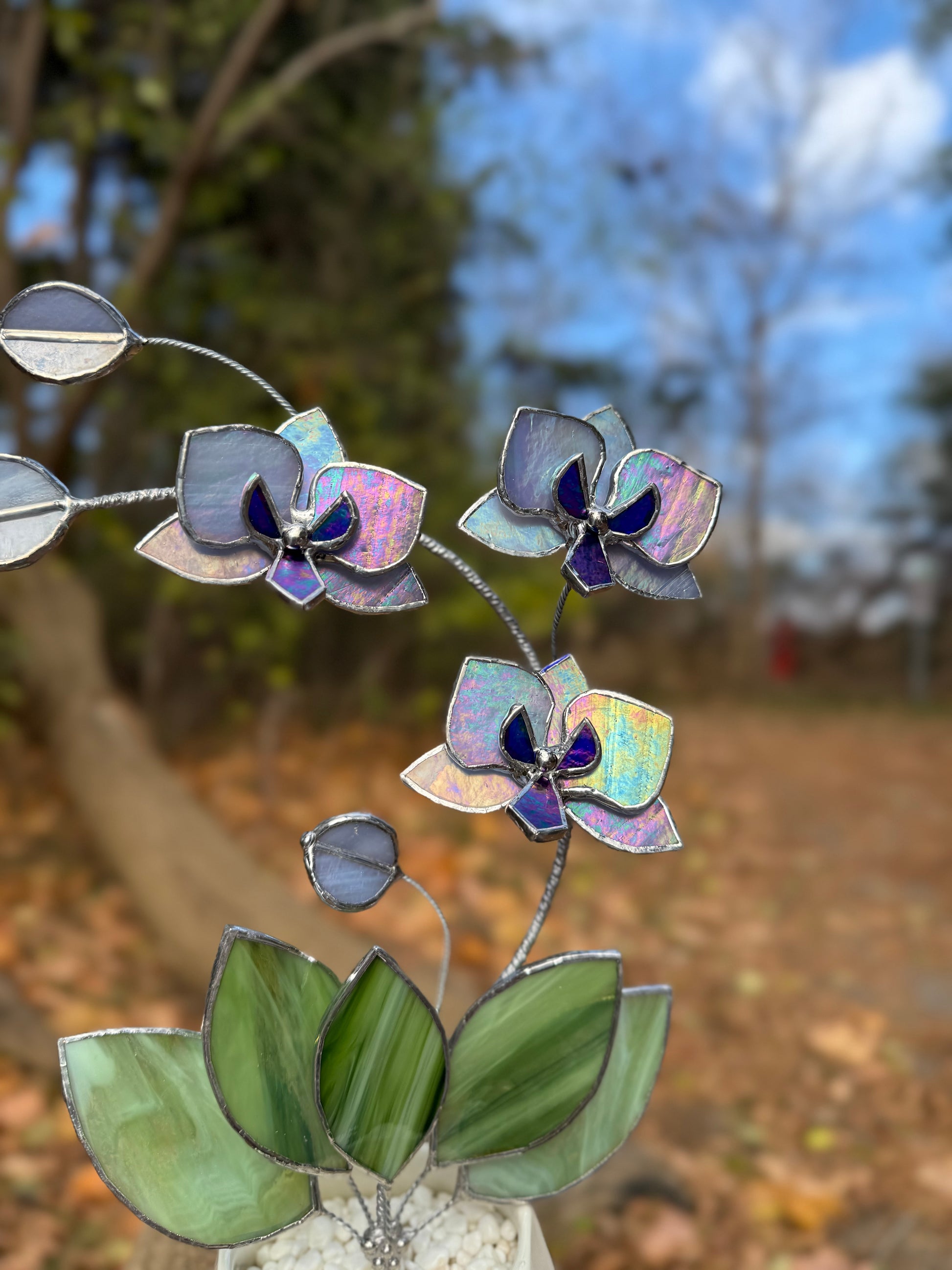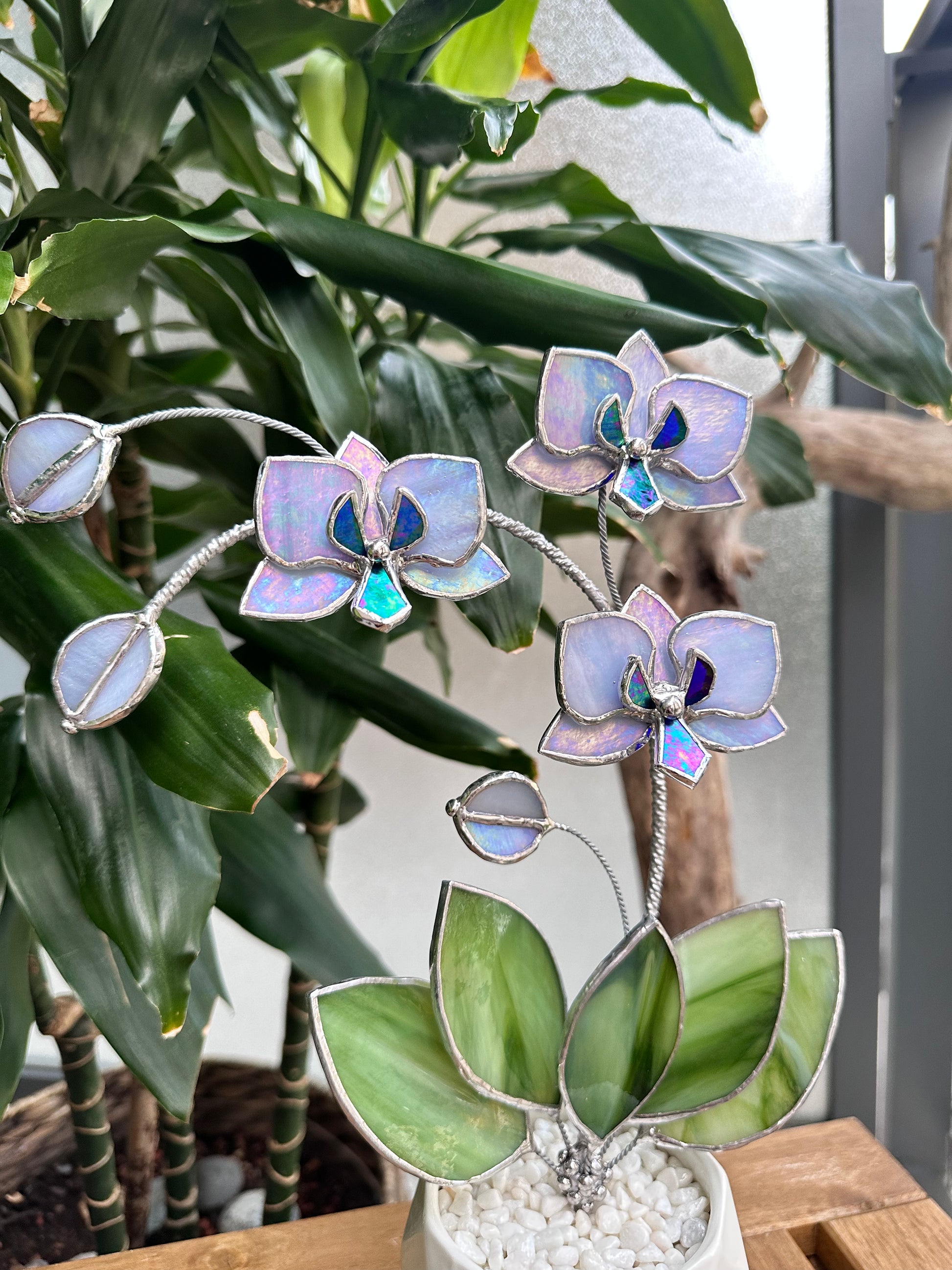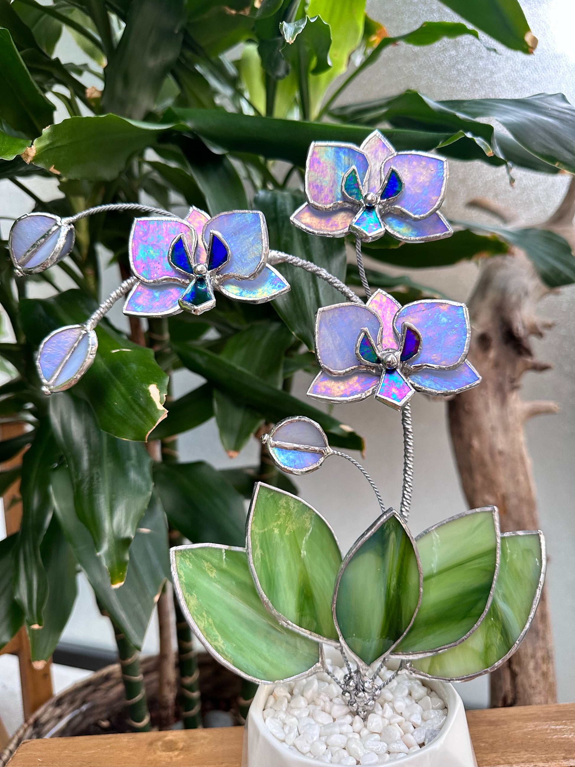 " . Lavender iridescent Orchid 3 flowers with pot” Stained glass tropical flower 3D, Sun catcher, Table plant, Garden stick, Outdoor and gardening decor