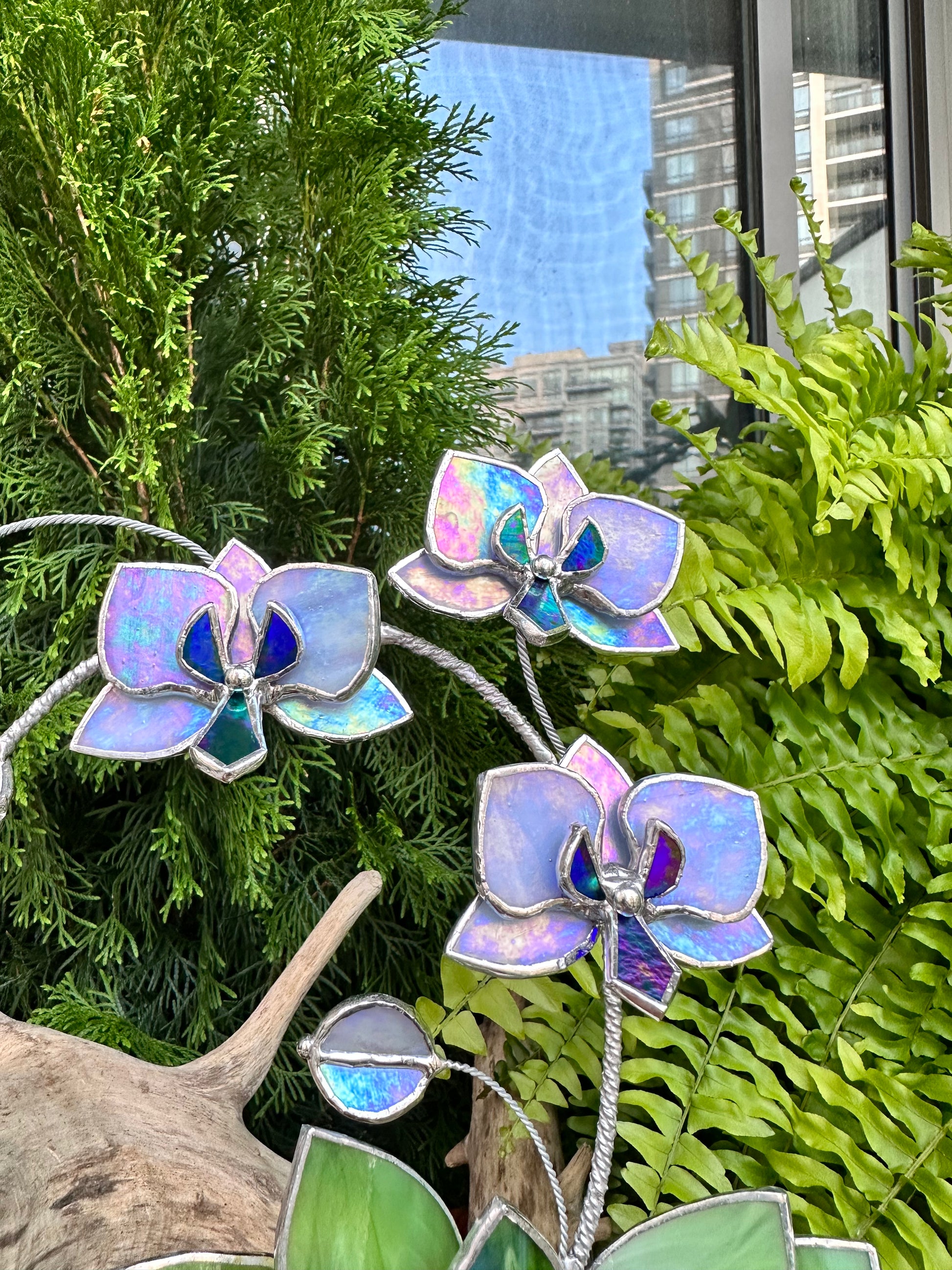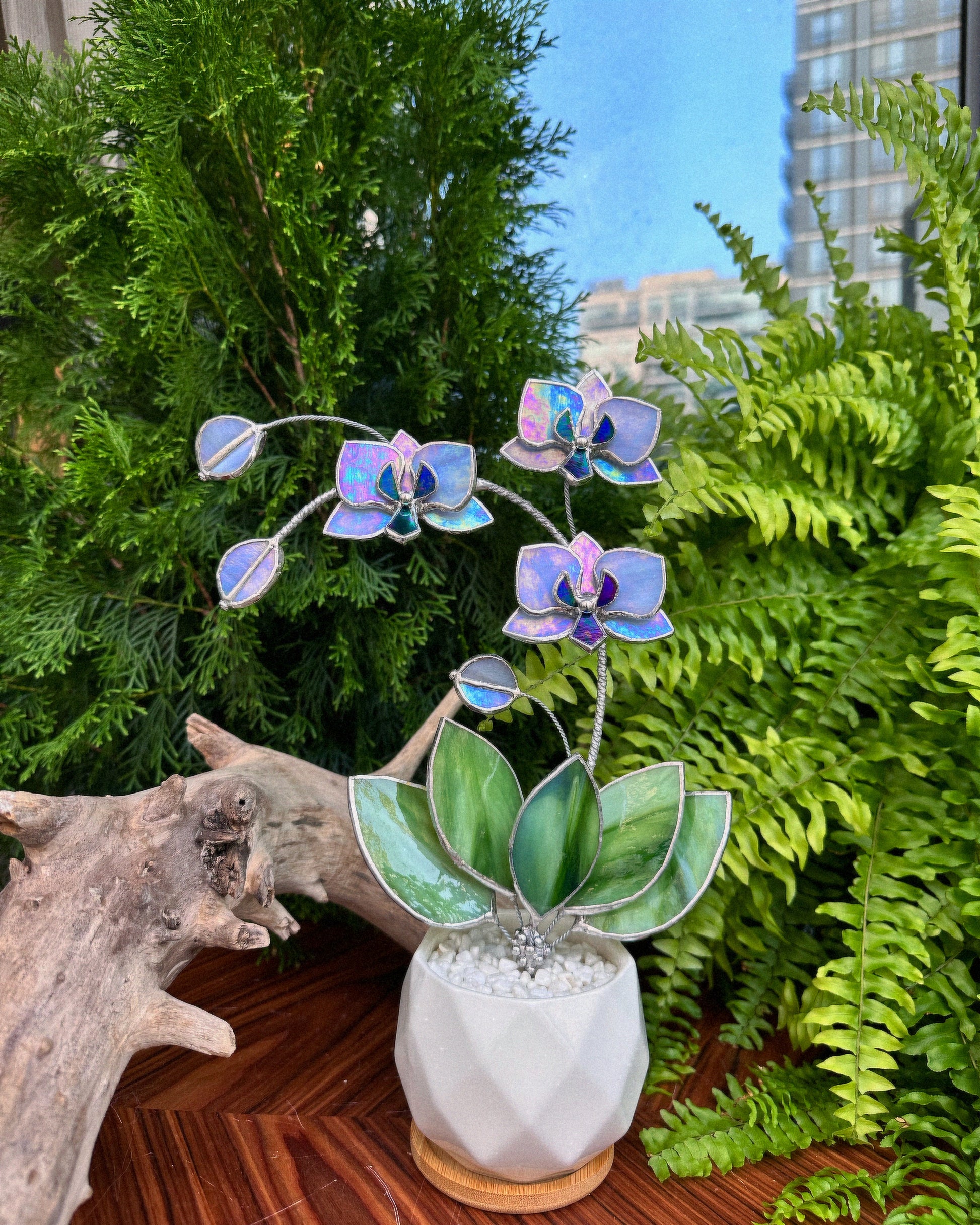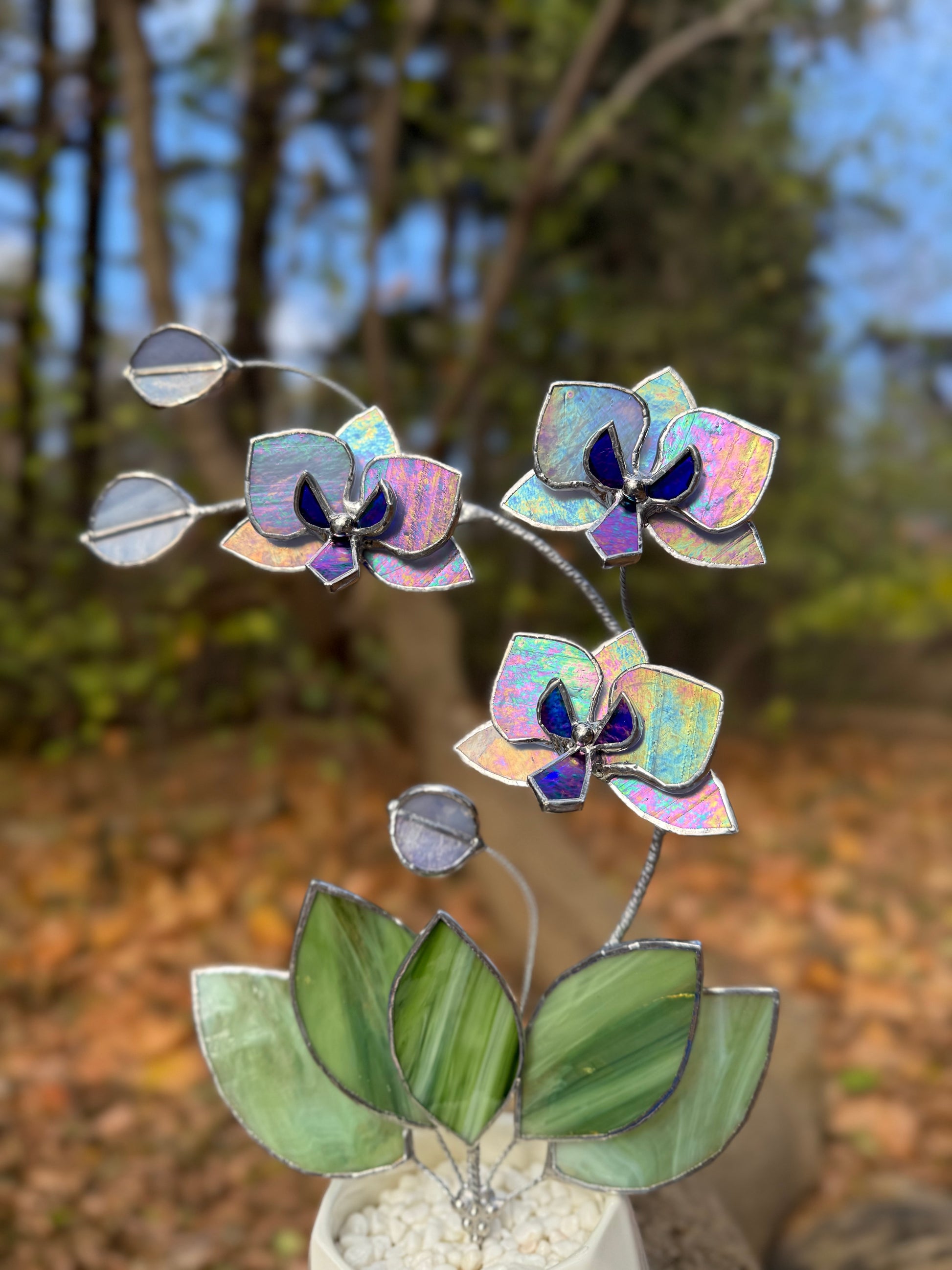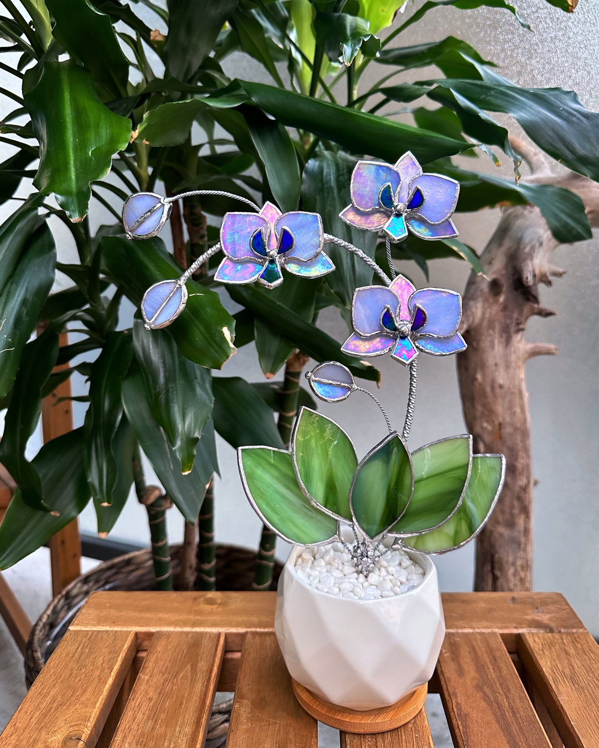 " . Lavender iridescent Orchid 3 flowers with pot” Stained glass tropical flower 3D, Sun catcher, Table plant, Garden stick, Outdoor and gardening decor
