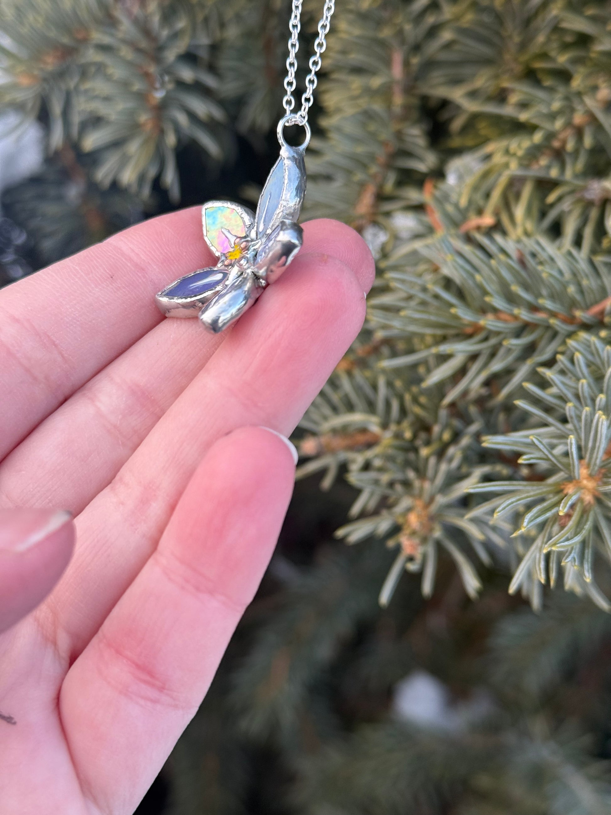 " . Necklace Forget Me Not flower Lavender iridescent Stained glass , Modern art, jewelry