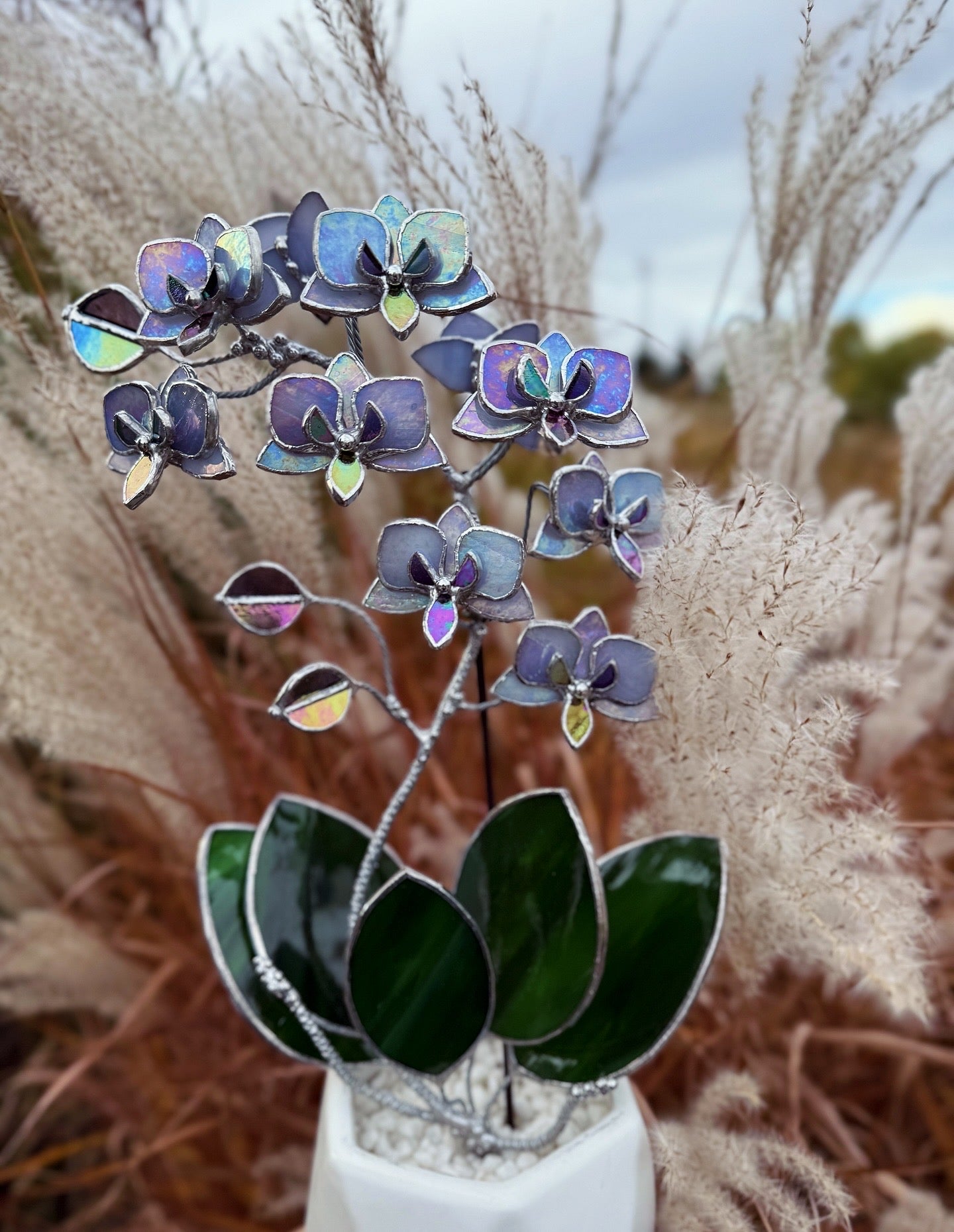 " . Stained glass Orchid Lavender iridescent, double sided, 10 flowers with pot”, Stained glass tropical flower 3D, Suncatcher, Table plant decor