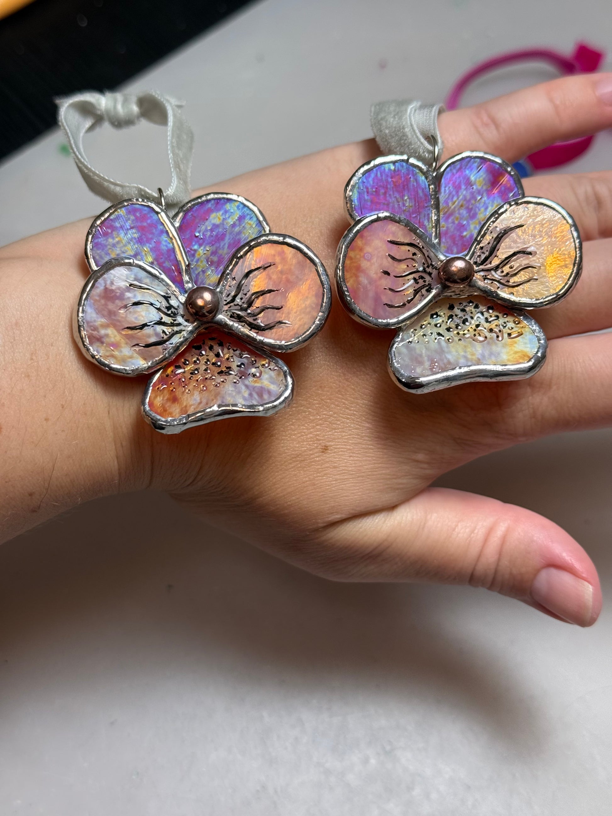 These beautiful 3D stained glass Christmas Pansy flower ornaments will be the perfect decoration for your Christmas tree! It can be a holiday gift for the office, a gift from Secret Santa, or you can buy a set and decorate your home! Handmade stained glass Christmas ornaments are always a great idea - each one is unique and made with great skill and love.