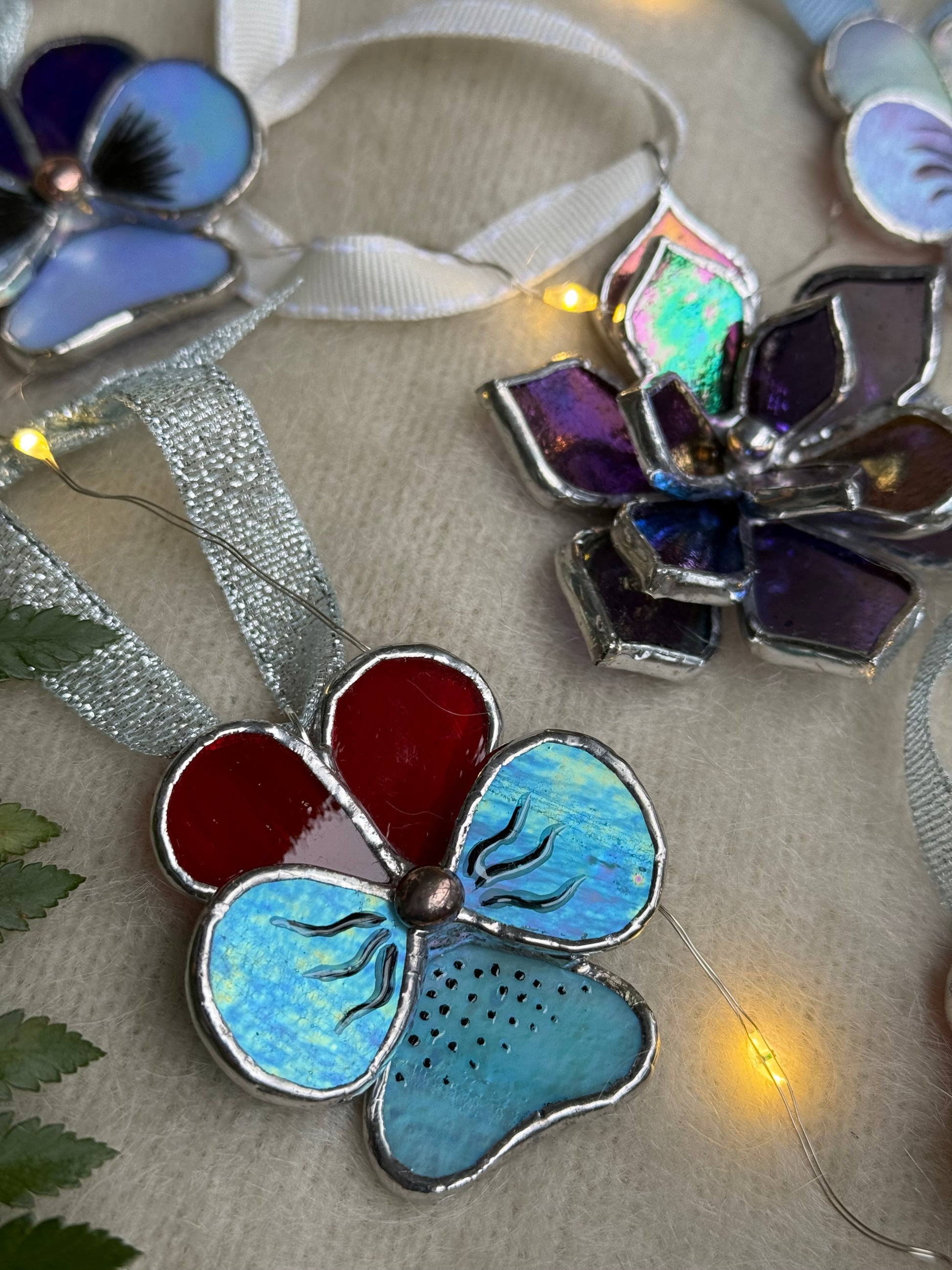 " . Pansy flower Ruby red & Teal irid , Stained glass Decorative ORNAMENT, Christmas decoration, Suncatcher new