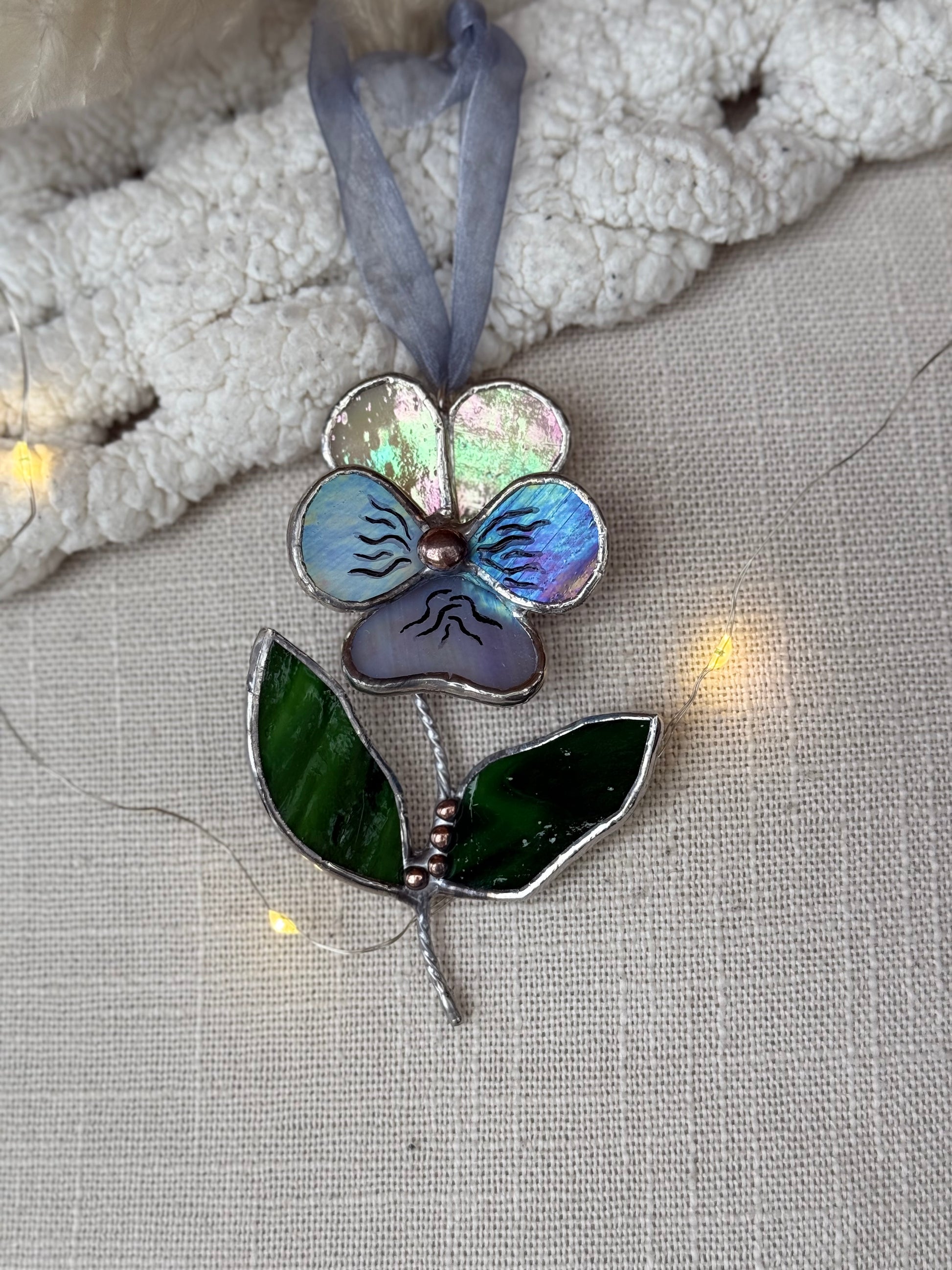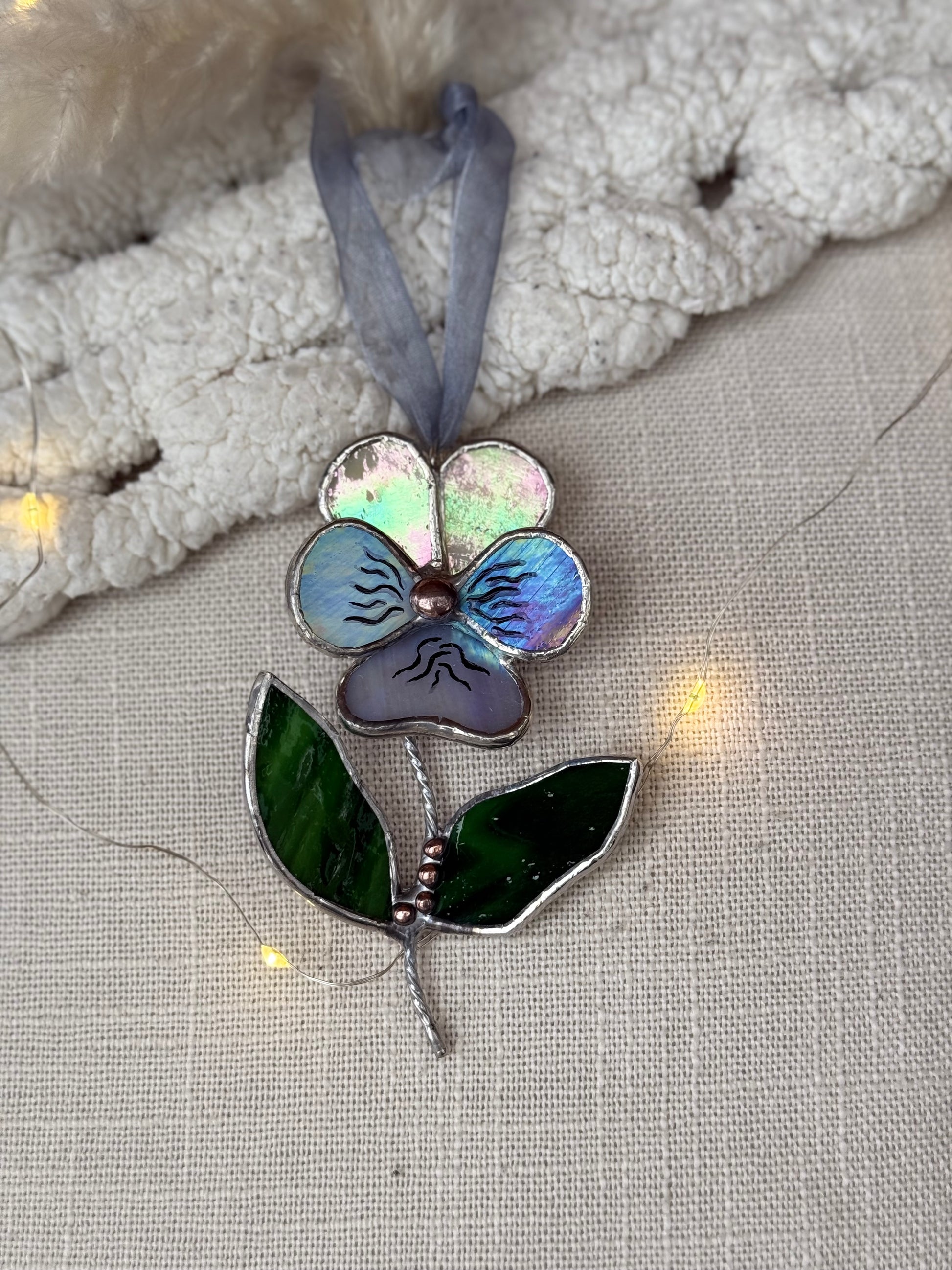 Stained glass ornament Pansy flower with leaves . Ribbon included, ribbon color may vary. Complemented with hand painted acrylic pattern